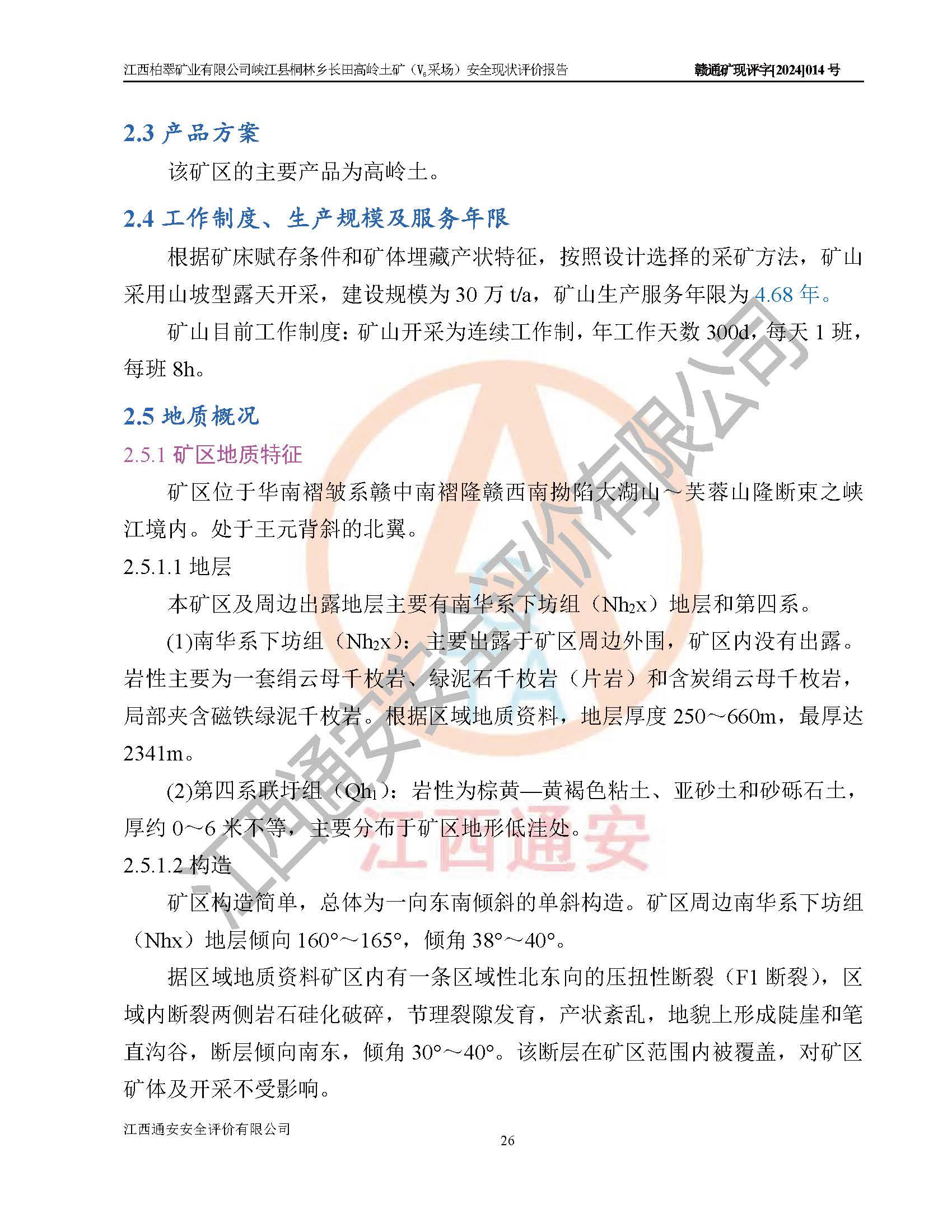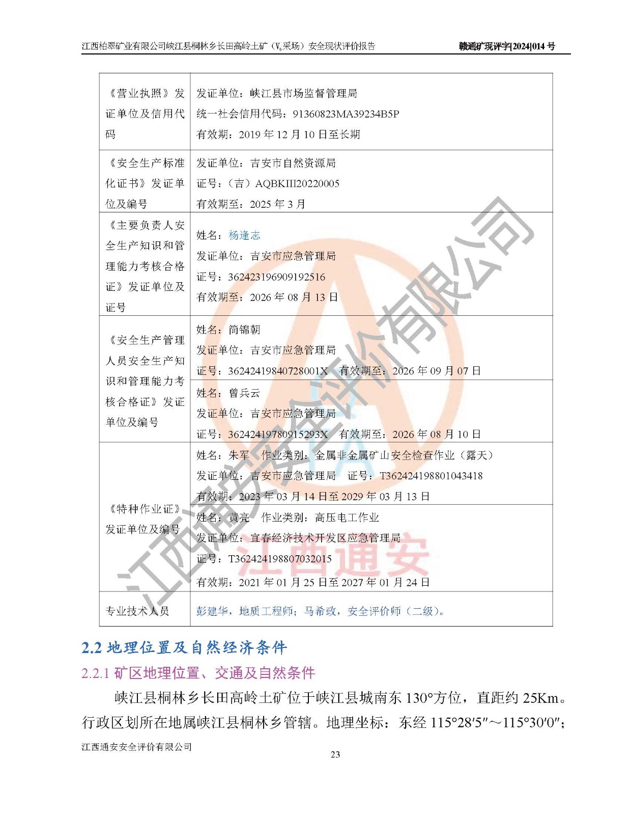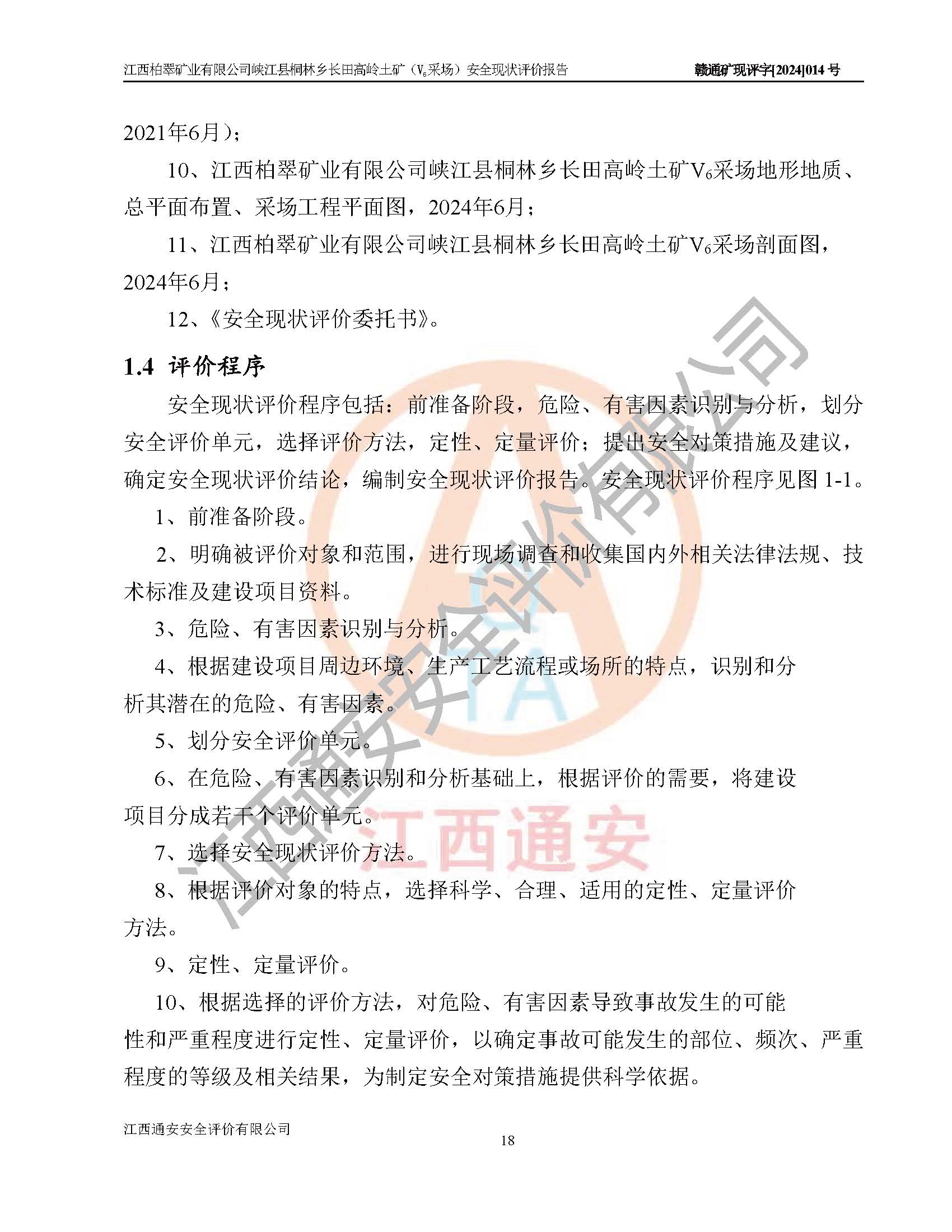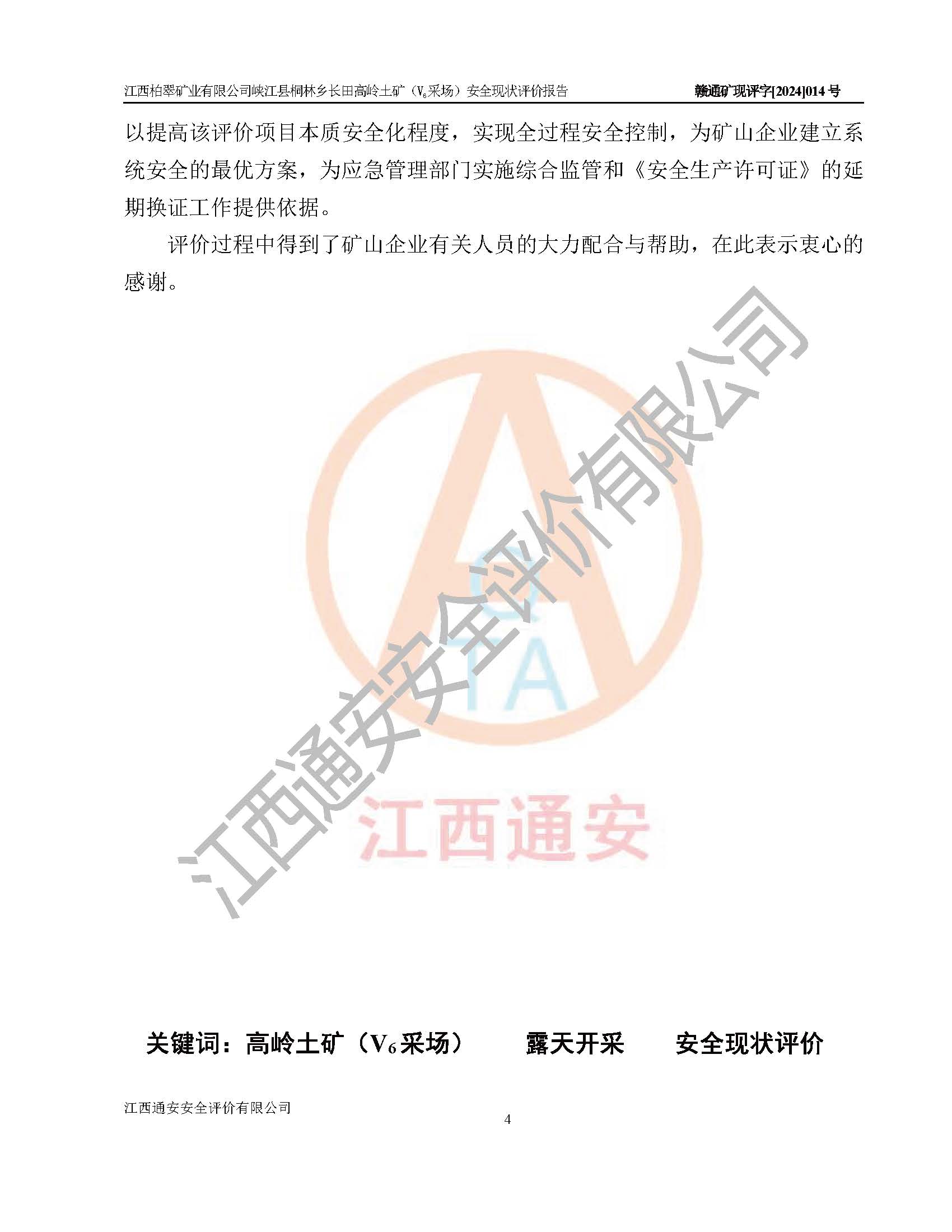 评价报告名称 | 江西柏翠矿业有限公司峡江县桐林乡长田高岭土矿(V6采场)安全现状评价报告 | ||||