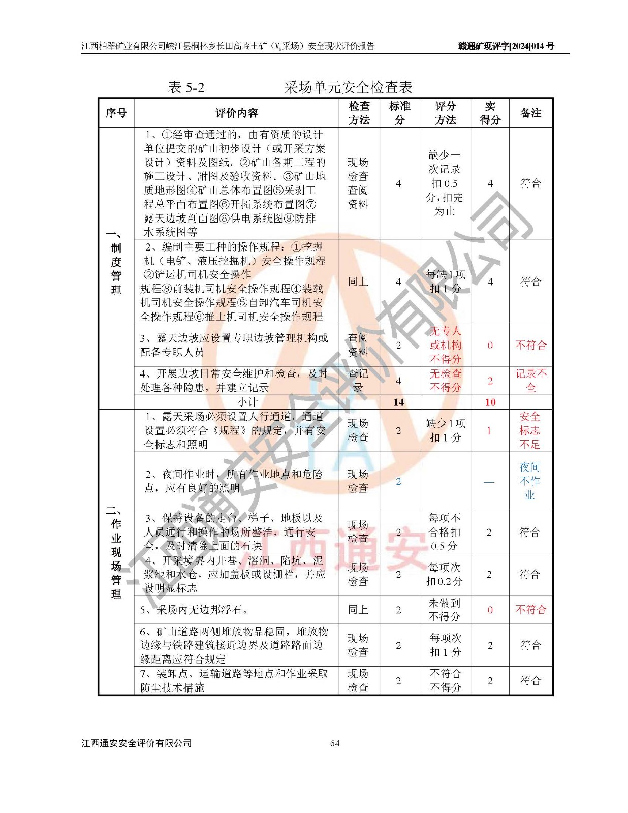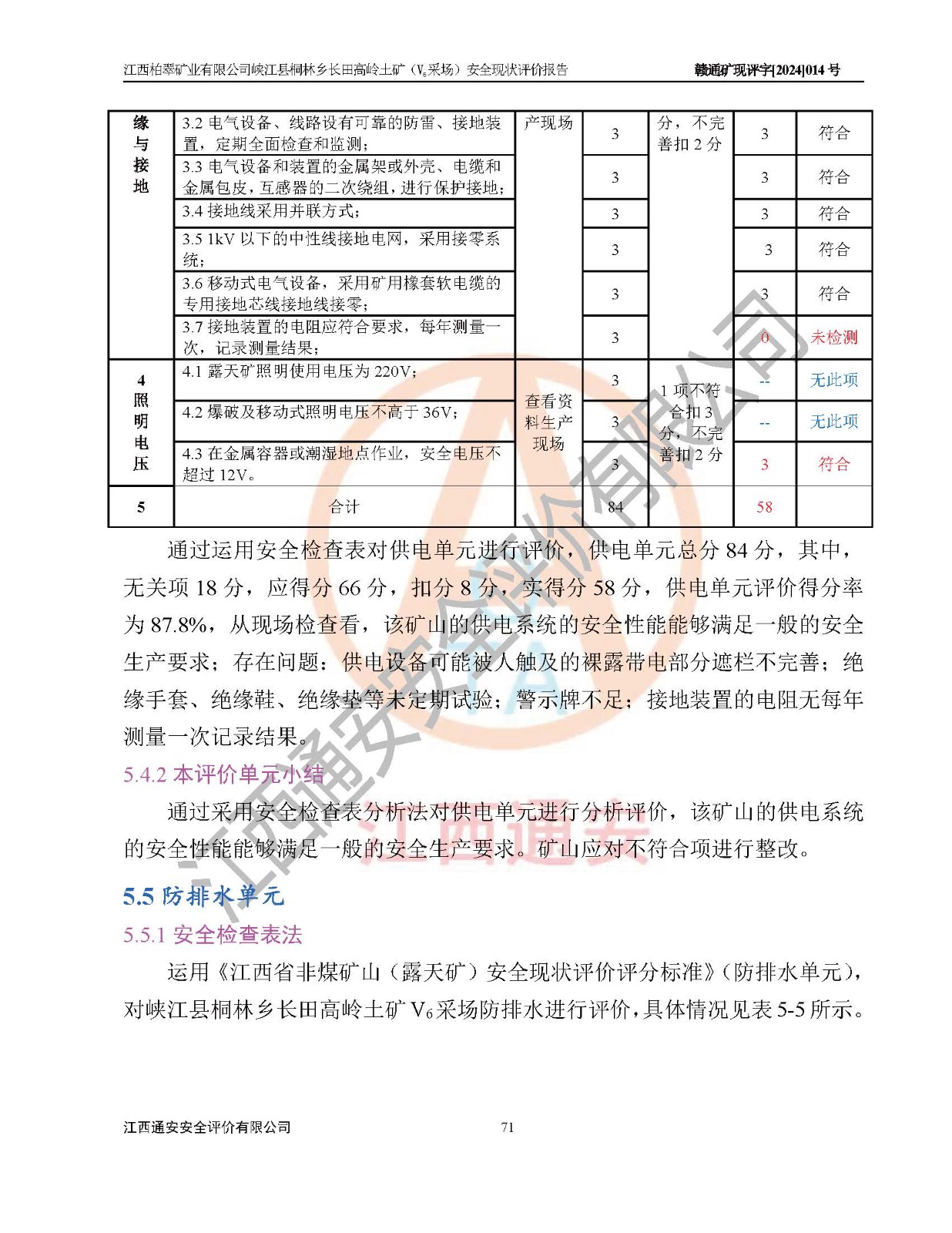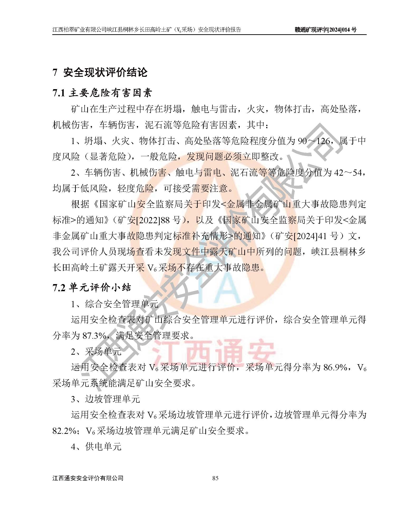 评价结论 | 峡江县桐林乡长田高岭土矿露天开采V6采场设备、设施和场所符合**安全生产有关法律、法规、标准及规范的要求。矿山采用露天开采、公路开拓、汽车运输方式,安全生产条件一般,能满足基本的安全生产活动;安全管理能满足法规要求,V6采场露天开采符合**规定的安全生产条件。