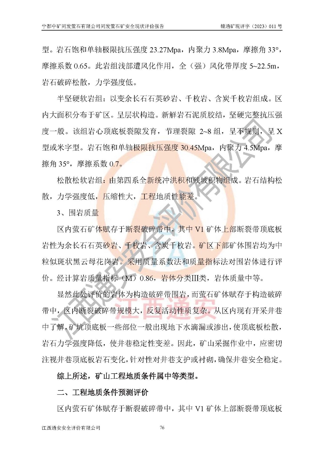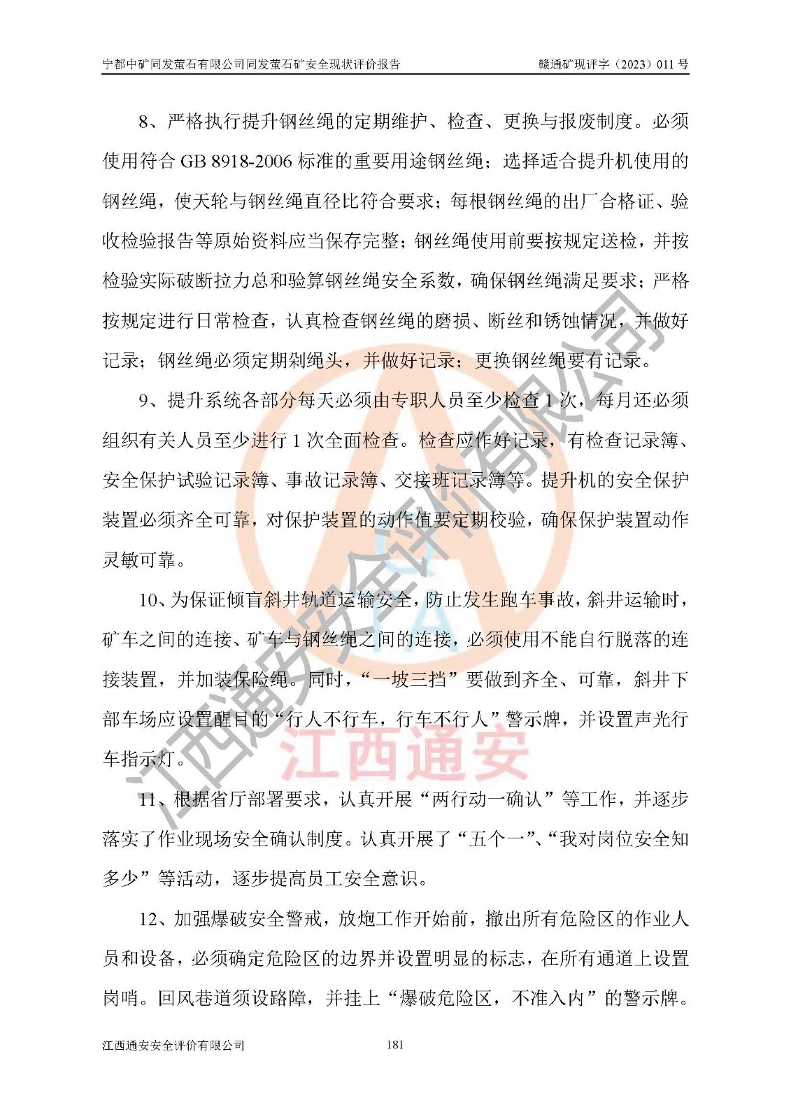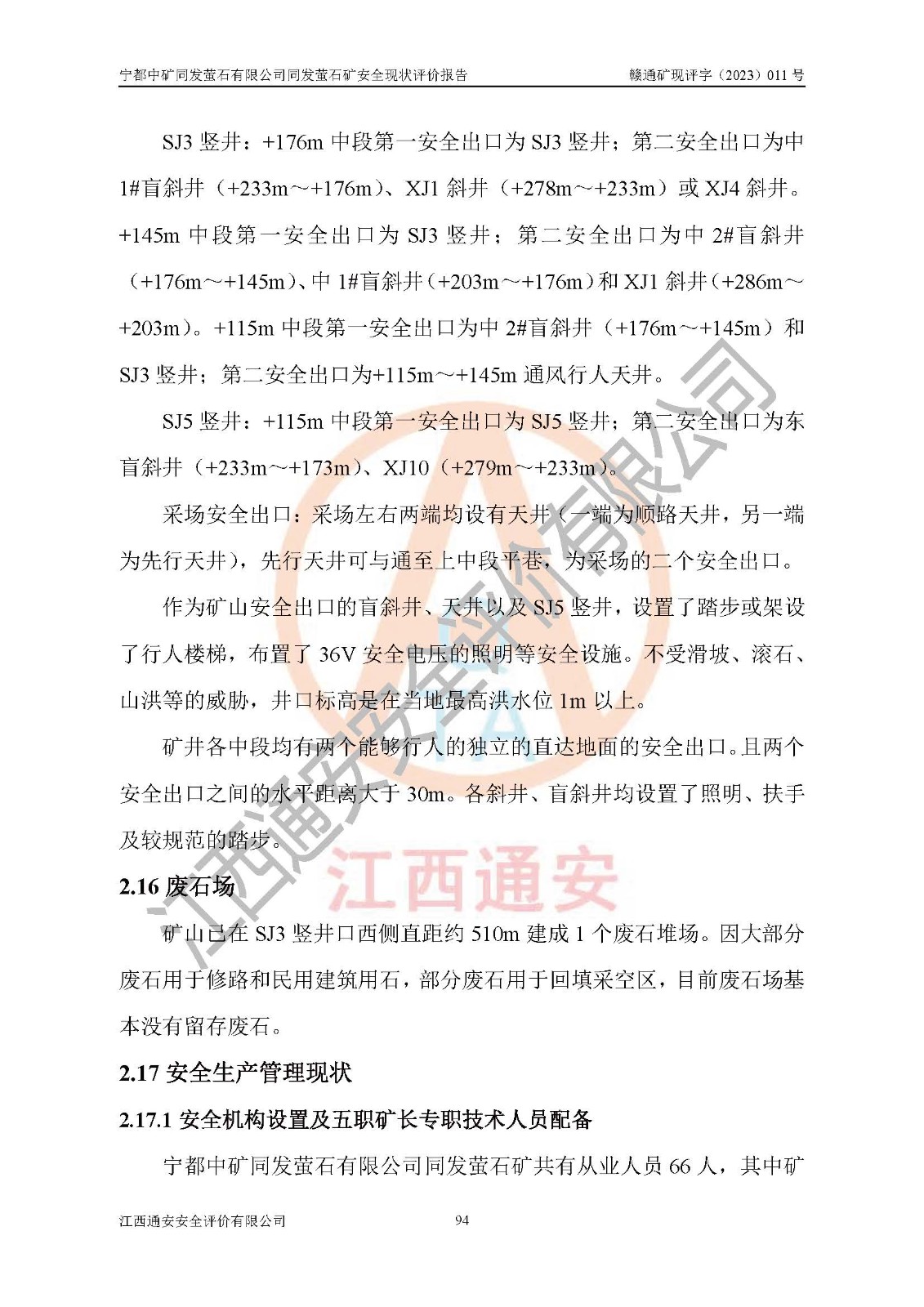 其它 | 宁都中矿同发萤石有限公司同发萤石矿的主要生产及辅助系统:提升运输、排水、供配电、通风、供风、采掘、安全避险“六大系统”等基本符合法律法规要求和规程、规范要求;各种危险有害因素及不可接受的风险在运行中认真落实行之**的技术措施或管理措施,严格按规程,按要求加强管理,可以避免和控制各类事故,**安全生产。现阶段矿山设备、设施和场所符合**安全生产有关法律、法规、标准及规范的规定。矿山采用竖井+斜井联合开拓方式,安全生产条件一般;安全管理能满足法规要求,矿山地下开采符合**规定的安全生产条件。 | ||||