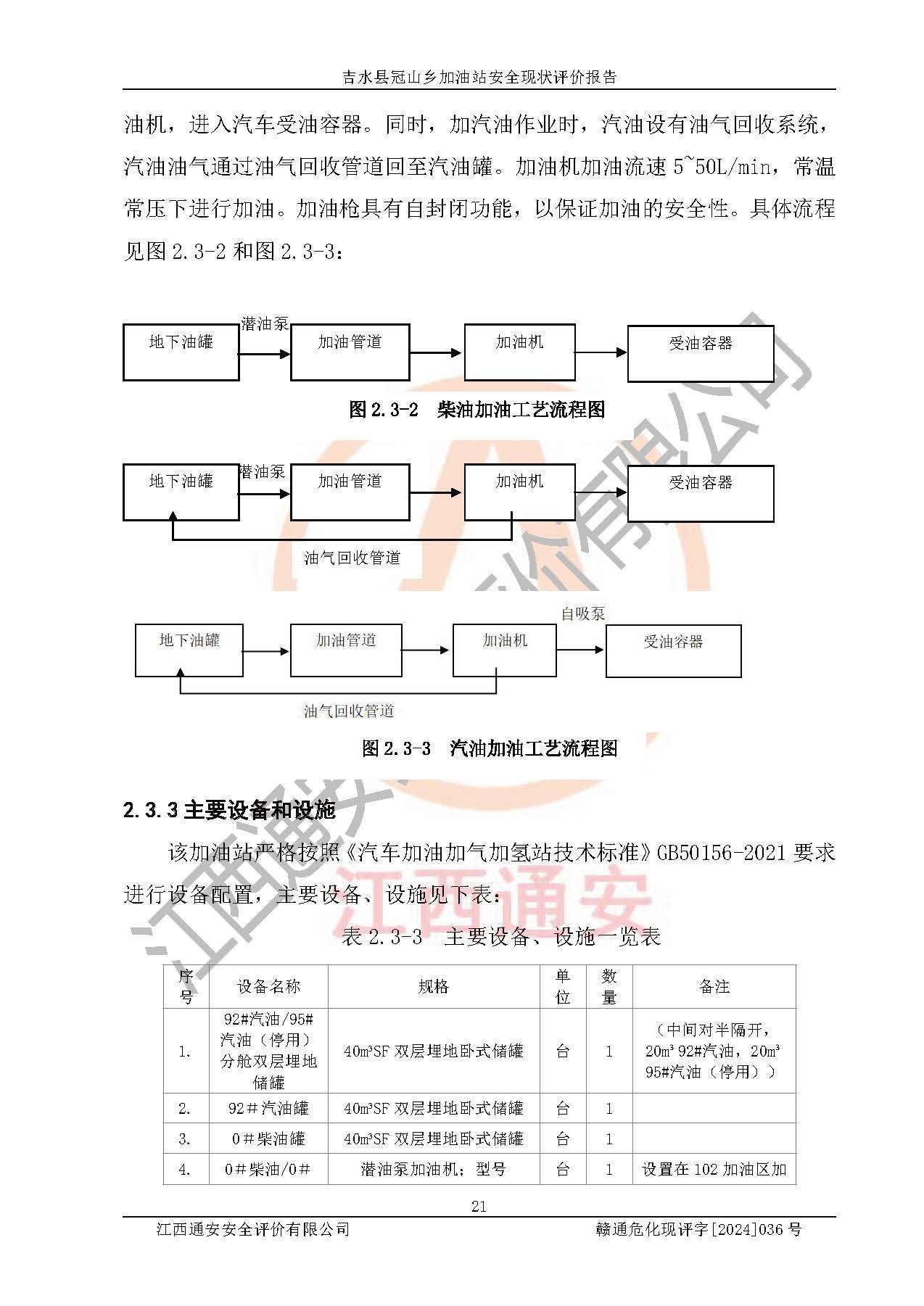 吉水县冠山乡加油站占地面积920㎡,加油站中设有1台0#柴油/0#柴油双枪加油机、1台92#汽油/92#汽油双枪加油机、1台95#汽油(停用)/92#汽油双枪加油机;1台40m³92#汽油双层埋地储罐、1台40m³0#柴油双层埋地储罐、1台40m³92#汽油/95#汽油(停用)分舱双层埋地储罐(中间对半隔开,20m³92#汽油,20m³95#汽油(停用)),油品*大储存能力为80m³(柴油罐容积折半计入油罐总容积),属三级加油站,汽油卸油、加油设置了油气回收系统。