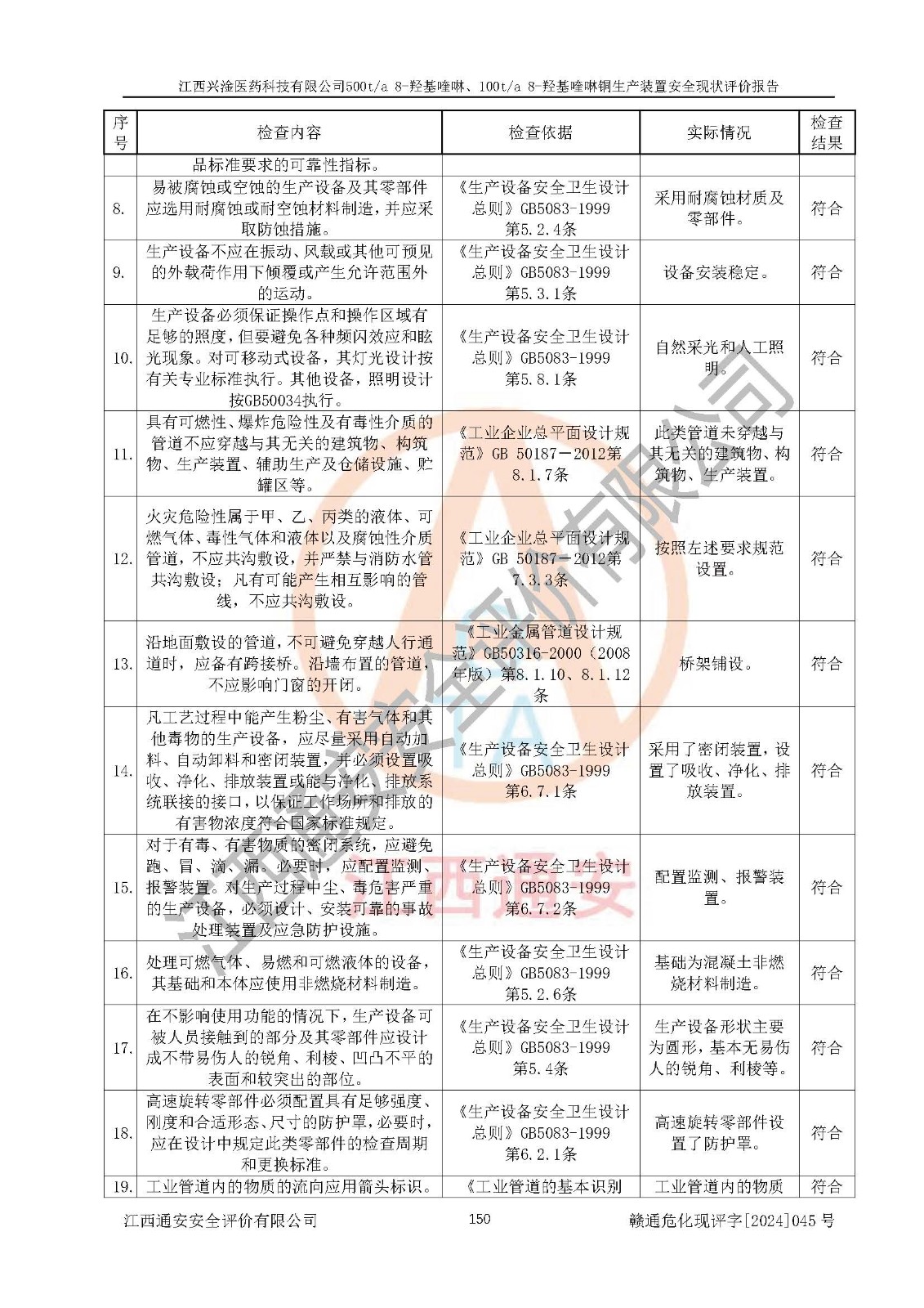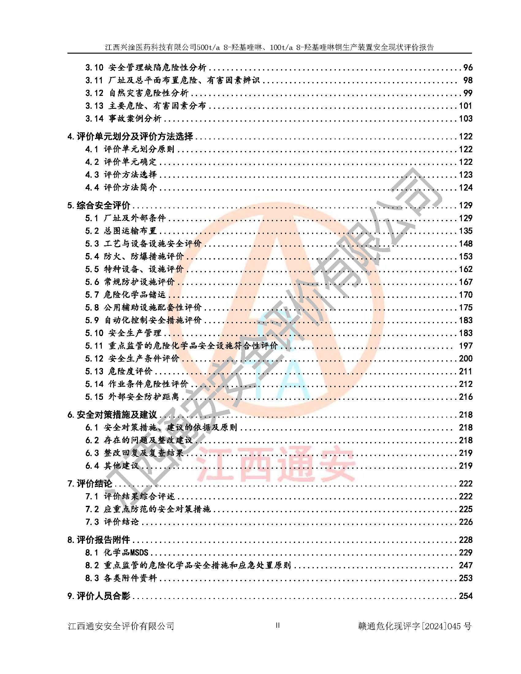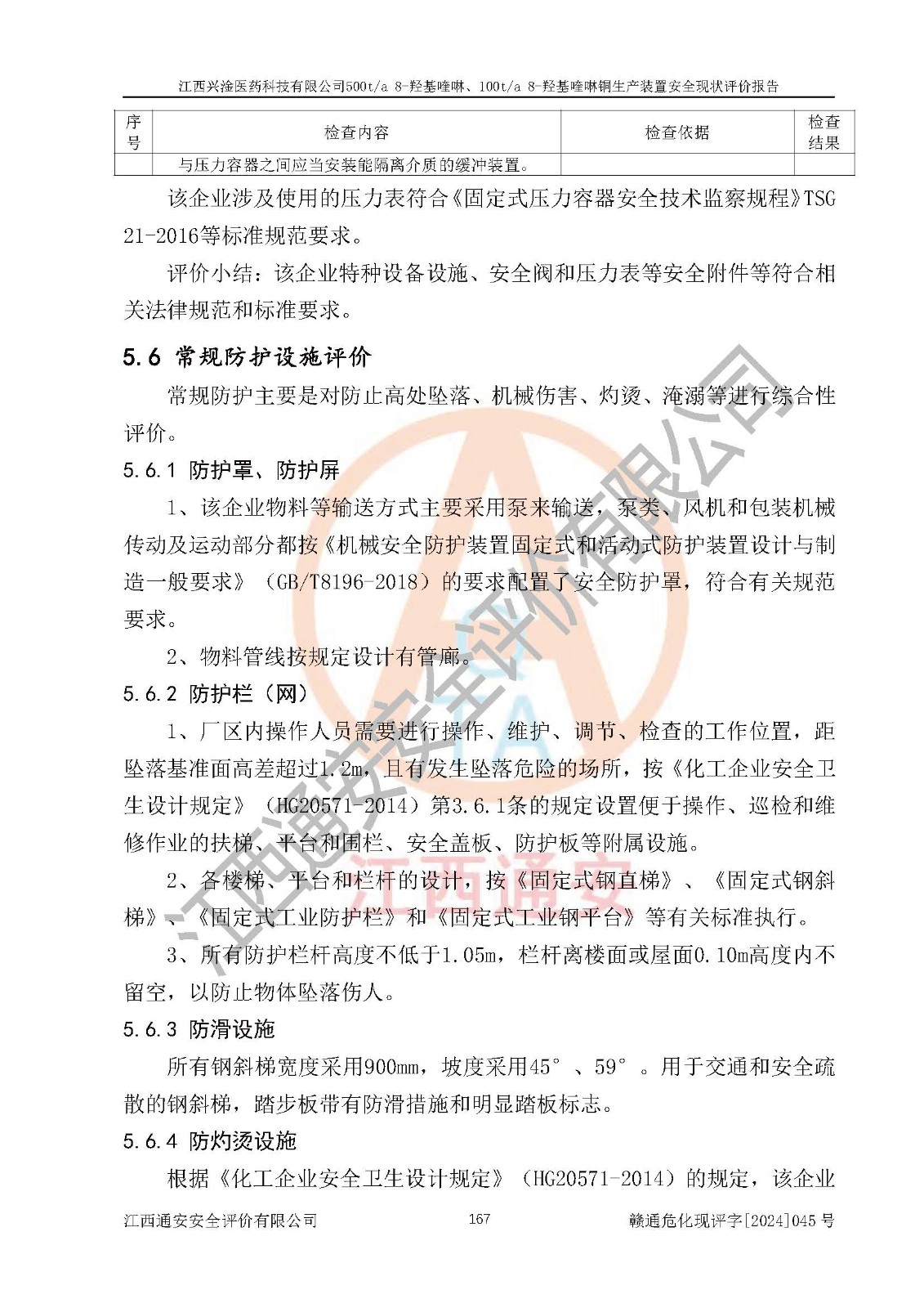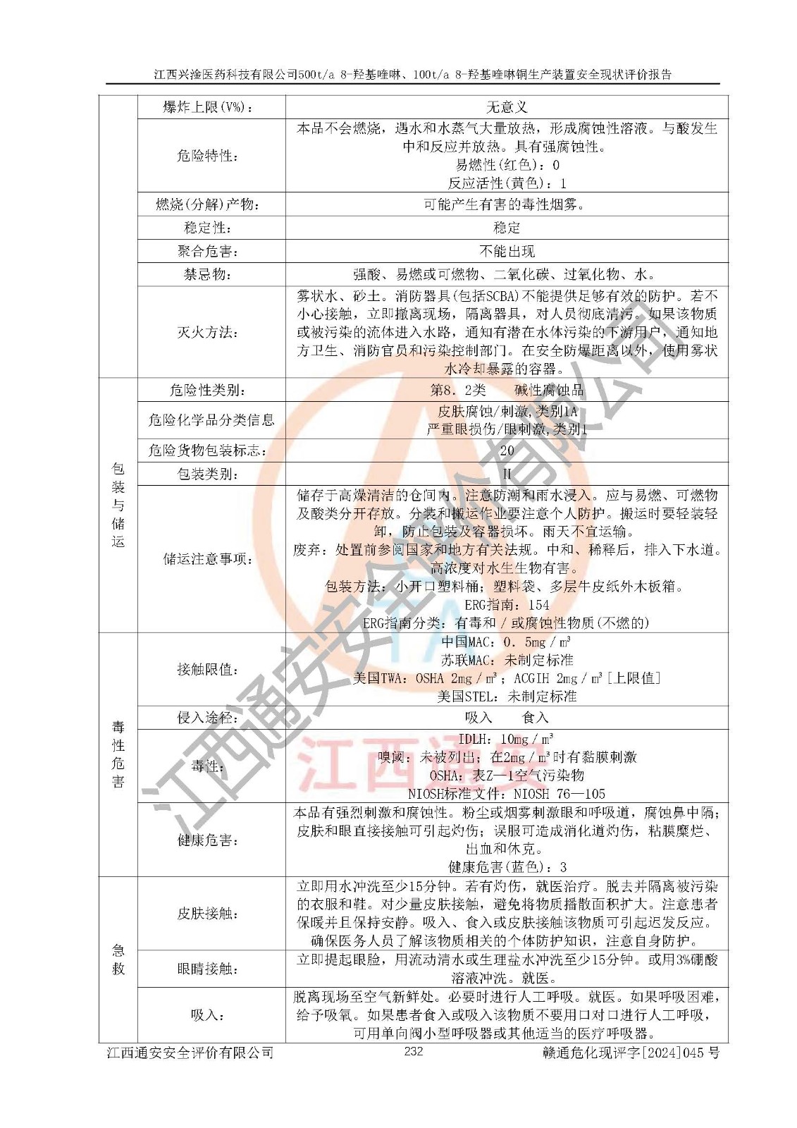 评价结论 | 评价结论:本报告认为,江西兴淦医药科技有限公司500t/a 8-羟基喹啉、100t/a 8-羟基喹啉铜生产装置现场情况与设计图纸一致,自动控制系统设计符合要求且运行正常,有关从业人员资质符合《江西省危险化学品安全专项整治三年行动实施方案》要求,安全设施及安全管理符合**及有关部门关于安全生产法律、法规、标准的要求,安全设施正常投用且运行**,安全风险是可以控制的,其风险程度是可以接受的,安全现状符合安全生产条件,能够满足安全生产的要求。 | |||