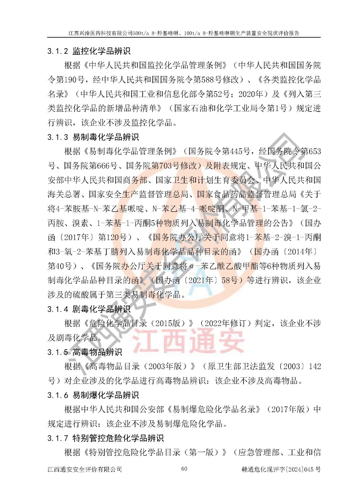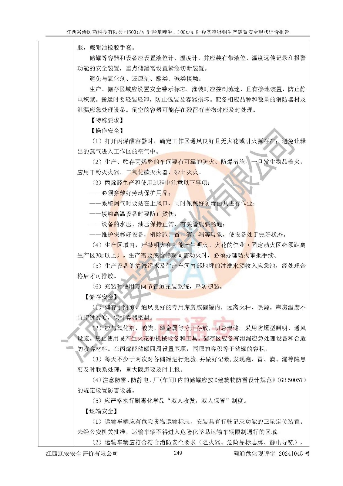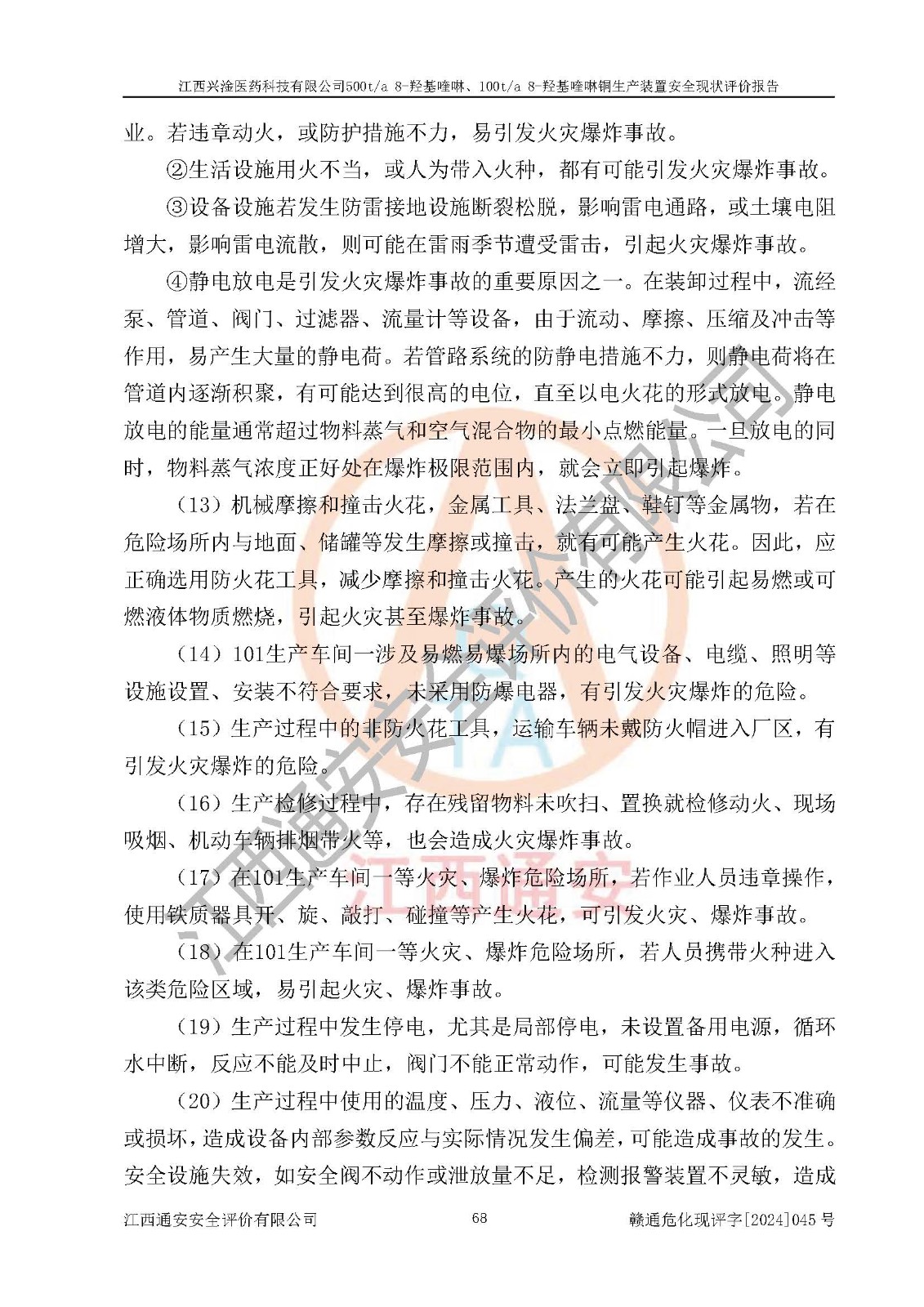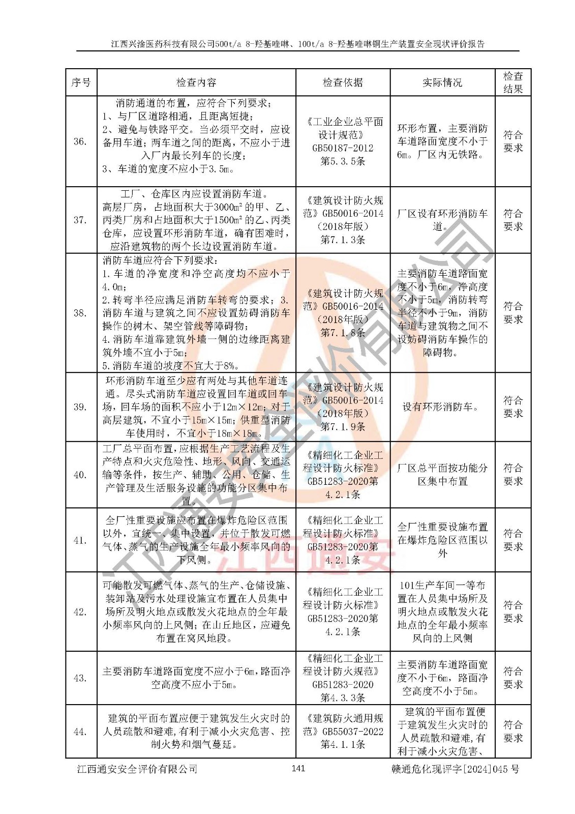 评价结论 | 评价结论:本报告认为,江西兴淦医药科技有限公司500t/a 8-羟基喹啉、100t/a 8-羟基喹啉铜生产装置现场情况与设计图纸一致,自动控制系统设计符合要求且运行正常,有关从业人员资质符合《江西省危险化学品安全专项整治三年行动实施方案》要求,安全设施及安全管理符合**及有关部门关于安全生产法律、法规、标准的要求,安全设施正常投用且运行**,安全风险是可以控制的,其风险程度是可以接受的,安全现状符合安全生产条件,能够满足安全生产的要求。 | |||