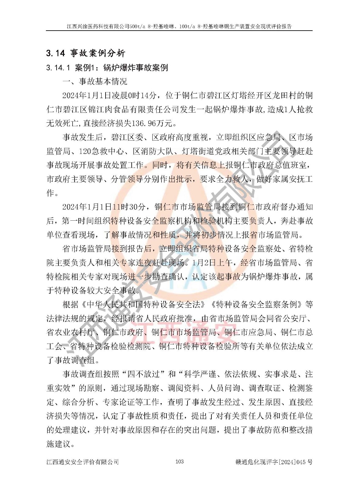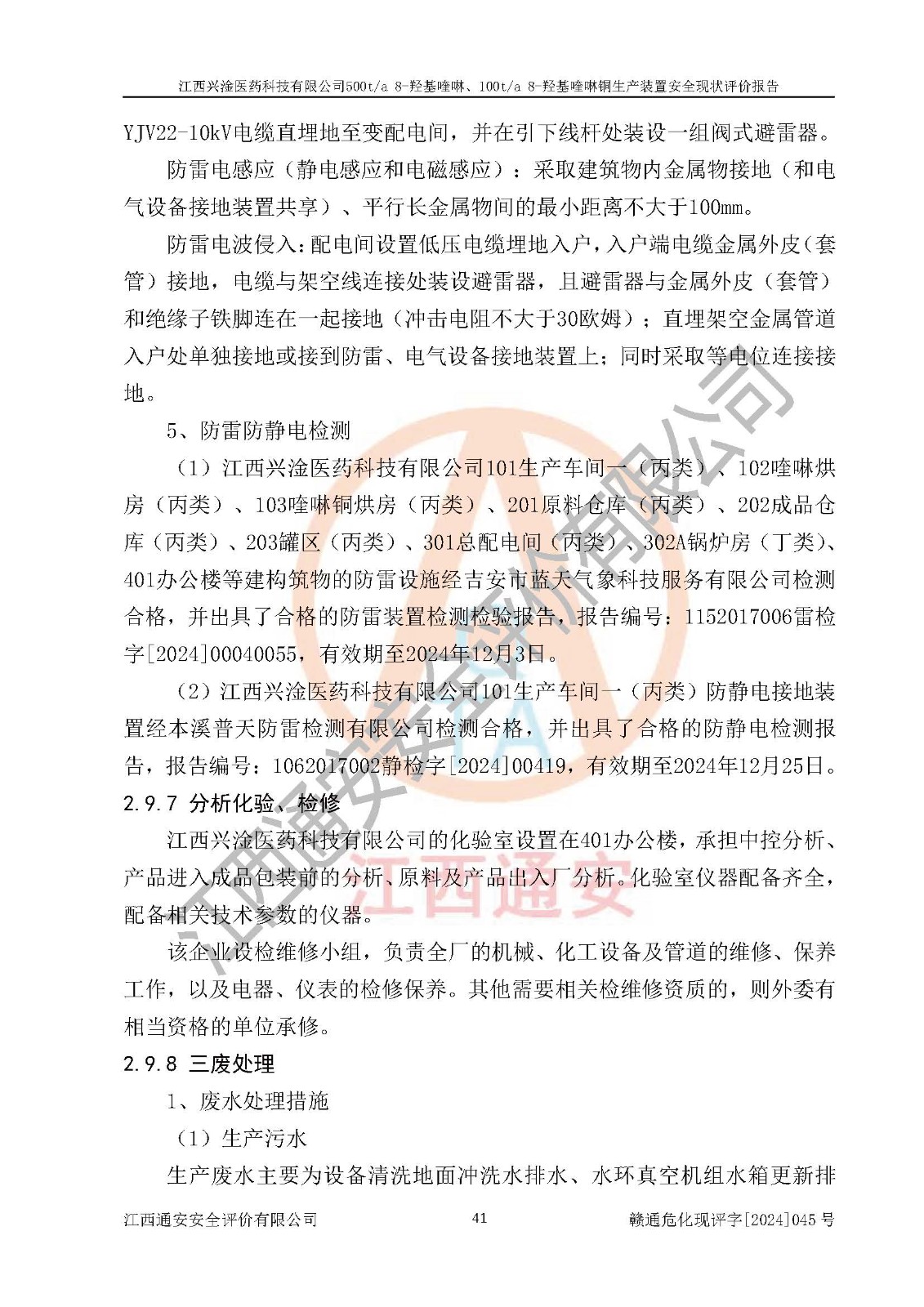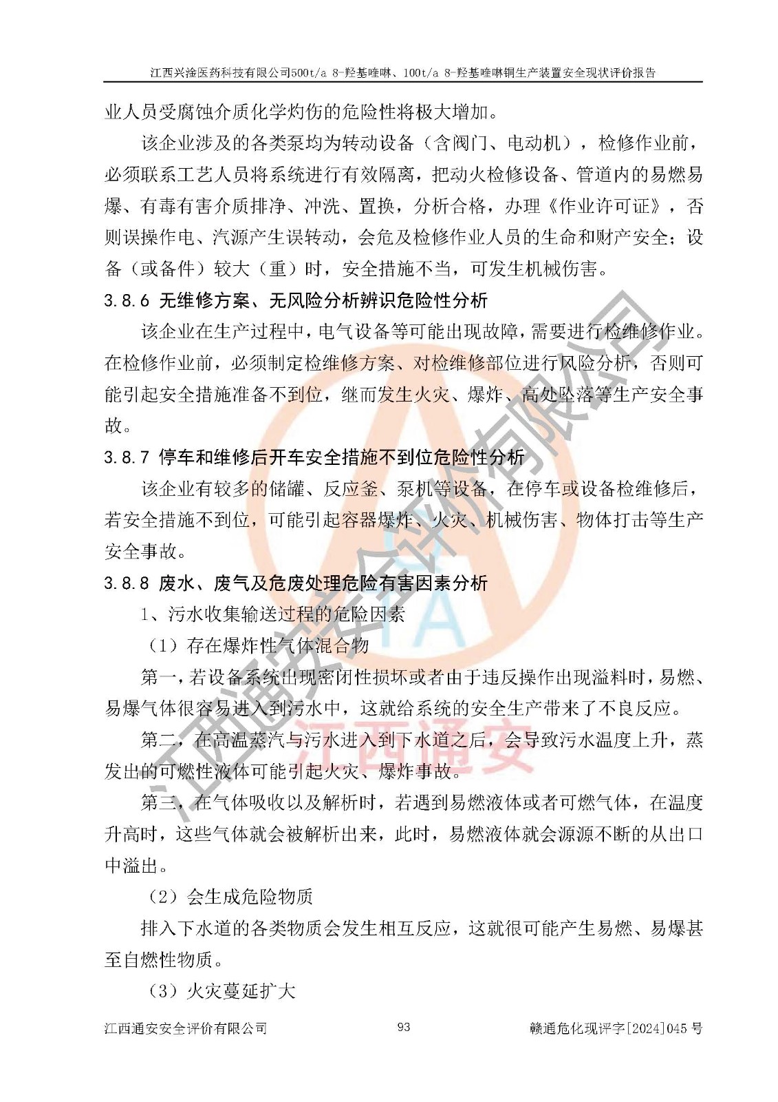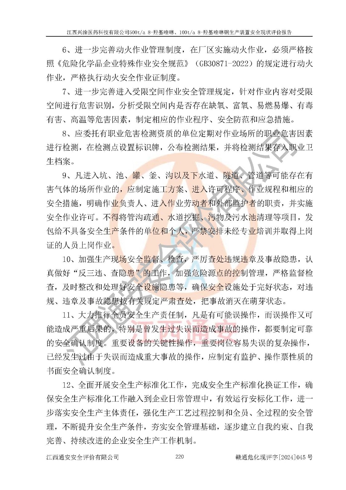 评价结论 | 评价结论:本报告认为,江西兴淦医药科技有限公司500t/a 8-羟基喹啉、100t/a 8-羟基喹啉铜生产装置现场情况与设计图纸一致,自动控制系统设计符合要求且运行正常,有关从业人员资质符合《江西省危险化学品安全专项整治三年行动实施方案》要求,安全设施及安全管理符合**及有关部门关于安全生产法律、法规、标准的要求,安全设施正常投用且运行**,安全风险是可以控制的,其风险程度是可以接受的,安全现状符合安全生产条件,能够满足安全生产的要求。 | |||