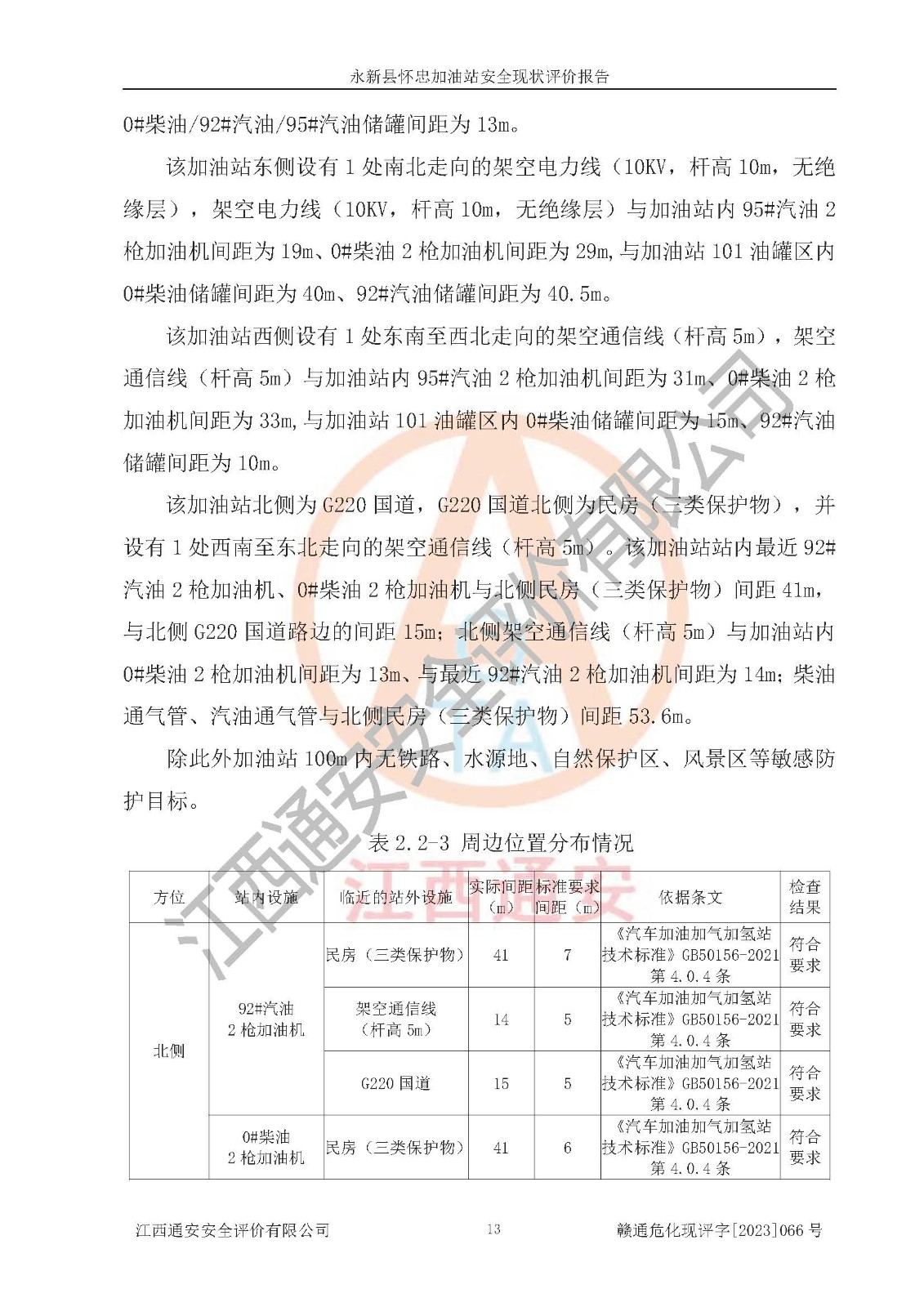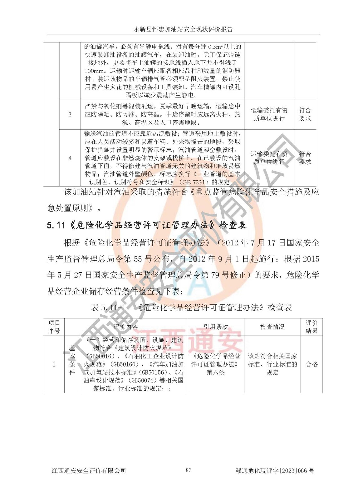 评价结论 | 评价结论:永新县怀忠加油站站址合理,周边环境良好,与敏感防护目标间距符合规范要求,站区建构筑物之间的防火间距、耐火等级符合标准要求,与总平面布置图一致,加油卸油工艺及设备设施合理,工艺布置得当,防雷设施经检测合格,采取的工艺安全设施符合规范要求;该加油站制定了安全管理制度和操作规程,人员经培训合格后上岗,安全管理人员经考核合格并取得安全合格证,能按照法律法规要求开展安全生产管理工作。 综上:永新县怀忠加油站符合《汽车加油加气加氢站技术标准》(GB50156-2021)等标准规范的要求,安全风险可控,满足危险化学品经营的安全条件。 | |||