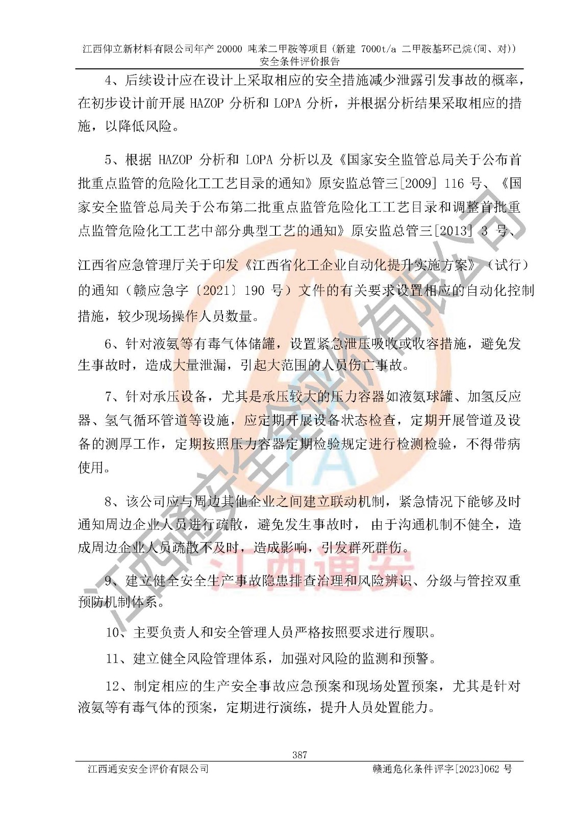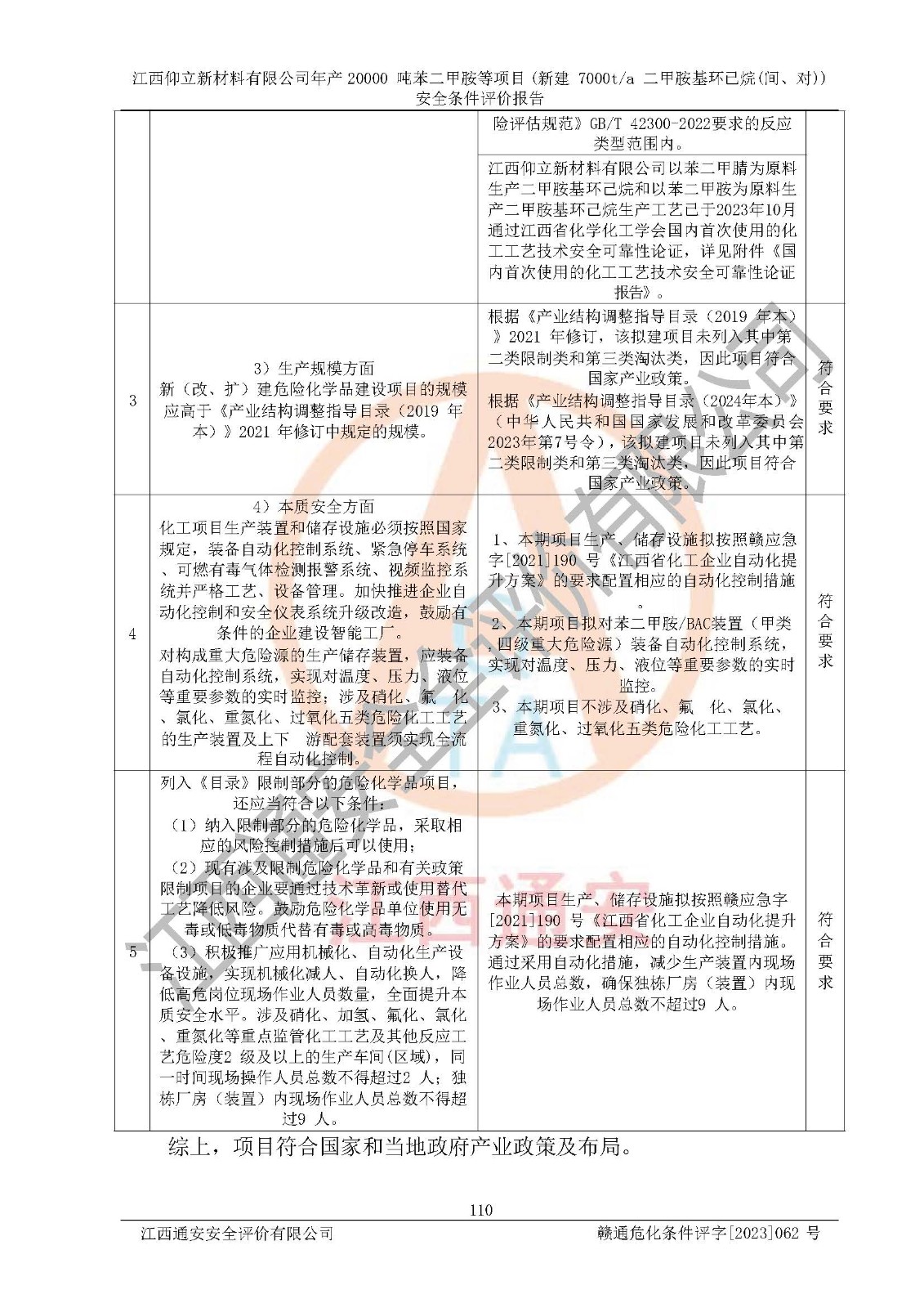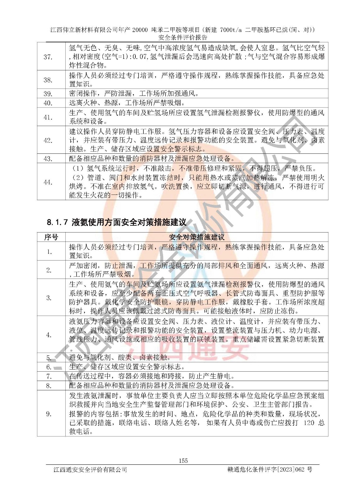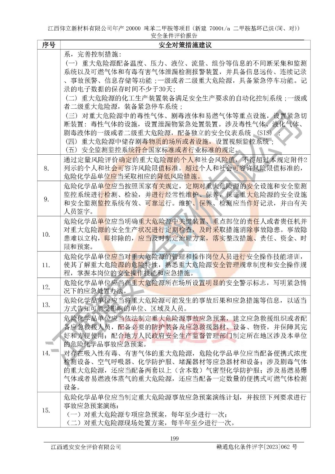 评价结论 | 本评价认为,江西仰立新材料有限公司年产 20000 吨苯二甲胺等项目(新建 7000t/a 二甲胺基环已烷(间、对))在以后的初步设计、施工图设计和建设施工、安装调试及生产运行中,如能严格执行**有关安全生产法律、法规和有关标准、规范,认真采纳本报告书第8章提出的安全对策措施及建议,真正做到安全设施与主体工程同时设计、同时施工、同时投入生产和使用的“三同时”,工程的危险、有害因素可得到**控制,风险在可接受范围内,具有**的本质安全水平。该建设项目从安全方面分析可行。 | |||