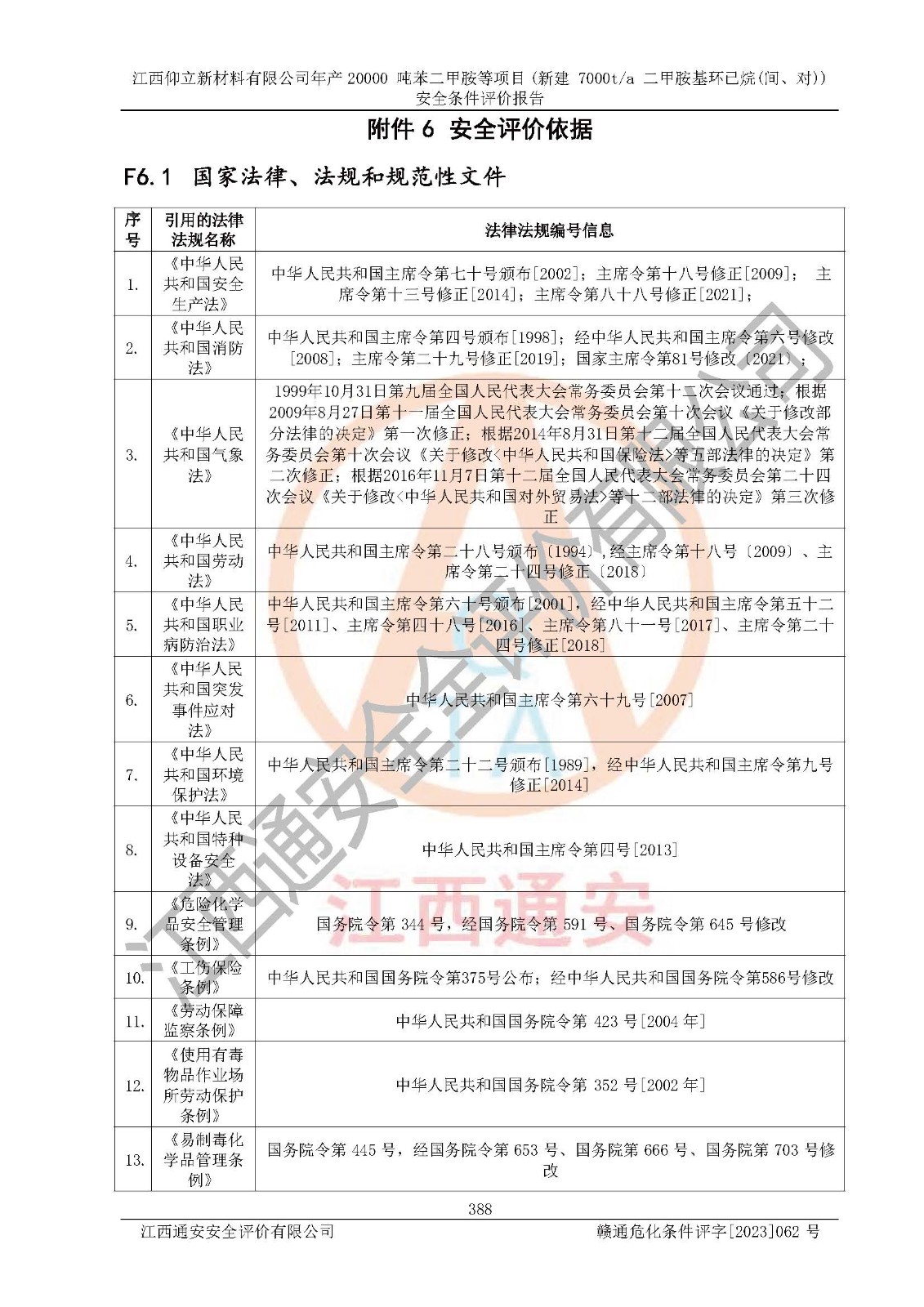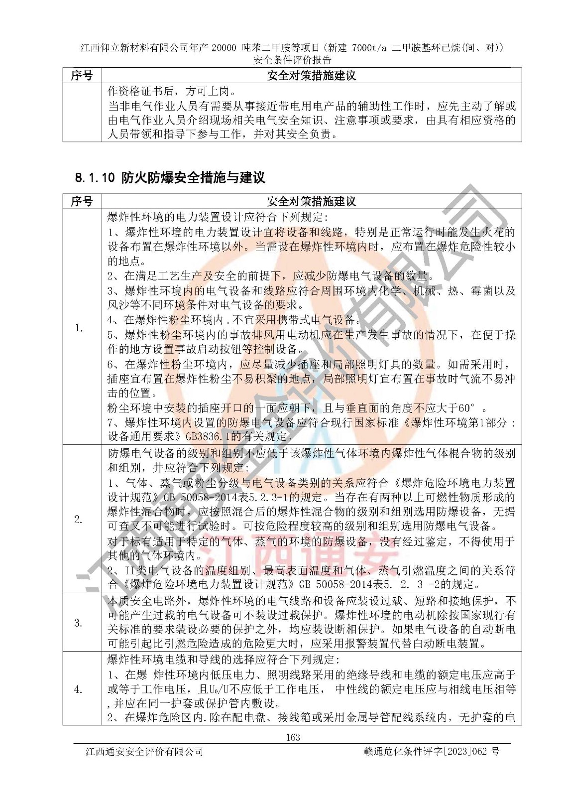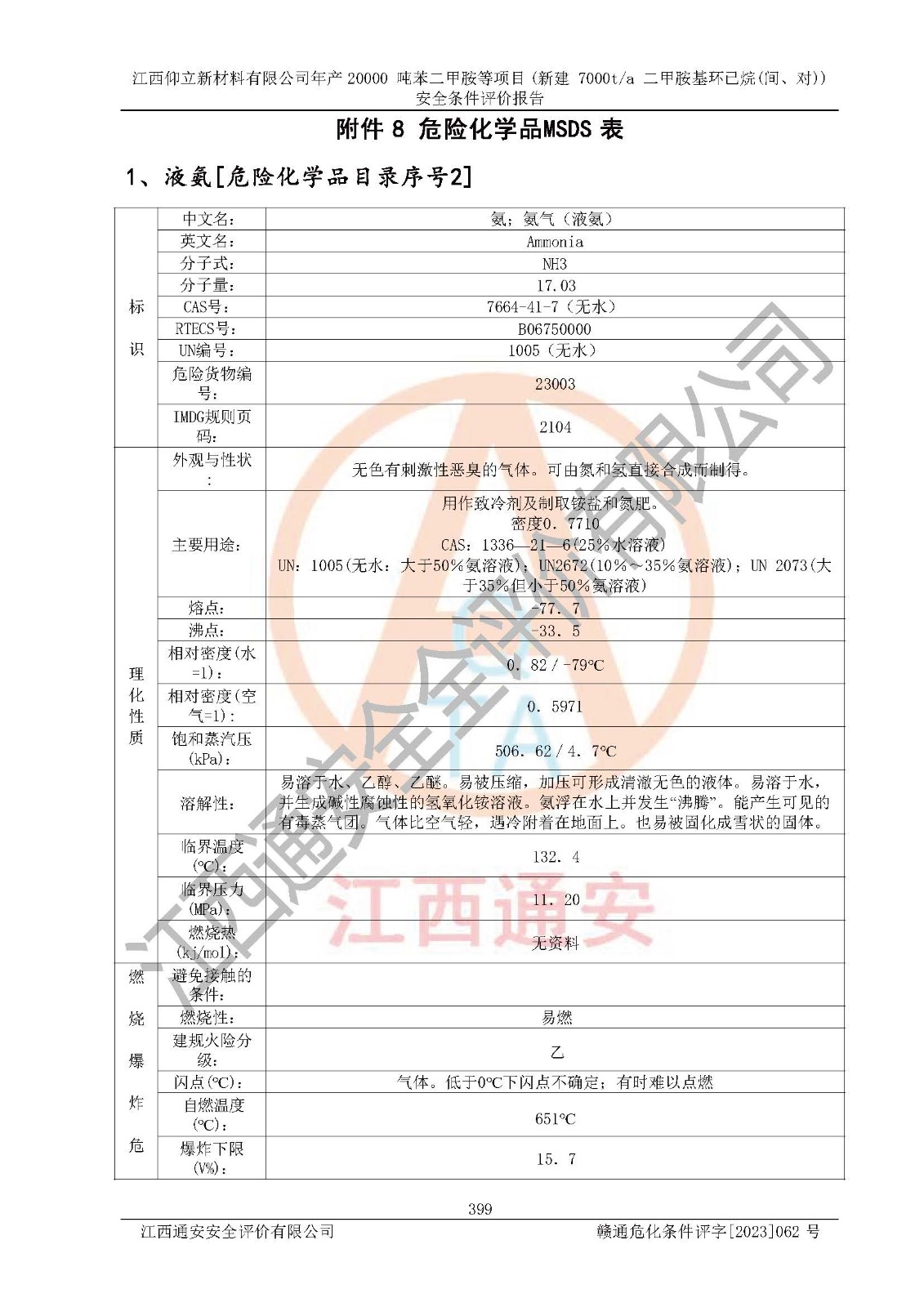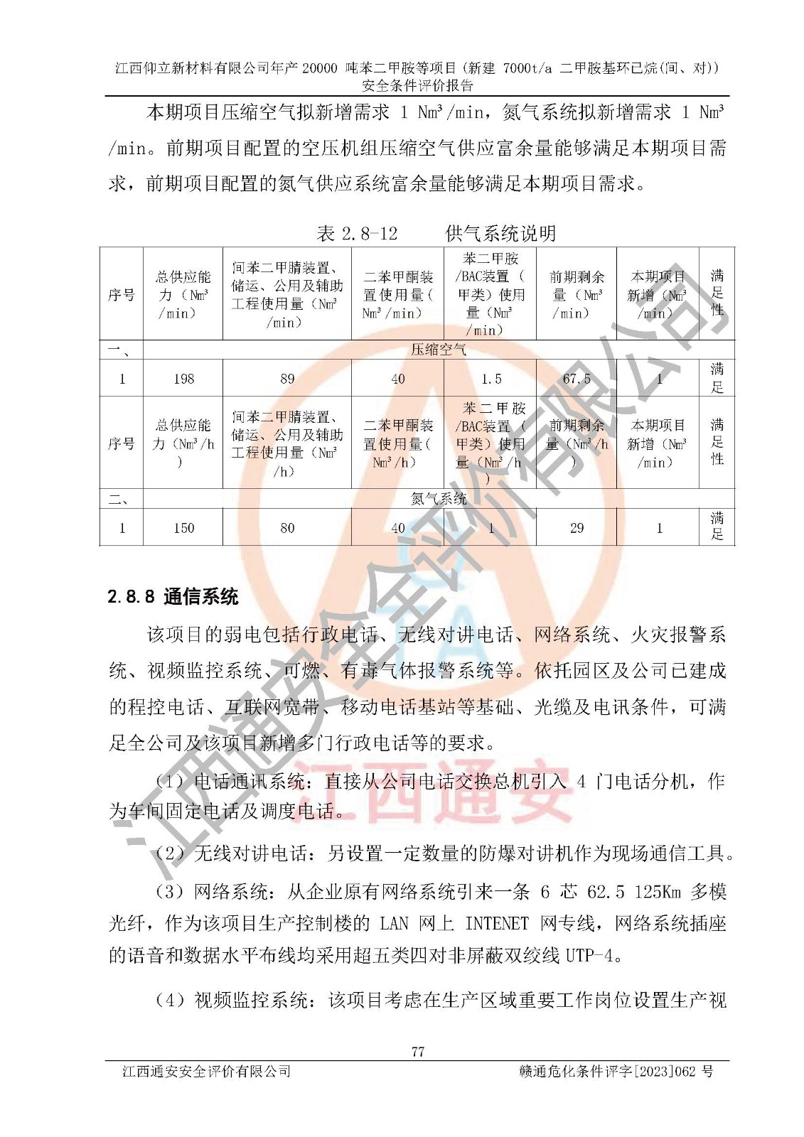 评价结论 | 本评价认为,江西仰立新材料有限公司年产 20000 吨苯二甲胺等项目(新建 7000t/a 二甲胺基环已烷(间、对))在以后的初步设计、施工图设计和建设施工、安装调试及生产运行中,如能严格执行**有关安全生产法律、法规和有关标准、规范,认真采纳本报告书第8章提出的安全对策措施及建议,真正做到安全设施与主体工程同时设计、同时施工、同时投入生产和使用的“三同时”,工程的危险、有害因素可得到**控制,风险在可接受范围内,具有**的本质安全水平。该建设项目从安全方面分析可行。 | |||