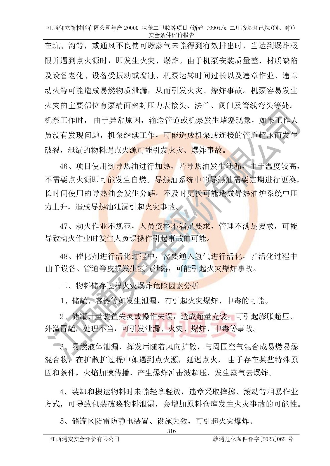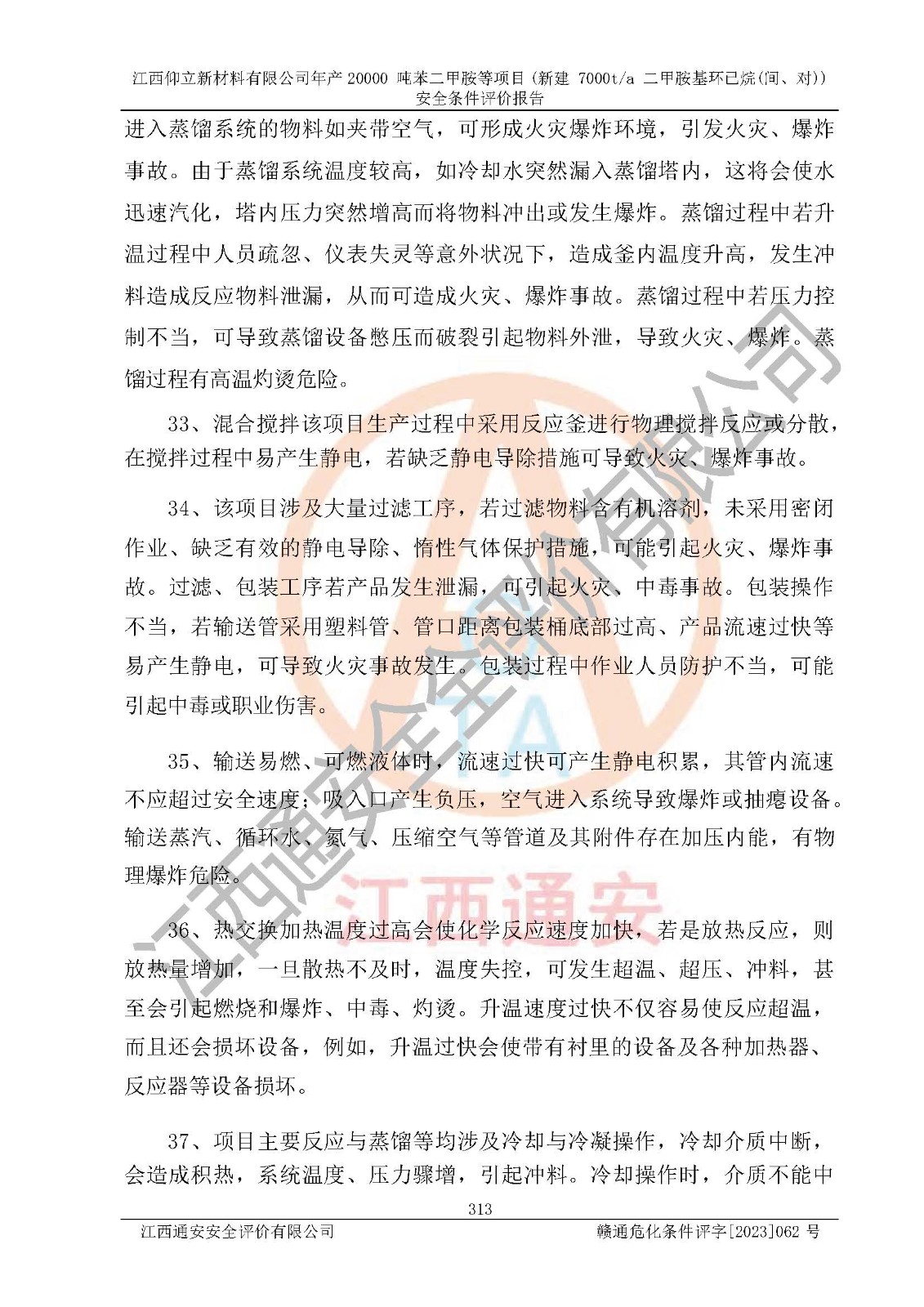 项目简介 | 江西仰立新材料有限公司成立于2018年10月22日,并取得新干县市场监督管理局颁发的《营业执照》,营业执照统一社会信用代码:91360824MA386QF415。公司注册住所:江西省吉安市新干县盐化工业城。法定**人:苗育,注册资本壹亿伍**元整。企业性质为有限责任公司(非自然人投资或控股的法人独资)。营业执照许可经营范围:许可项目:有毒化学品进出口,技术进出口,货物进出口,进出口代理,海关监管货物仓储服务 (不含危险化学品),保税物流中心经营,国营贸易管理货物的进出口《依法须经批准的项目,经相关部门批准后方可开展经营活动)化工新材料技术开发、**、咨询销售(依法须经批准的项目,经相关、服务及相关产品研发、制造、部门批准后方可开展经营活动)一般项目:化工产品销售(不含许可类化工产品)(除许可业务外,可自主依法经营法律法规非禁止或限制的项目)。 江西仰立新材料有限公司2018年12月26日取得新干县发展和改革委员会《关于年产20000吨苯二甲胺等项目建设备案的通知》(干发改备字[2018]118号),批复项目建设规模及主要内容:项目用地约515.83亩(一期350亩、二期165.83亩),建设年产20000吨间苯二甲胺、5000吨对苯二甲胺、7000吨二甲胺基环己烷(间、对)、3000吨环己基甲酸配套20000吨苯二甲腈、5000吨对苯二甲腈、18000吨三氯苄、2000吨一氯苄、8100吨苯甲酰氯、10000吨二苯甲酮、10000吨氯代苯腈(邻、对)、配套100吨催化剂产品项目。本期项目为江西仰立新材料有限公司年产 20000 吨苯二甲胺等项目(新建 7000t/a 二甲胺基环已烷(间、对))项目。 根据《危险化学品目录(2015版)》(**安监总局等十部门公告[2015]第5号)及应急管理部、工业和信息化部、公安部、生态环境部、交通运输部、农业农村部、卫生健康委、市场监管总局、铁路局、民航局决定调整《危险化学品目录(2015版)》(应急管理部、工业和信息化部、公安部、生态环境部、交通运输部、农业农村部、卫生健康委、市场监管总局、铁路局、民航局公告2022年第8号)等文件对该项目生产过程中所涉及的化学品进行辨识:本期项目涉及到的危险化学品有液氨、氢气、环己基甲胺(副产品)、氮气(保护气体、吹扫气体)、氨水(≥15%;副产品)等。 根据《**安全监管总局关于公布首批重点监管的危险化学品名录的通知》原安监总管三[2011] 95号、《**安全监管总局关于公布第二批重点监管危险化学品名录的通知》原安监总管三[2013] 12号进行辨识:本期项目涉及的液氨、氢气等属于重点监管的危险化学品。 根据《**安全监管总局关于公布首批重点监管的危险化工工艺目录的通知》原安监总管三[2009] 116号、《**安全监管总局关于公布第二批重点监管危险化工工艺目录和调整首批重点监管危险化工工艺中部分典型工艺的通知》原安监总管三[2013] 3号的规定对项目生产工艺进行辨识:该项目苯二甲腈(间、对)加氢生成苯二甲胺的工艺过程涉及的加氢工艺属重点监管的危险化工工艺。该项目苯二甲胺加氢生成二甲胺基环己烷的工艺过程涉及的加氢工艺属重点监管的危险化工工艺。 经辨识,江西仰立新材料有限公司年产 20000 吨苯二甲胺等项目(新建 7000t/a 二甲胺基环已烷(间、对))涉及的生产、储存设施中苯二甲胺/BAC装置(甲类)构成危险化学品四级重大危险源。 经辨识项目主要存在的危险有害因素有火灾爆炸、容器爆炸、中毒窒息、灼烫、机械伤害、高处坠落、物体打击、触电、**伤害、淹溺、坍塌、起重伤害、噪声危害、高温危害、腐蚀危害、振动危害、采光不良等。 | |||