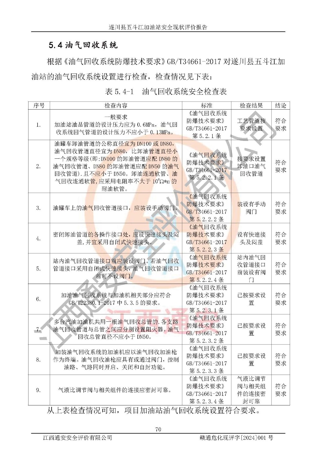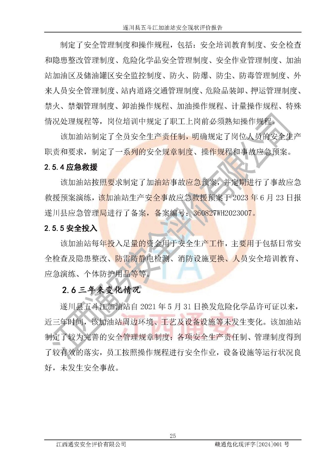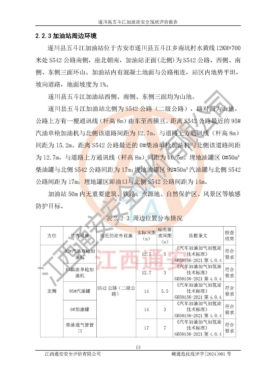 评价结论 | 遂川县五斗江加油站站址合理,周边环境良好,与敏感防护目标间距符合规范要求,站区建构筑物之间的防火间距、耐火等级符合标准要求,与总平面布置图一致,加油卸油工艺及设备设施合理,工艺布置得当,防雷设施经检测合格,采取的工艺安全设施符合规范要求;该加油站制定了安全管理制度和操作规程,人员经培训合格后上岗,安全管理人员经考核合格并取得安全合格证,能按照法律法规要求开展安全生产管理工作。 综上:遂川县五斗江加油站符合《汽车加油加气加氢站技术标准》GB50156-2021等标准规范的要求,安全风险可控,满足危险化学品经营的安全条件。 | |||