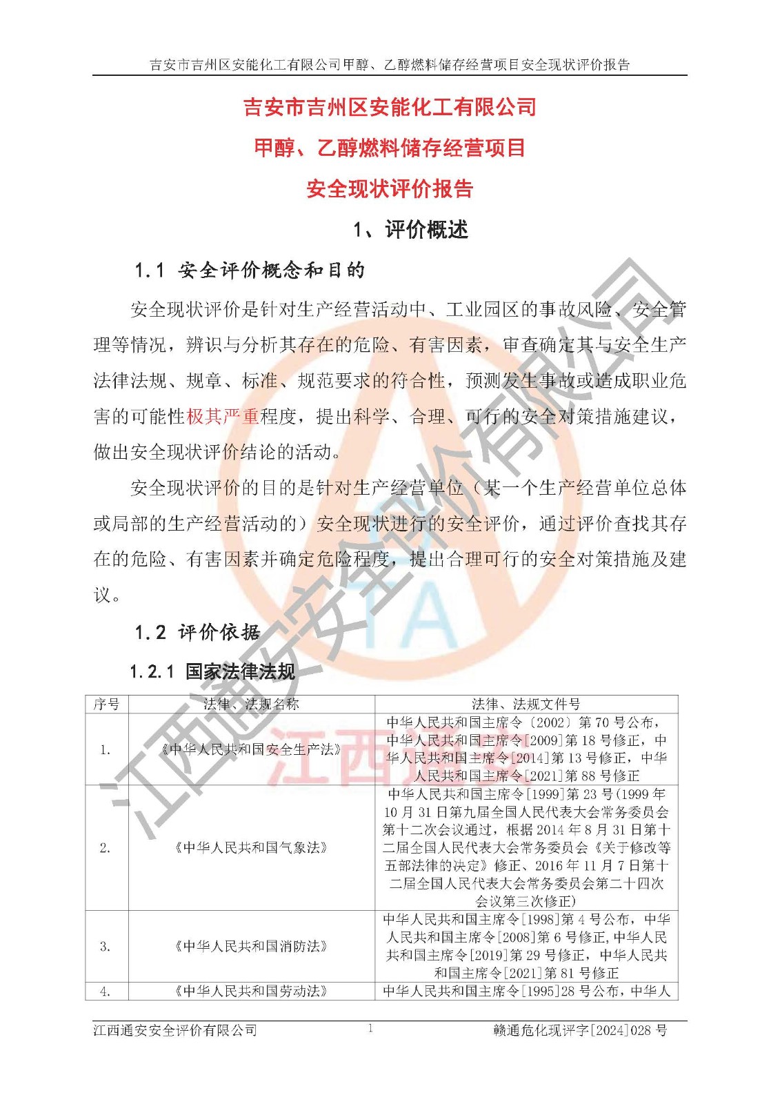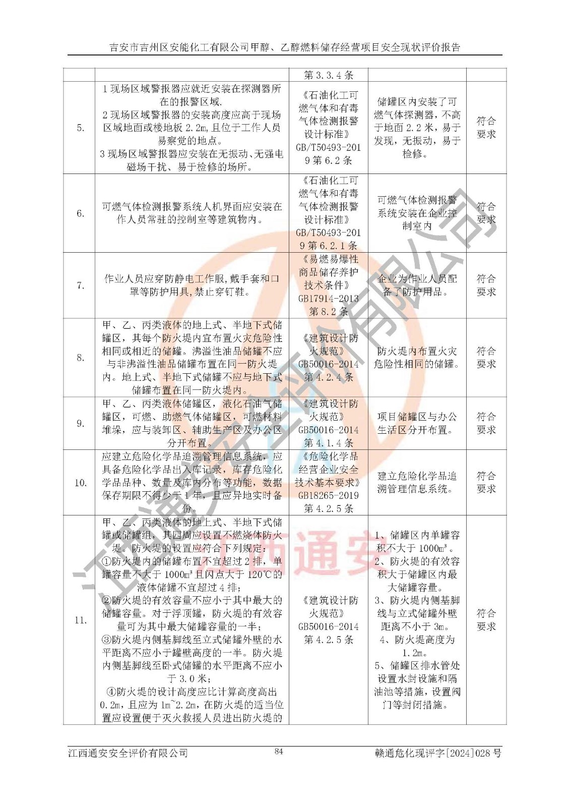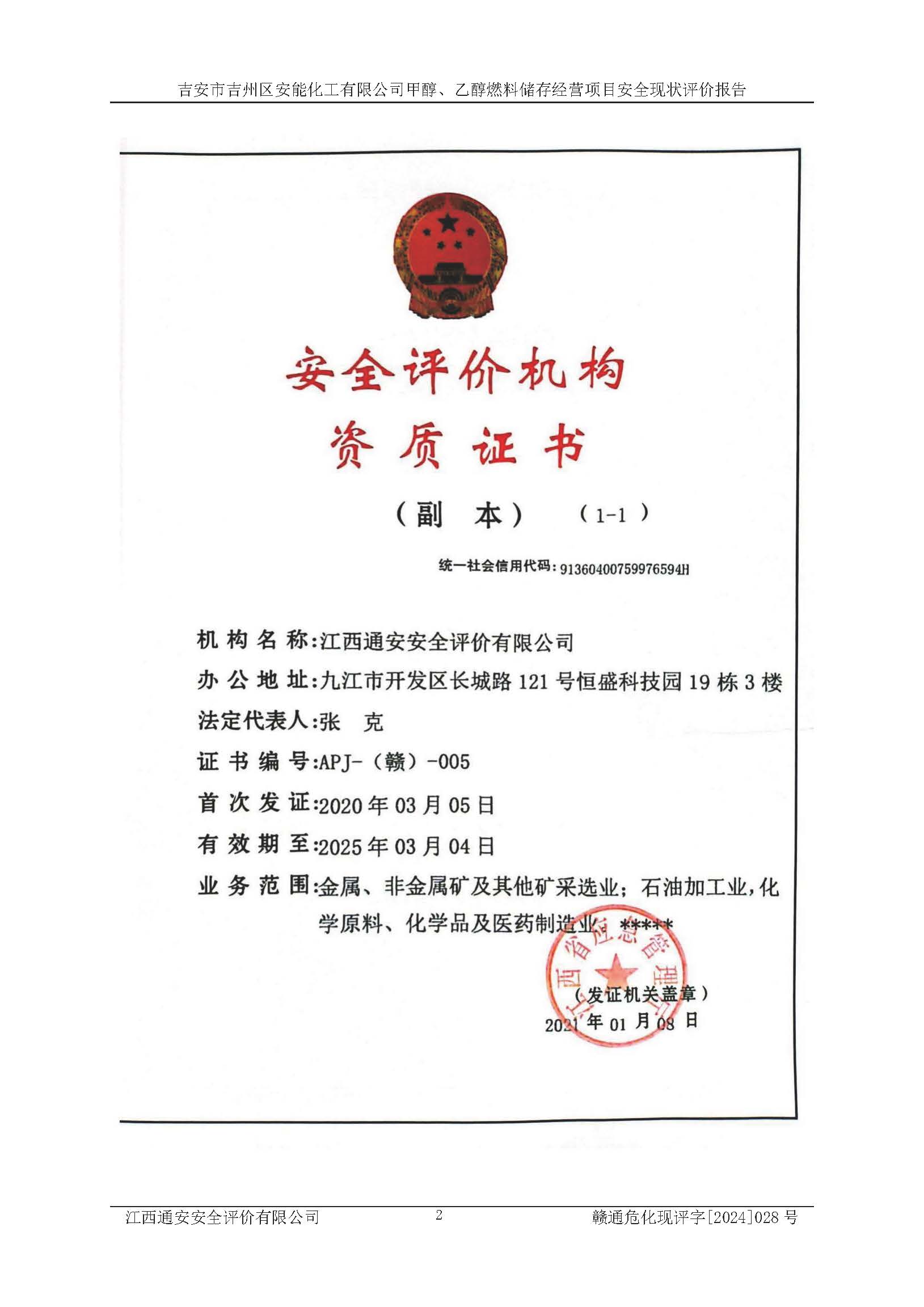 评价结论 | 吉安市吉州区安能化工有限公司甲醇、乙醇燃料储存经营项目经营现状满足项目危险化学品储存和经营的要求,安全管理**,安全风险可控,满足危险化学品经营的安全条件。 | |||