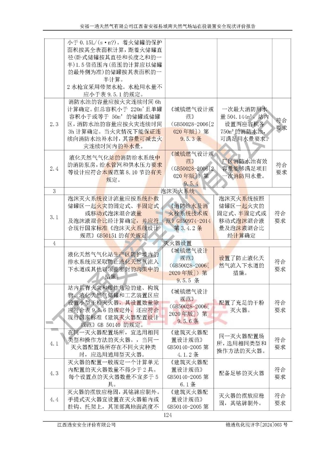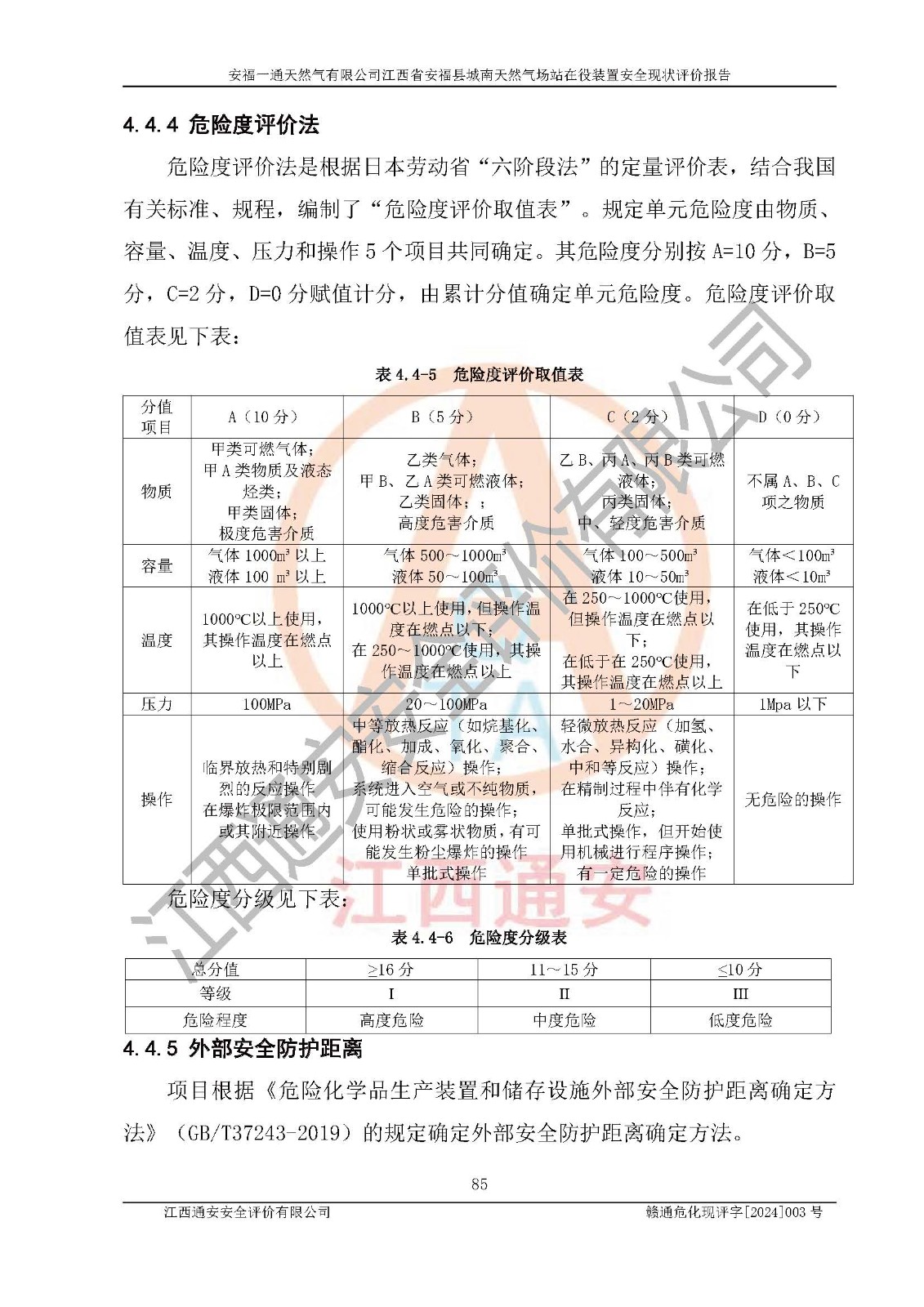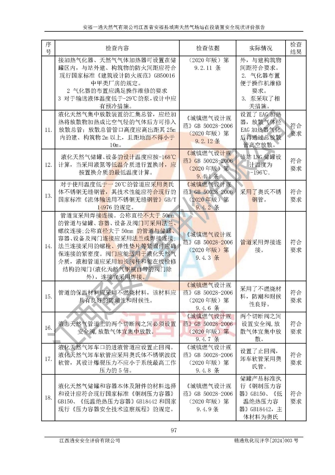评价结论 | 安福一通天然气有限公司在役装置符安福县规划;总平面布置符合《城镇燃气设计规范》GB 50028-2006(2020年版)等标准、规范的要求;项目采用成熟的生产工艺和设备,本质安全程度较高;同时对生产过程中存在事故危险的设施和场所采取了一系列的合理可行的防护措施和科学的管理,近期通过对存在的安全问题进行了整改,使生产过程中的危险有害因素能得到**控制。建设项目安全设施符合**现行有关法律、法规、标准的要求。 评价结论:本报告认为,安福一通天然气有限公司在役装置现场情况与企业提供的现状图纸一致,自动化控制系统运行正常,有关从业人员资质符合《城镇燃气管理条例》(2010年11月19日中华人民共和国***令第583号公布 根据2016年2月6日《***关于修改部分行政法规的决定》修订)及《江西省燃气管理办法》(2003年8月31日江西省人民**令**23号公布 2014年1月30日江西省人民**令第210号**次修正 2019年11月27日江西省人民**令第242号第二次修正)要求,安全设施及安全管理符合**及有关部门关于安全生产法律、法规、标准的要求,安全风险是可以控制的,其风险程度是可以接受的,安全现状符合安全生产条件,能够满足安全生产的要求。 | |||
