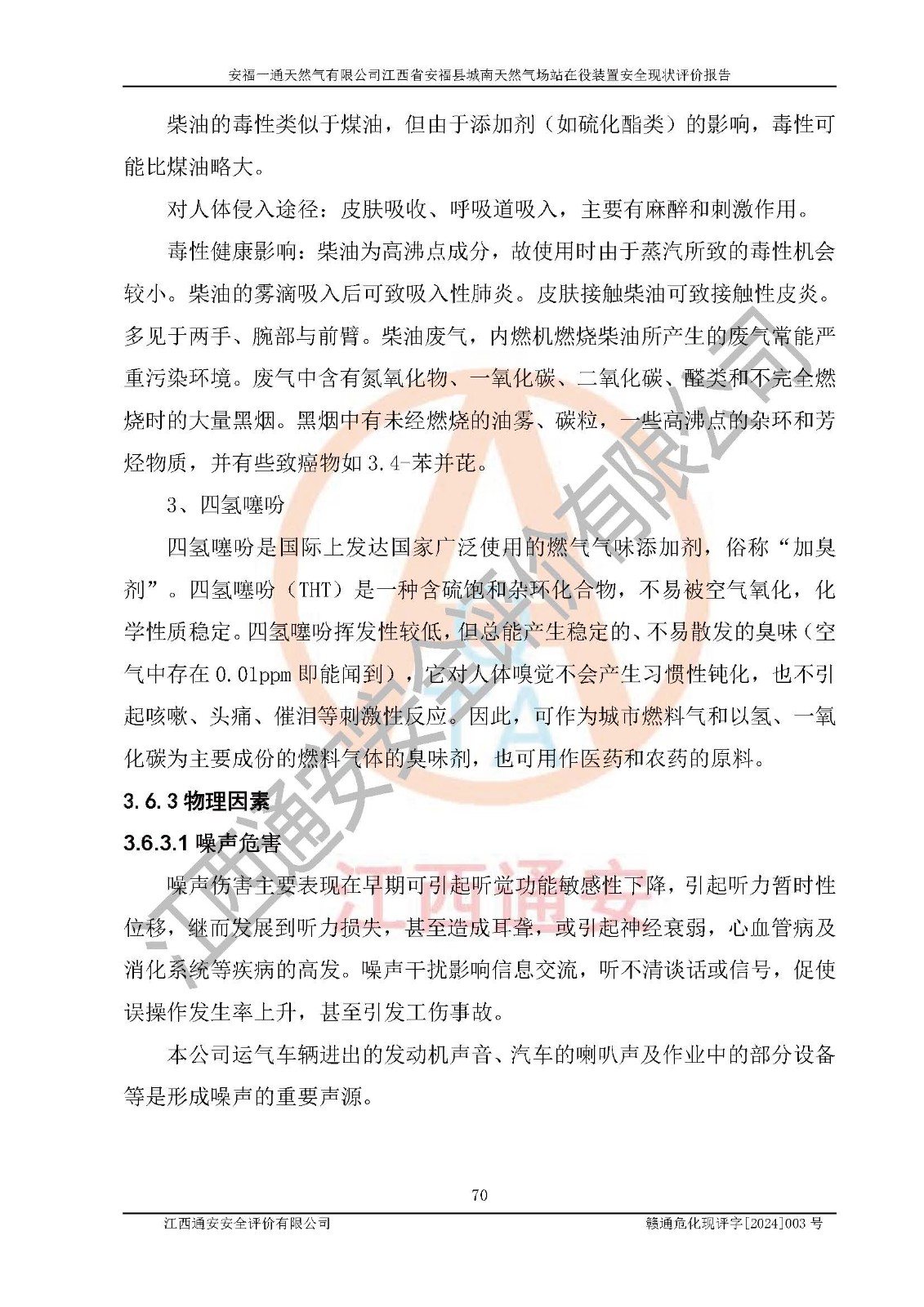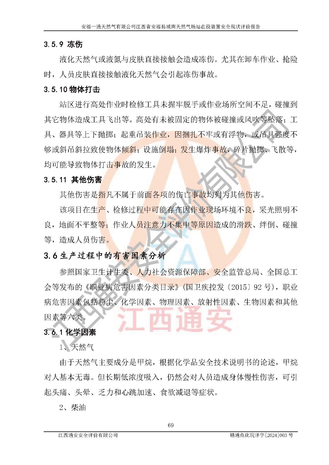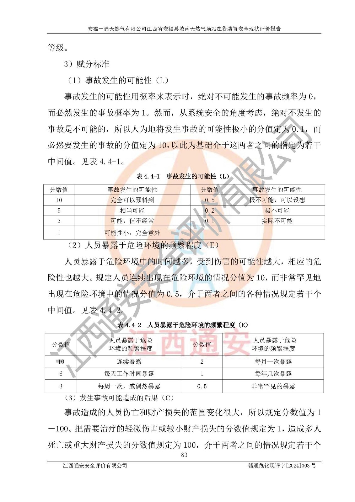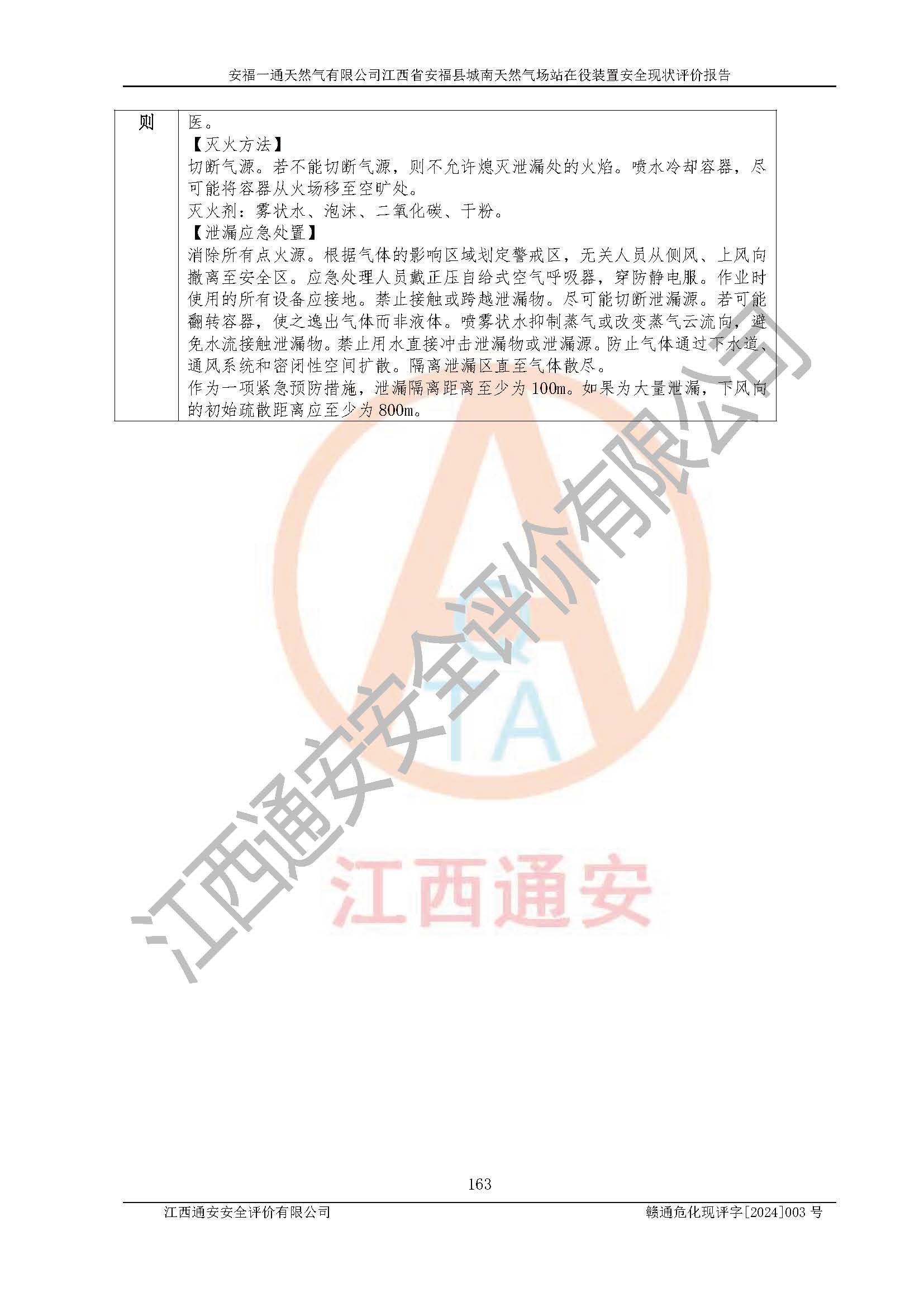 评价结论 | 安福一通天然气有限公司在役装置符安福县规划;总平面布置符合《城镇燃气设计规范》GB 50028-2006(2020年版)等标准、规范的要求;项目采用成熟的生产工艺和设备,本质安全程度较高;同时对生产过程中存在事故危险的设施和场所采取了一系列的合理可行的防护措施和科学的管理,近期通过对存在的安全问题进行了整改,使生产过程中的危险有害因素能得到**控制。建设项目安全设施符合**现行有关法律、法规、标准的要求。 评价结论:本报告认为,安福一通天然气有限公司在役装置现场情况与企业提供的现状图纸一致,自动化控制系统运行正常,有关从业人员资质符合《城镇燃气管理条例》(2010年11月19日中华人民共和国***令第583号公布 根据2016年2月6日《***关于修改部分行政法规的决定》修订)及《江西省燃气管理办法》(2003年8月31日江西省人民**令**23号公布 2014年1月30日江西省人民**令第210号**次修正 2019年11月27日江西省人民**令第242号第二次修正)要求,安全设施及安全管理符合**及有关部门关于安全生产法律、法规、标准的要求,安全风险是可以控制的,其风险程度是可以接受的,安全现状符合安全生产条件,能够满足安全生产的要求。 | |||