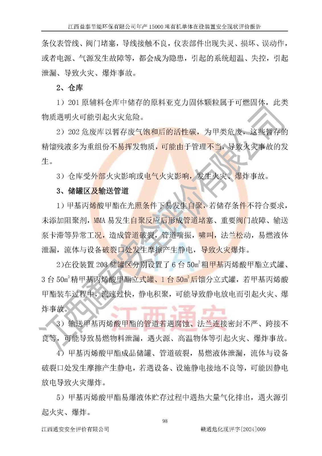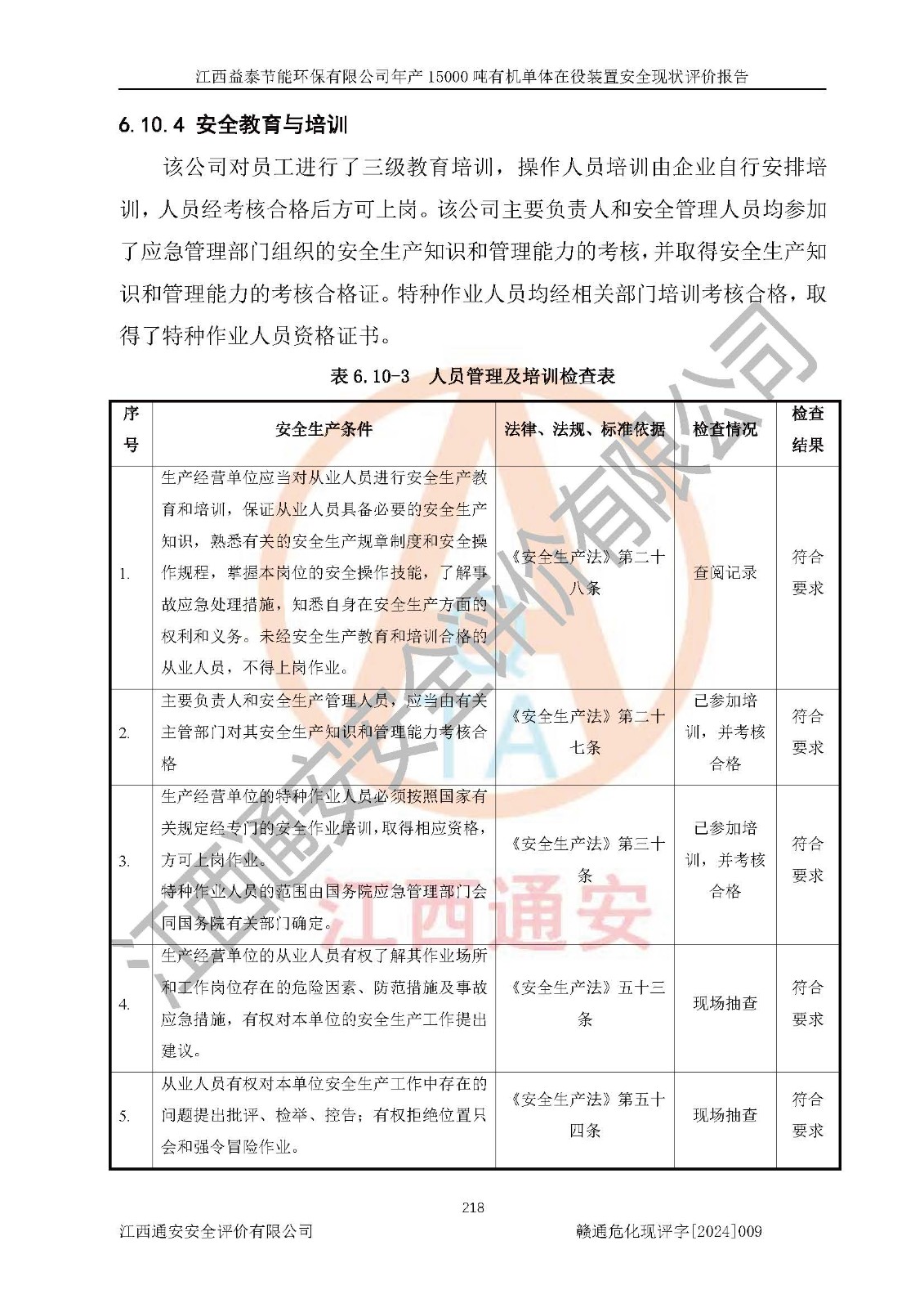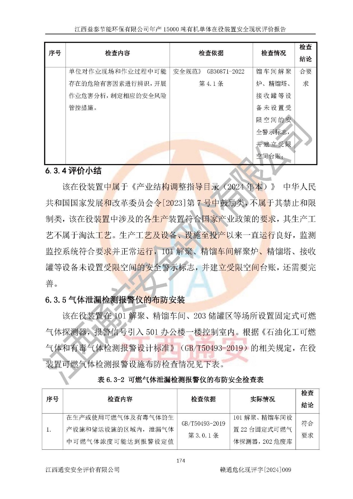 评价结论 | 江西益泰节能**有限公司年产15000吨有机单体在役装置符合**产业政策,总平面布置符合《建筑设计防火规范(2018年版)》GB50016-2014等标准、规范的要求;勘查现场时,生产车间(含车间内的生产设备设施)、仓库、储罐区的布置情况与安全设施图纸一致,现有控制系统与自动化提升方案之前设计一致,并**运行;该公司主要负责人专业,主管安全负责人和安全生产管理人员学历,目前正在专业、学历提升中,其他相关从业人员符合《江西省危险化学品安全专项整治三年行动实施方案》专业、学历要求;该公司采用成熟的生产工艺和设备;该公司对生产过程中存在事故风险的设施和场所采取了一系列的合理可行的防护措施和安全管理,近期通过对存在的安全隐患问题进行了整改,使生产、储存过程中的危险有害因素能得到**控制,安全设施符合**现行有关法律、法规、标准的要求。 评价结论:本报告认为,江西益泰节能**有限公司年产15000吨有机单体在役装置的安全设施及安全管理符合**及有关部门关于安全生产法律、法规、标准的要求,针对本报告提出的问题,企业已完成整改,其安全风险是受控制的,其风险程度是可以接受的,安全现状符合安全生产条件,能够满足安全生产的要求。 | |||