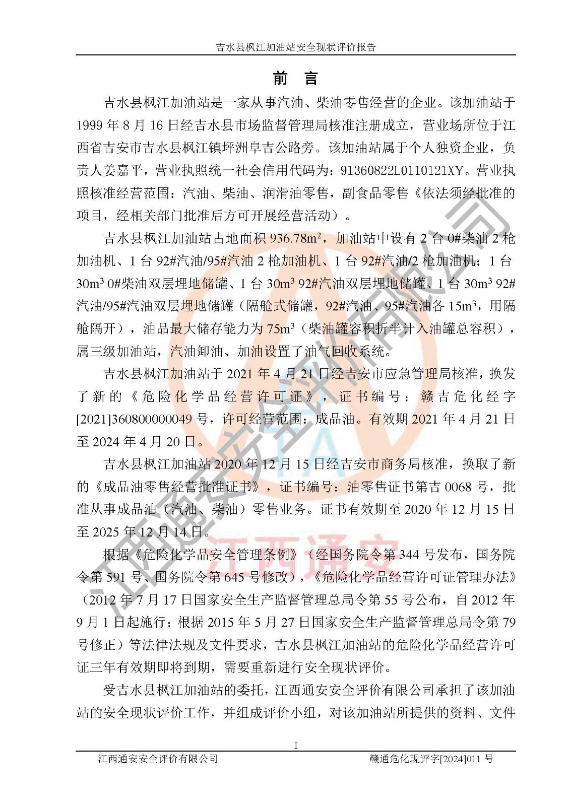 评价报告名称 | 吉水县枫江加油站安全现状评价报告 | |||