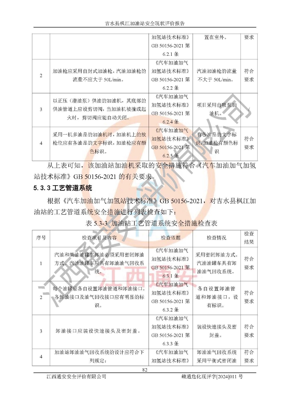 评价结论 | 1、吉水县枫江加油站已按照《中华人民共和国安全生产法(中华人民共和国主席令[2021]88号)》和《危险化学品建设项目安全监督管理办法》(**安监总局[2012]第45号令,2015年79号令修改)的要求进行安全条件评价,符合**和省关于危险化学品建设项目经营许可程序的要求。 2、吉水县枫江加油站总平面布置符合《汽车加油加气加氢站技术标准》GB50156-2021的要求。江西速达实业发展有限公司大广高速公路万安综合服务区加油站南站在项目建设和运行阶段,总平面布置设计、施工图设计和建设施工、安装调试及生产运行中,应严格执行**有关安全生产法律、法规和有关标准、规范,将本报告书中提出的安全对策措施落实到位,真正做到安全设施与主体工程同时设计、同时施工、同时投入生产和使用,项目建成后危险、有害因素可以得到**控制,安全风险在可接受范围,拟建的江西速达实业发展有限公司大广高速公路万安综合服务区加油站南站项目符合法律法规、标准、规章和规范的要求。 | |||