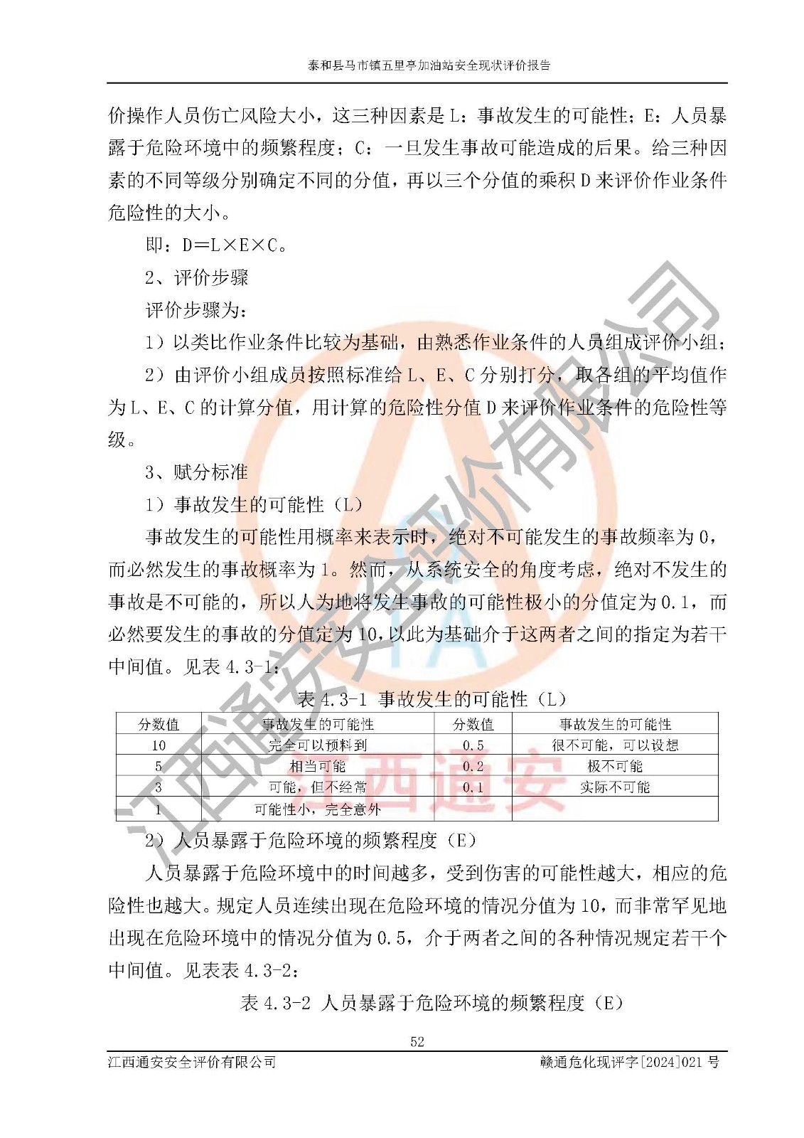 评价结论 | 1、泰和县马市镇五里亭加油站已按照《中华人民共和国安全生产法(中华人民共和国主席令[2021]88号)》和《危险化学品建设项目安全监督管理办法》(**安监总局[2012]第45号令,2015年79号令修改)的要求进行安全条件评价,符合**和省关于危险化学品建设项目经营许可程序的要求。 2、泰和县马市镇五里亭加油站总平面布置符合《汽车加油加气加氢站技术标准》GB50156-2021的要求。泰和县马市镇五里亭加油站在项目建设和运行阶段,总平面布置设计、施工图设计和建设施工、安装调试及生产运行中,应严格执行**有关安全生产法律、法规和有关标准、规范,将本报告书中提出的安全对策措施落实到位,真正做到安全设施与主体工程同时设计、同时施工、同时投入生产和使用,项目建成后危险、有害因素可以得到**控制,安全风险在可接受范围,符合法律法规、标准、规章和规范的要求。 | |||