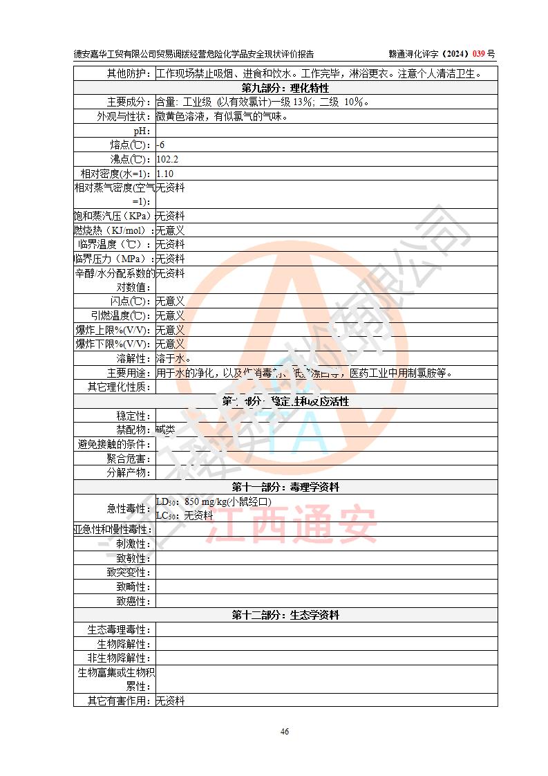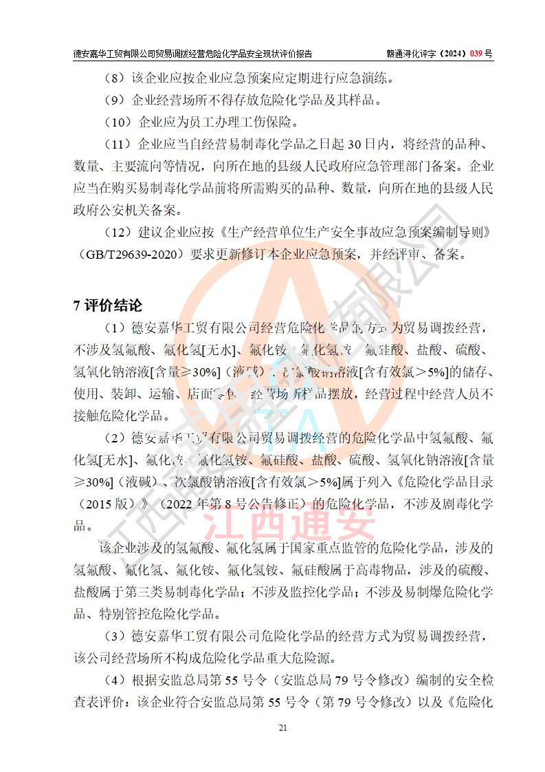 评价结论 | 德安嘉华工贸有限公司贸易调拨经营危险化学品的安全条件符合**有关法规、标准、规范要求,风险可控,具备危险化学品贸易调拨经营的安全条件。 | |||