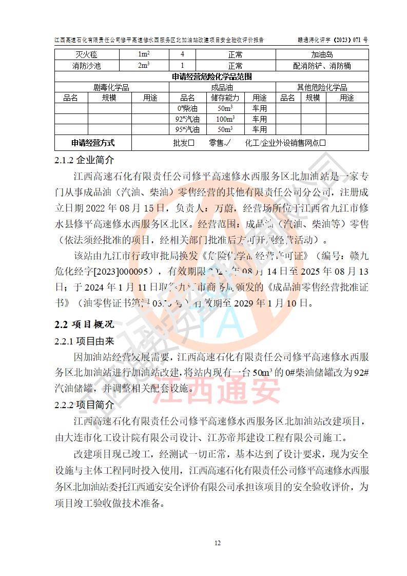 项目简介 | 江西高速石化有限责任公司修平高速修水西服务区北加油站是一家专门从事成品油(汽油、柴油)零售经营的其他有限责任公司分公司,注册成立日期2022年08月15日,负责人:万蔚,经营场所位于江西省九江市修水县修平高速修水西服务区北区。经营范围:成品油(汽油、柴油等)零售(依法须经批准的项目,经相关部门批准后方可开展经营活动)。 该站由九江市行政审批局换发《危险化学品经营许可证》(编号:赣九危化经字[2023]000095),**期限2022年08月14日至2025年08月13日;于2024年1月11日取得九江市商务局颁发的《成品油零售经营批准证书》(油零售证书第浔0356号)**期至2029年1月10日。 江西高速石化有限责任公司修平高速修水西服务区北加油站占地面积约4300m2,站内设置有3台四枪潜油泵程控燃油加油机及配套的工艺管线,原设埋地卧式双层油罐4台,其中50m³的0#柴油储罐2台、50m³的92#汽油储罐1台,50m³的95#汽油储罐1台,油品储罐总容积为150m³(柴油折半),属二级加油站。 因加油站经营发展需要,江西高速石化有限责任公司修平高速修水西服务区北加油站进行加油站改建,将站内现有一台50m³的0#柴油储罐改为92#汽油储罐,并调整相关配套设施;改建后站内设置有3台四枪潜油泵程控燃油加油机及配套的工艺管线,设埋地卧式双层油罐4台,其中50m³的0#柴油储罐1台、50m³的92#汽油储罐2台,50m³的95#汽油储罐1台,油品储罐总容积为175m³(柴油折半),按现行《汽车加油加气加氢站技术标准》对加油站的等级划分原则,属**加油站。 | |||