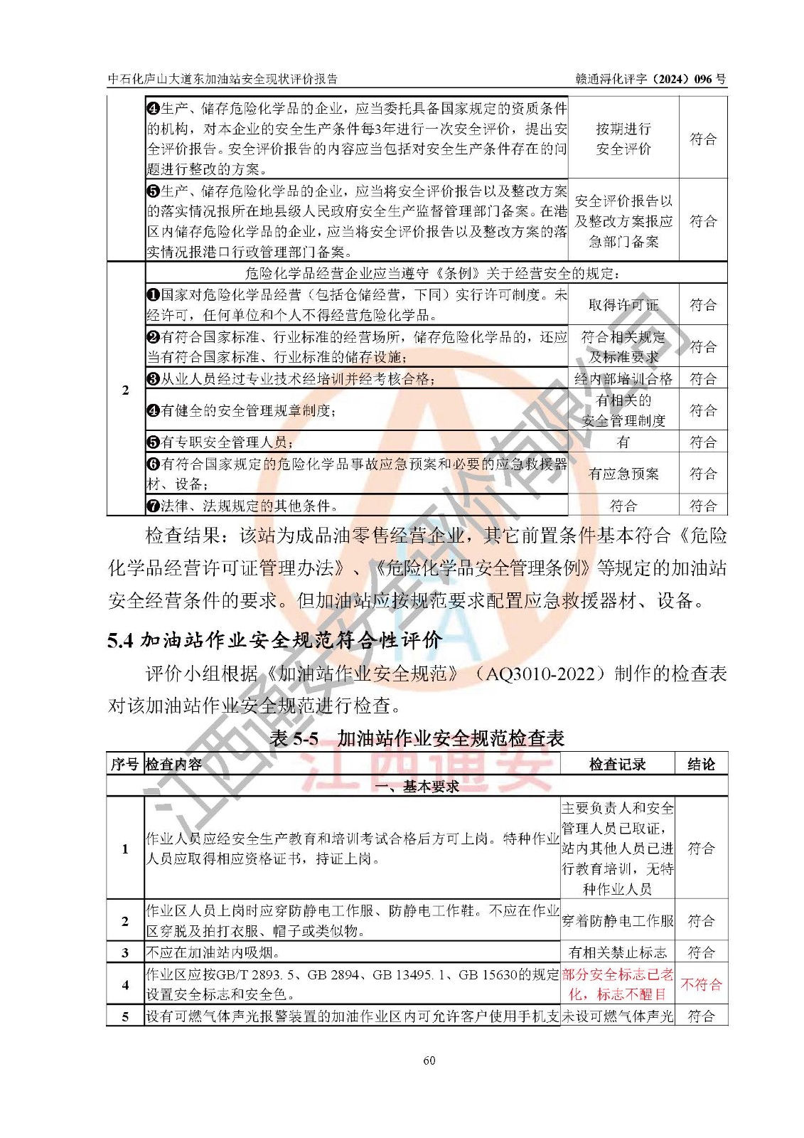 评价结论 | 中国石化销售股份有限公司江西九江濂溪石油分公司庐山大道东加油站涉及的安全条件、安全经营条件、安全生产管理符合《危险化学品经营许可证管理办法》、《汽车加油加气加氢站技术标准》等**有关法规、标准、规范要求,能满足危险化学品经营安全条件。 | |||