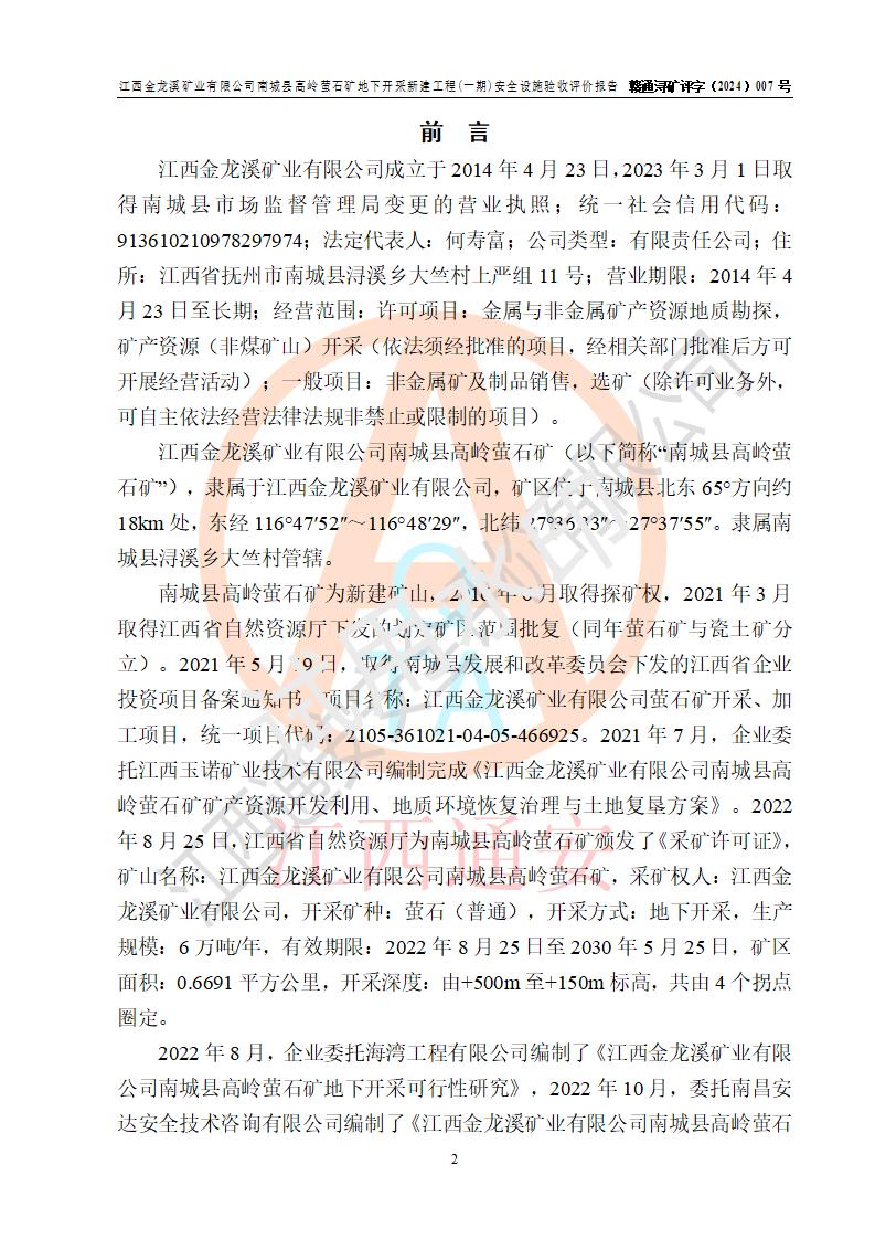 报告名称 | 江西金龙溪矿业有限公司南城县高岭萤石矿地下开采新建工程(一期)安全设施验收评价报告 | |||||