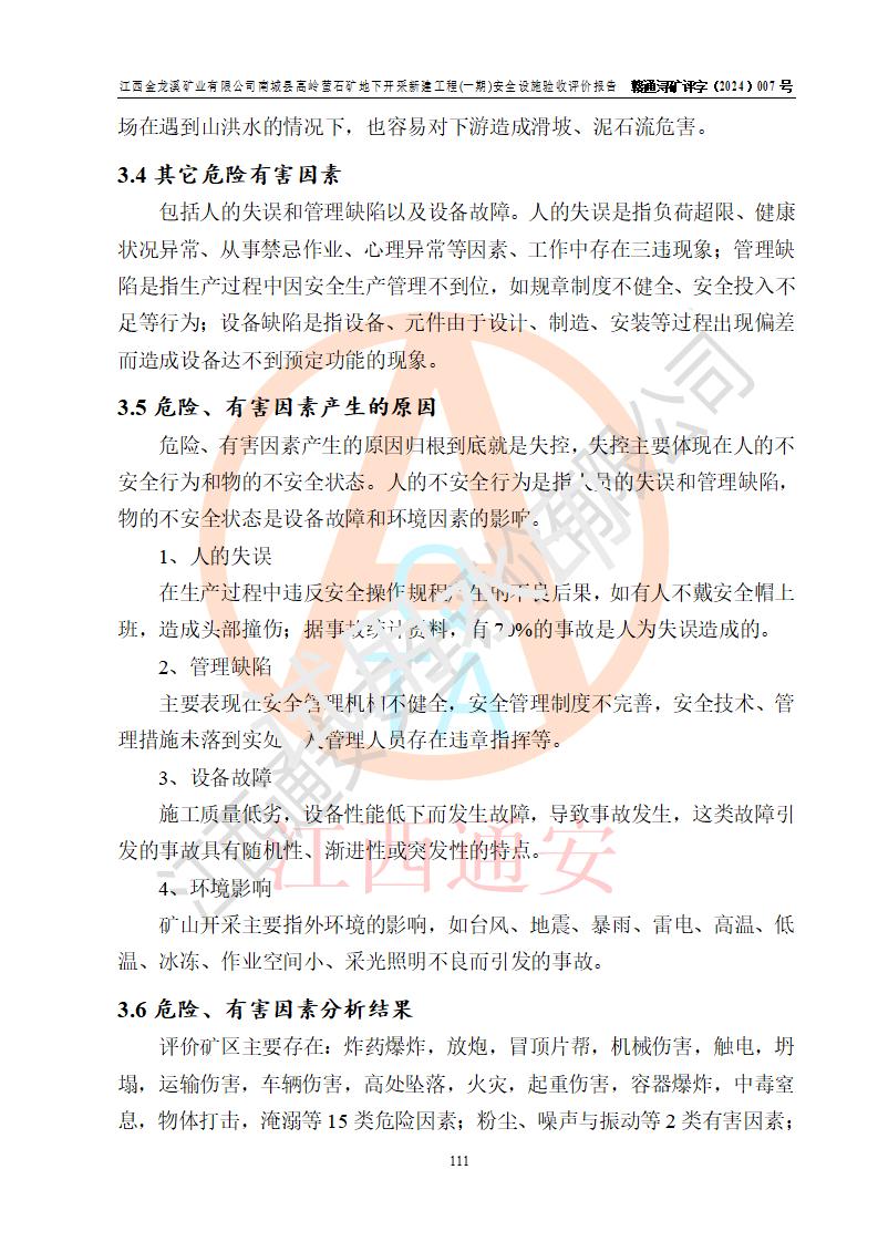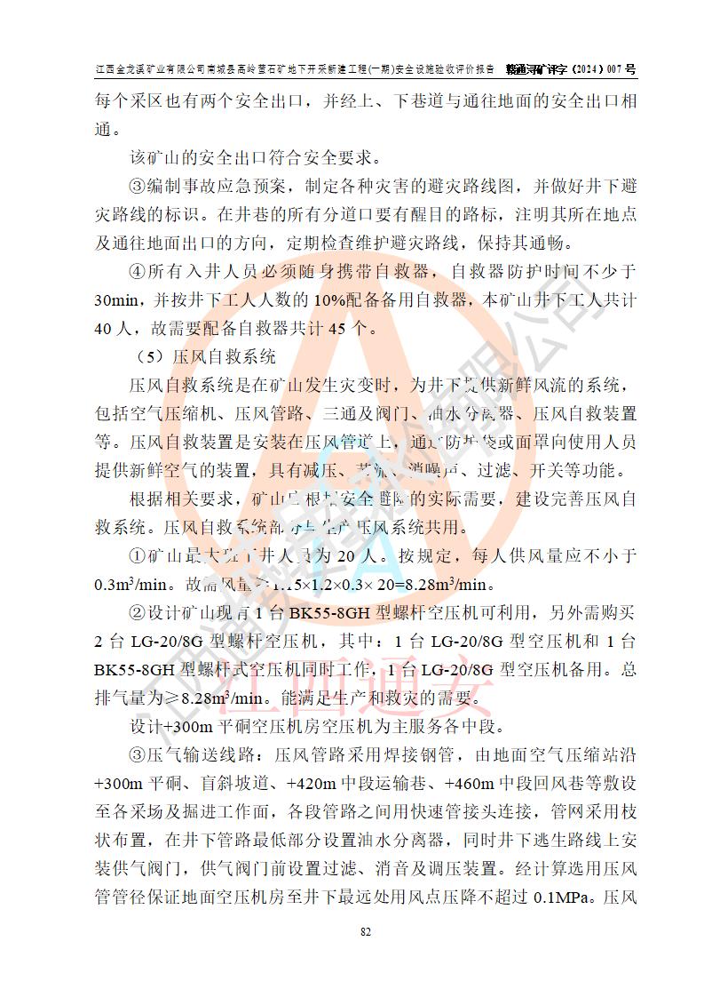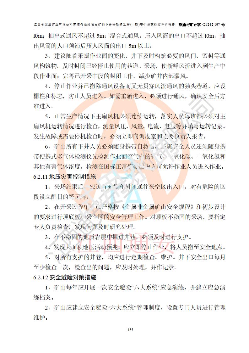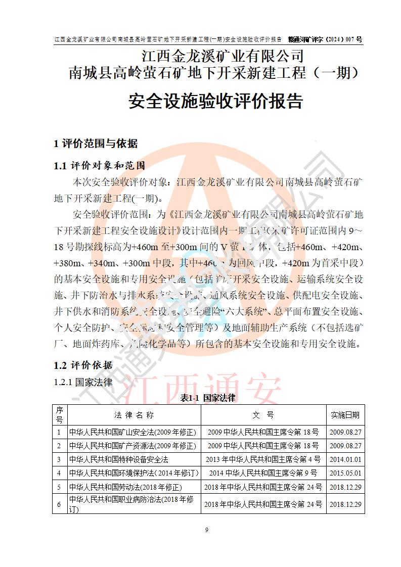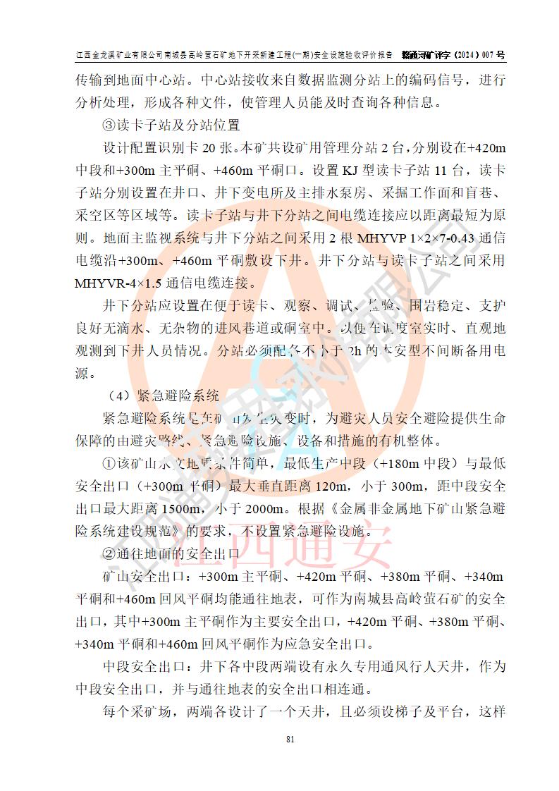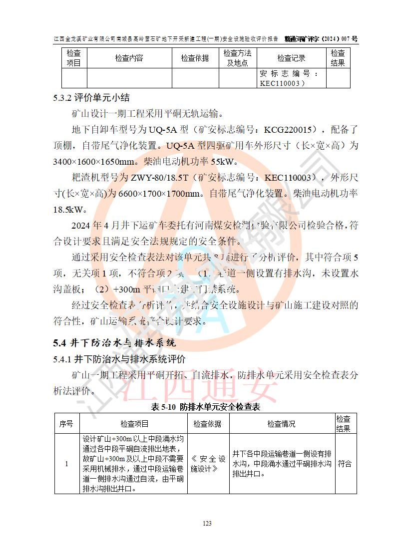 评价结论 | 江西金龙溪矿业有限公司南城县高岭萤石矿地下开采新建工程(一期)安全设施符合《江西金龙溪矿业有限公司南城县高岭萤石矿地下开采新建工程安全设施设计》及**有关法律法规、标准、规章、规范的规定要求,具备安全设施验收的条件。 | |||||