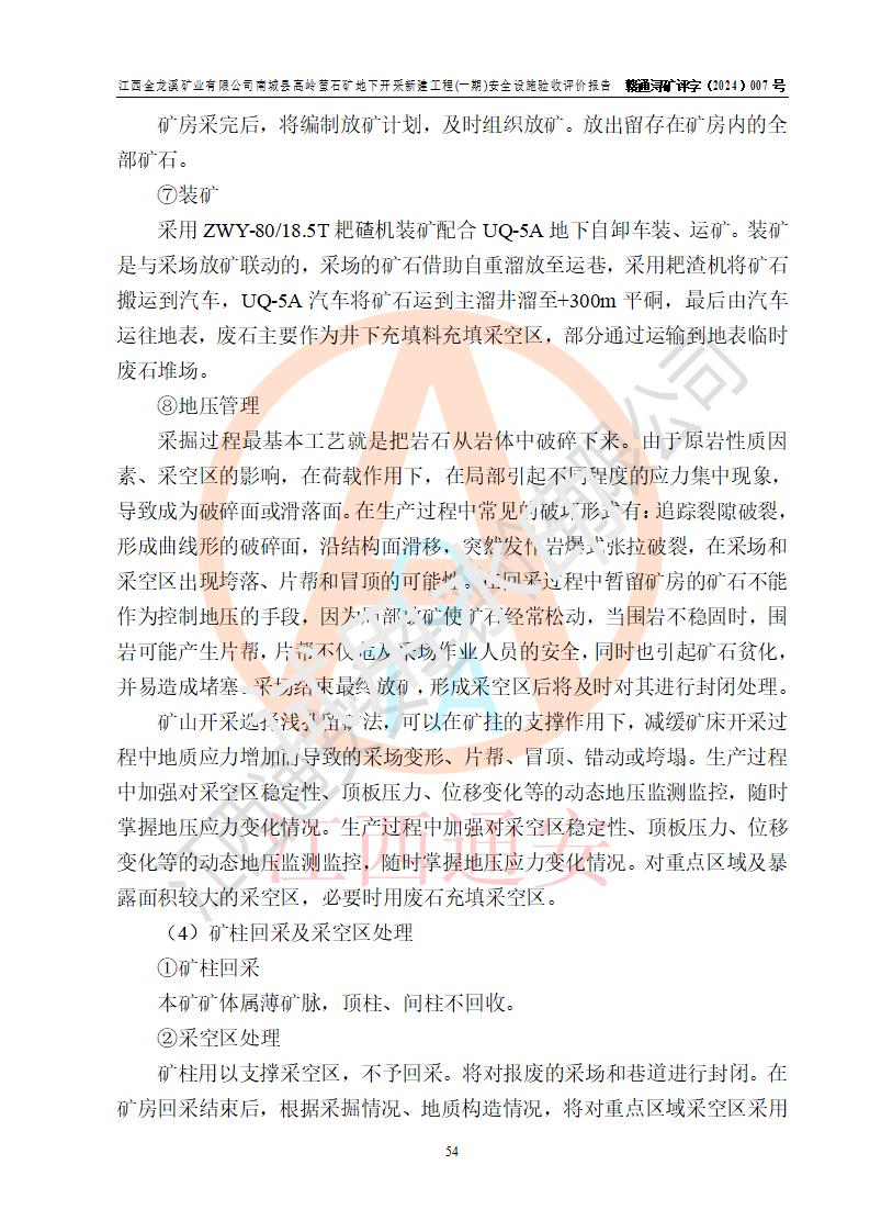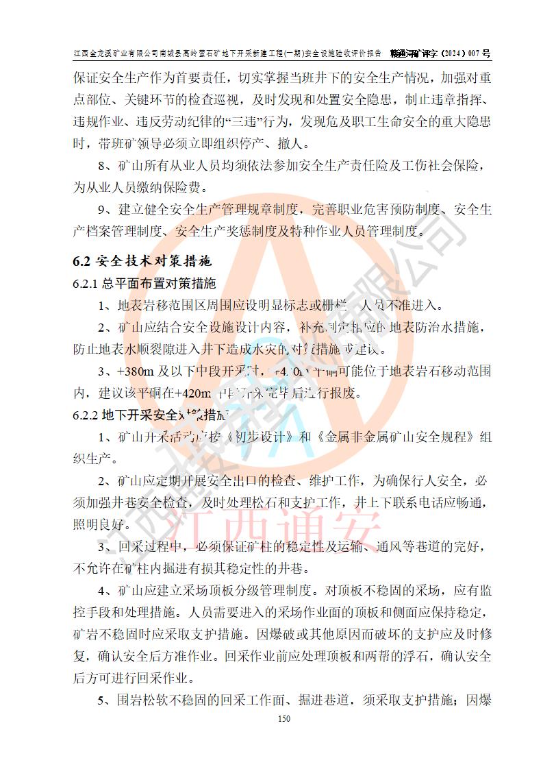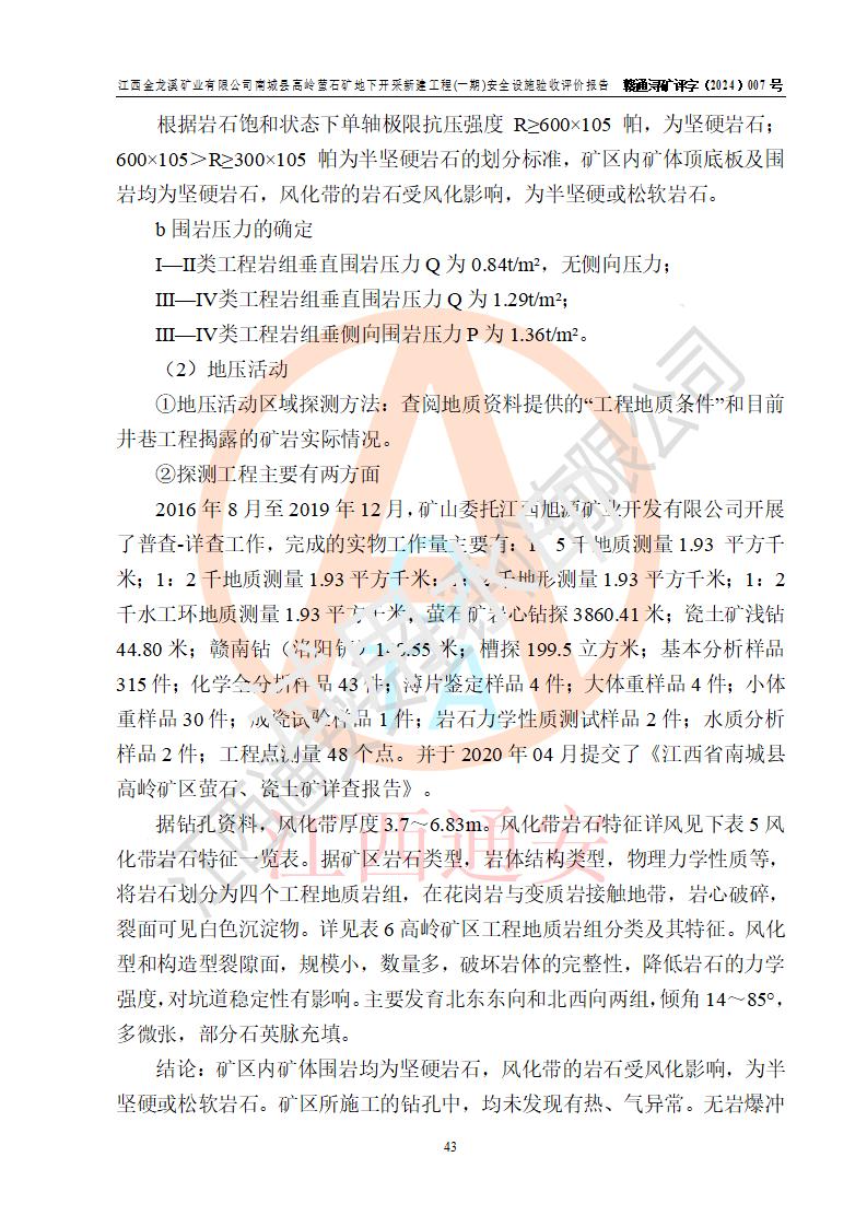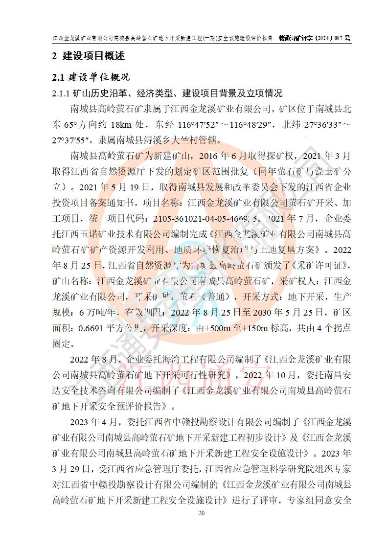 项目简介 | 江西金龙溪矿业有限公司成立于2014年4月23日,2023年3月1日取得南城县市场监督管理局变更的营业执照;统一社会信用代码:913610210978297974;法定**人:何寿富;公司类型:有限责任公司;住所:江西省抚州市南城县浔溪乡大竺村上严组11号;营业期限:2014年4月23日至长期;经营范围:许可项目:金属与非金属矿产资源地质勘探,矿产资源(非煤矿山)开采(依法须经批准的项目,经相关部门批准后方可开展经营活动);一般项目:非金属矿及制品销售,选矿(除许可业务外,可自主依法经营法律法规非禁止或限制的项目)。 江西金龙溪矿业有限公司南城县高岭萤石矿(以下简称“南城县高岭萤石矿”),隶属于江西金龙溪矿业有限公司,矿区位于南城县北东65°方向约18km处,东经116°47′52″~116°48′29″,北纬27°36′33″~27°37′55″。隶属南城县浔溪乡大竺村管辖。 南城县高岭萤石矿为新建矿山,2016年6月取得探矿权,2021年3月取得江西省自然资源厅下发的划定矿区范围批复(同年萤石矿与瓷土矿分立)。2021年5月19日,取得南城县发展和改革委员会下发的江西省企业投资项目备案通知书,项目名称:江西金龙溪矿业有限公司萤石矿开采、加工项目,统一项目代码:2105-361021-04-05-466925。2021年7月,企业委托江西玉诺矿业技术有限公司编制完成《江西金龙溪矿业有限公司南城县高岭萤石矿矿产资源开发利用、地质环境恢复治理与土地复垦方案》。2022年8月25日,江西省自然资源厅为南城县高岭萤石矿颁发了《采矿许可证》,矿山名称:江西金龙溪矿业有限公司南城县高岭萤石矿,采矿权人:江西金龙溪矿业有限公司,开采矿种:萤石(普通),开采方式:地下开采,生产规模:6万吨/年,**期限:2022年8月25日至2030年5月25日,矿区面积:0.6691平方**,开采深度:由+500m至+150m标高,共由4个拐点圈定。 2022年8月,企业委托海湾工程有限公司编制了《江西金龙溪矿业有限公司南城县高岭萤石矿地下开采可行性研究》,2022年10月,委托南昌安达安全技术咨询有限公司编制了《江西金龙溪矿业有限公司南城县高岭萤石矿地下开采安全预评价报告》。 2023年4月,委托江西省中赣投勘察设计有限公司编制了《江西金龙溪矿业有限公司南城县高岭萤石矿地下开采新建工程初步设计》及《江西金龙溪矿业有限公司南城县高岭萤石矿地下开采新建工程安全设施设计》。2023年3月29日,受江西省应急管理厅委托,江西省应急管理科学研究院组织专家对江西省中赣投勘察设计有限公司编制的《江西金龙溪矿业有限公司南城县高岭萤石矿地下开采新建工程安全设施设计》进行了评审,专家组同意安全设施设计通过评审。2023年5月12日,江西省应急管理厅下发了《关于江西金龙溪矿业有限公司南城县高岭萤石矿地下开采新建工程安全设施设计审查的批复》(赣应急非煤项目设审〔2023〕14号)。 设计开采范围为采矿证许可范围内标高+460m~+180m的V萤1矿体。采用平硐+斜坡道开拓,无轨运输。共设+460m、+420m、+380m、+340m、+300m、+260m、+220m、+180m八个中段。分两期建设,一期工程采用平硐开拓,开采标高+460m~+300m,其中+420m中段为首采中段,+460m中段为回风中段;二期工程采用平硐+盲斜坡道开拓,开采标高+300m~+180m,其中+260m中段为首采中段,+300m中段为回风中段。采矿方法为浅孔留矿法,废石充填采空区,采用中央分列式机械通风,设计生产规模为6万t/a。矿山生产服务年限为8.2a,一、二期基建期均为2a。 矿山基建一期工程项目于2023年7月正式开工,设计矿山的一期基建范围为+300m标高以上基建工程,工程量为:3145m/23338m3:其中开拓工程量:2915m/22474m3;采切工程量:230m/864m3。 截至2024年9月,矿山基本完成了一期工程井上、井下各生产辅助系统的建设工程。2024年9月20日,矿山组织相关技术人员对照安全设施设计要求及《金属非金属地下矿山建设项目安全设施竣工验收表》进行开拓工程验收。经过验收开拓工程现有的生产及生产辅助系统能够满足安全生产要求。矿山开拓工程已完成了运输系统、安全出口、通风系统、排水系统等各生产、辅助系统和安全设施的建设工程,安全避险 “六大系统”已单项验收,达到了安全设施验收评价的基本条件。 2024年9月21日以后矿山进入试生产运行阶段。试生产运行矿山各系统运行正常、安全设施齐全**,未发生人身设备事故。 | |||||