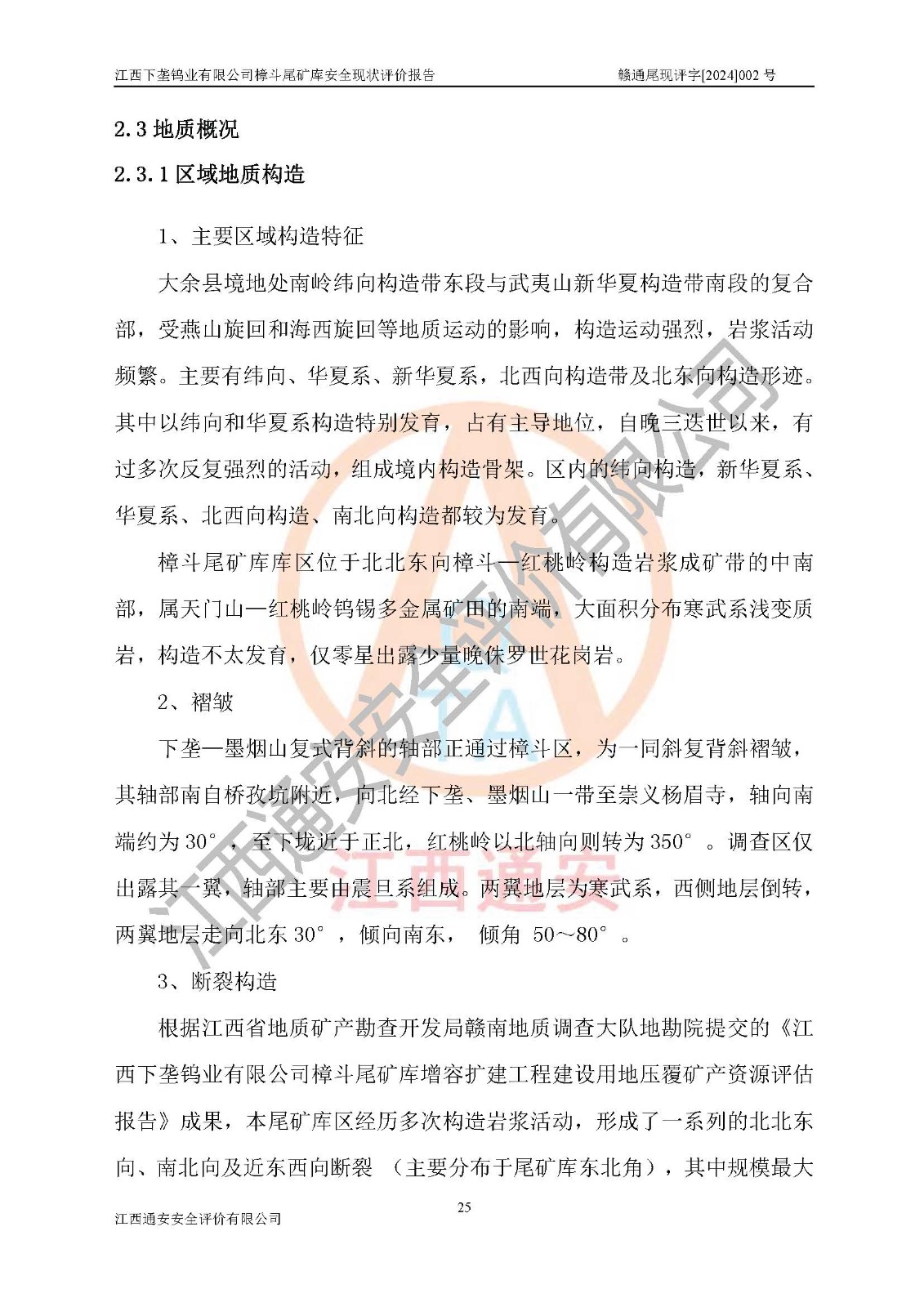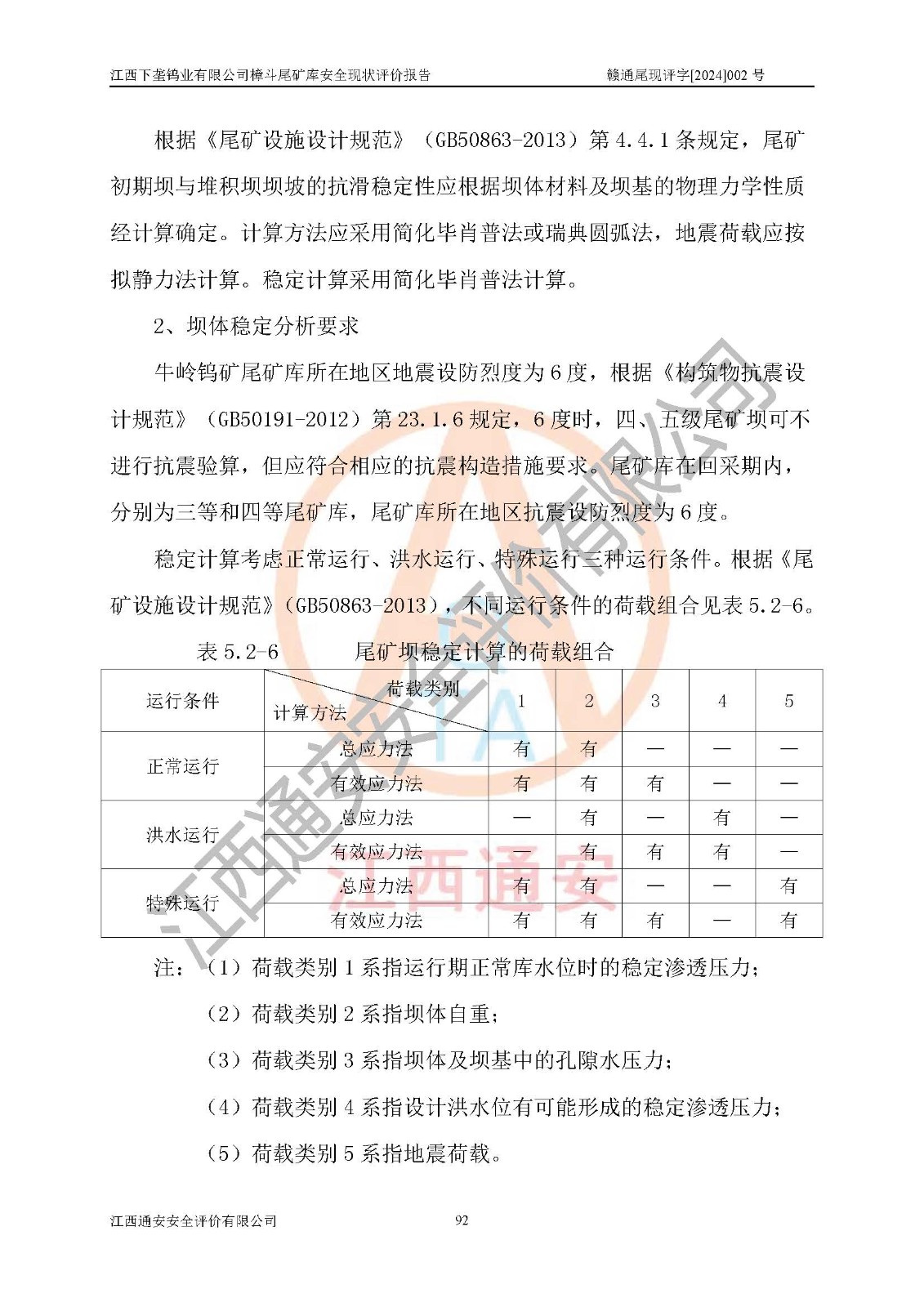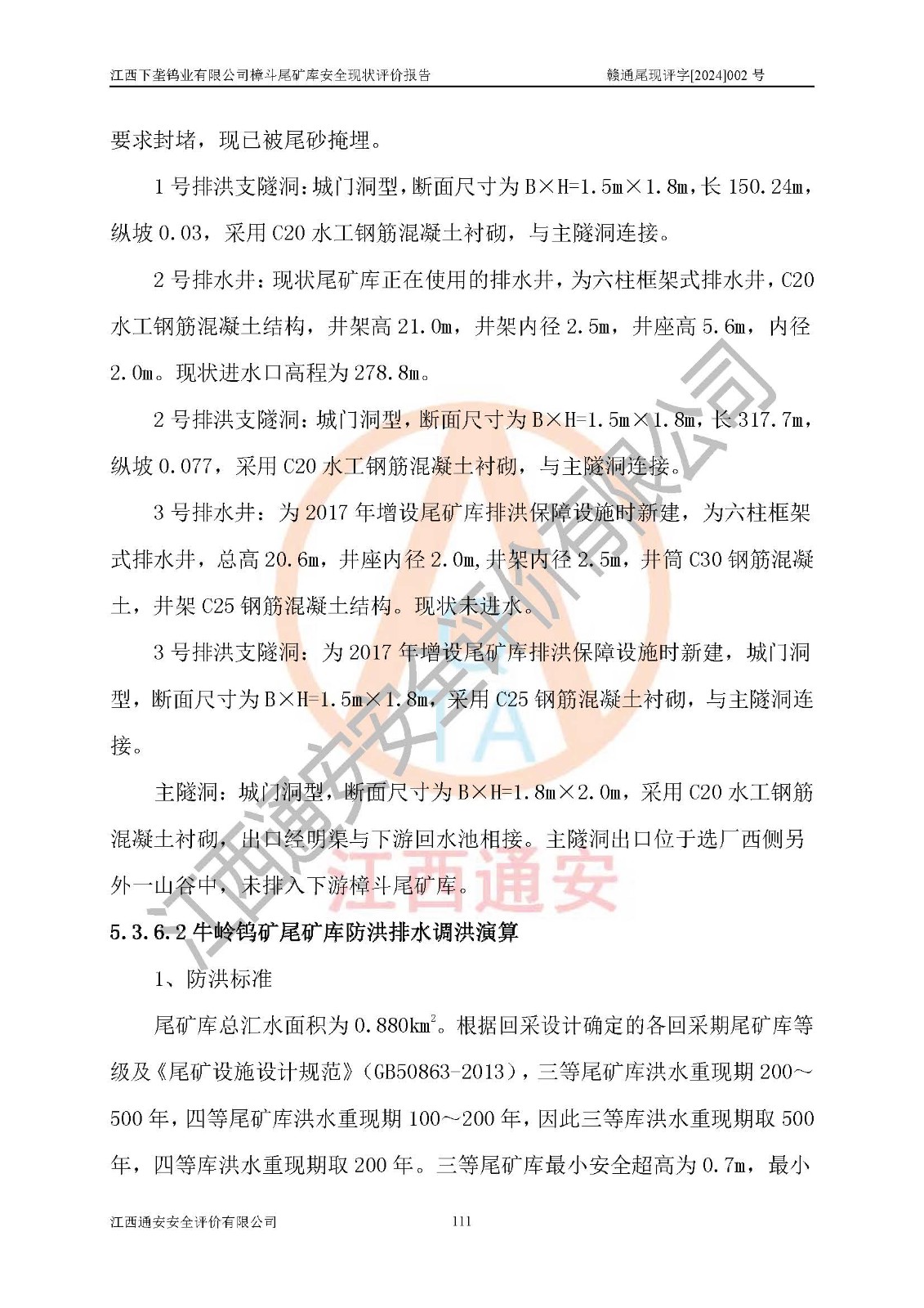 项目简介 | 江西下垄钨业有限公司的前身是下垄钨矿,1954年建成投产,现属江西钨业集团有限公司成员单位,2004年8月改制,成立公司。该公司现有两座尾矿库,大坪尾矿库已停用,樟斗尾矿库正在使用。 樟斗尾矿库位于该公司樟斗矿区,用于堆存该公司选矿厂的尾矿,现由公司选矿厂管理。其地理位置为江西省大余县樟斗镇樟斗村,地理座标为东经114025′16″,北纬25033′08″。樟斗矿区距大余县城25㎞,距京九铁路南康车站36㎞,距赣韶公路(323国道)新城车站15㎞,矿区有水泥公路与之相通,交通方便。 樟斗尾矿库始建于1963年,1982年进行改造,2012年进行隐患综合治理,采用上游式堆坝,属山谷型,因尾矿库下游有居民提等为二等尾矿库。总坝高69m,设计总库容730×104m3,**库容561.0×104m3,已入库尾矿总量258×104m3,尚剩余**库容303.0×104m3。2023年7月19日樟斗尾矿库取得了江西省应急管理厅变更换发的安全生产许可证,证书编号(赣)FM安许证字[2006]M0222号,**期从2021年03月16日到2024年03月15日,为三年期,依照《非煤矿矿山企业安全生产许可证延期换证工作》的通知,根据***《安全生产许可证条例》、《江西省安全生产条例》、《非煤矿山安全生产许可证实施办法》、《江西省非煤矿矿山企业安全生产许可证办法》规定及非煤矿山安全评价导则的要求,受江西下垄钨业有限公司委托,我公司承担樟斗尾矿库证延期换证的安全现状评价工作。 | |||
