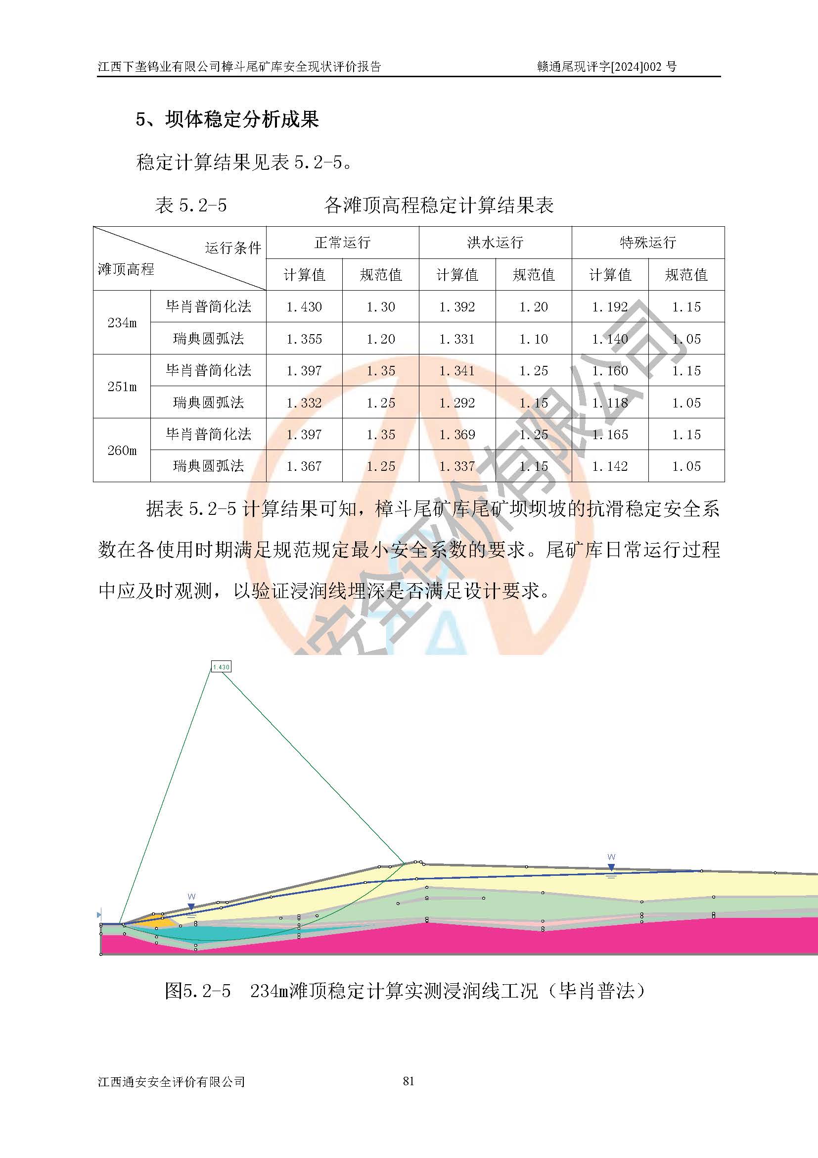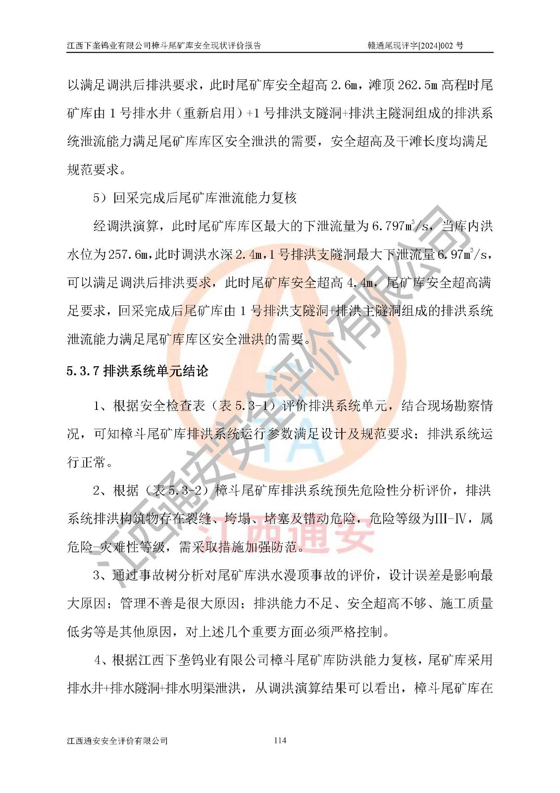 评价结论 | 江西下垄钨业有限公司樟斗尾矿库安全生产条件较好,为正常库,具备继续生产运行的安全生产条件。 | |||