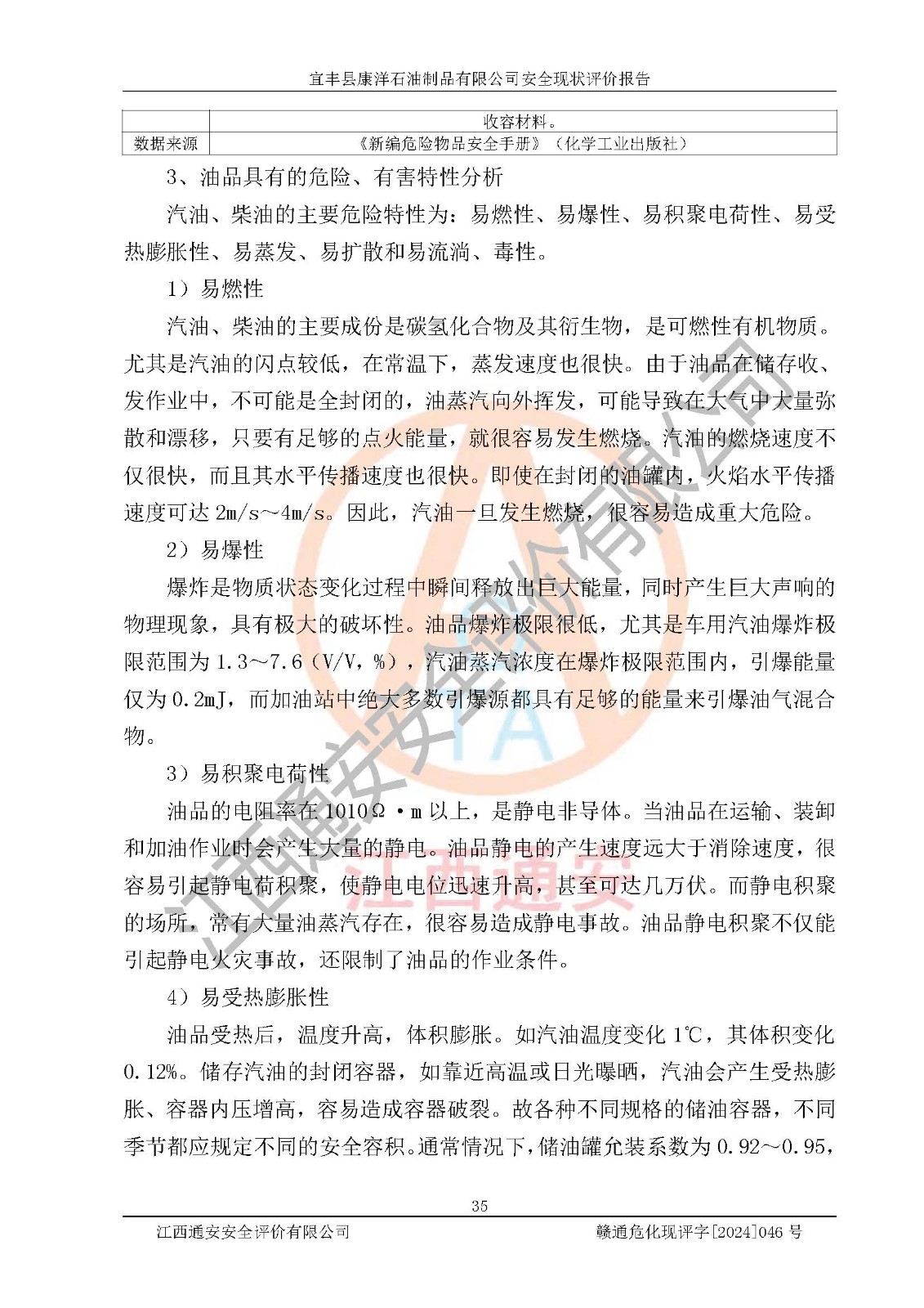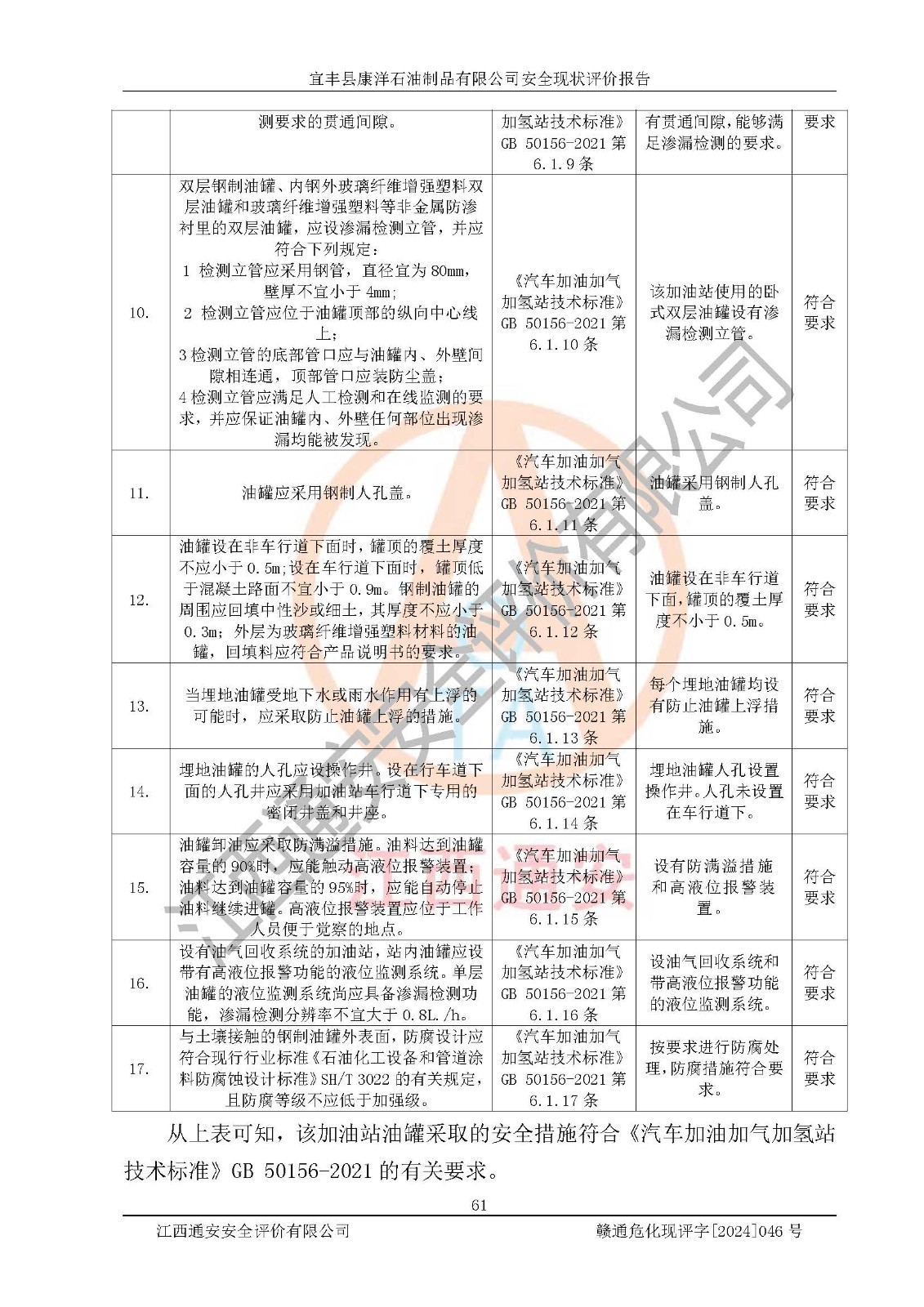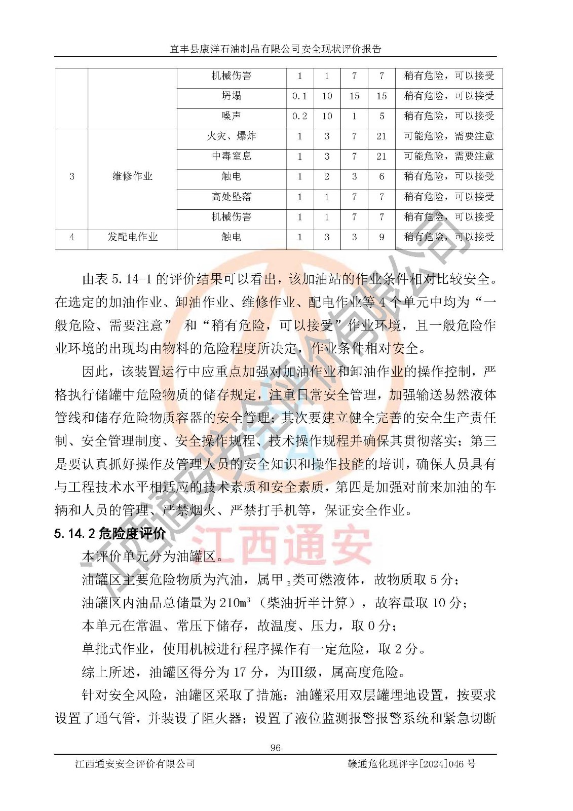 该企业属三级加油站,主要从事成品油零售经营,经营的油品有0#柴油、92#汽油和95#汽油。 该项目为一功能集中的加油站,且设备设施集中在站区内,根据空间相对独立、事故范围相对固定、具有明显特征界限的原则,评价小组确定将其划分为一个评价单元。选择安全检查表法和危险指数方法进行评价。 1、加油站涉及的汽油、柴油属于易燃液体,汽油属于重点监管的危险化学品;不构成《危险化学品重大危险源辨识》规定危险化学品重大危险源。 2、经营过程中存在的主要危险有:火灾、爆炸等。 3、该站的选址、自然条件、总体布局、周边环境符合《建筑设计防火规范》、《汽车加油加气站设计与施工规范》的要求。 4、采用检查表法评价,该站总体上符合零售经营成品油的安全经营条件。 5、经采用危险度评价法分析,油罐区主要危险物质为汽油,属甲B类可燃液体,故物质取5分;油罐区内油总储量为210m³(柴油折半计算),故容量取10分;本单元在常温、常压下储存,故温度、压力,取0分;单批式作业,使用机械进行程序操作有**危险,取2分。油罐区得分为17分,为I级,属**危险。针对安全风险,油罐区采取了措施:油罐采用双层罐,埋地设置,按要求设置了通气管,并装设了阻火器;设置了液位监测报警报警系统和紧急切断系统,其安全风险可控。 6、企业在完善评价报告表6.3-1中企业存在的问题后,其涉及的安全条件、安全经营条件、安全生产管理、应急管理符合《危险化学品经营许可证管理办法》、《汽车加油加气站设计与施工规范》等**有关法规、标准、规范要求,可以满足危险化学品经营安全条件。 |