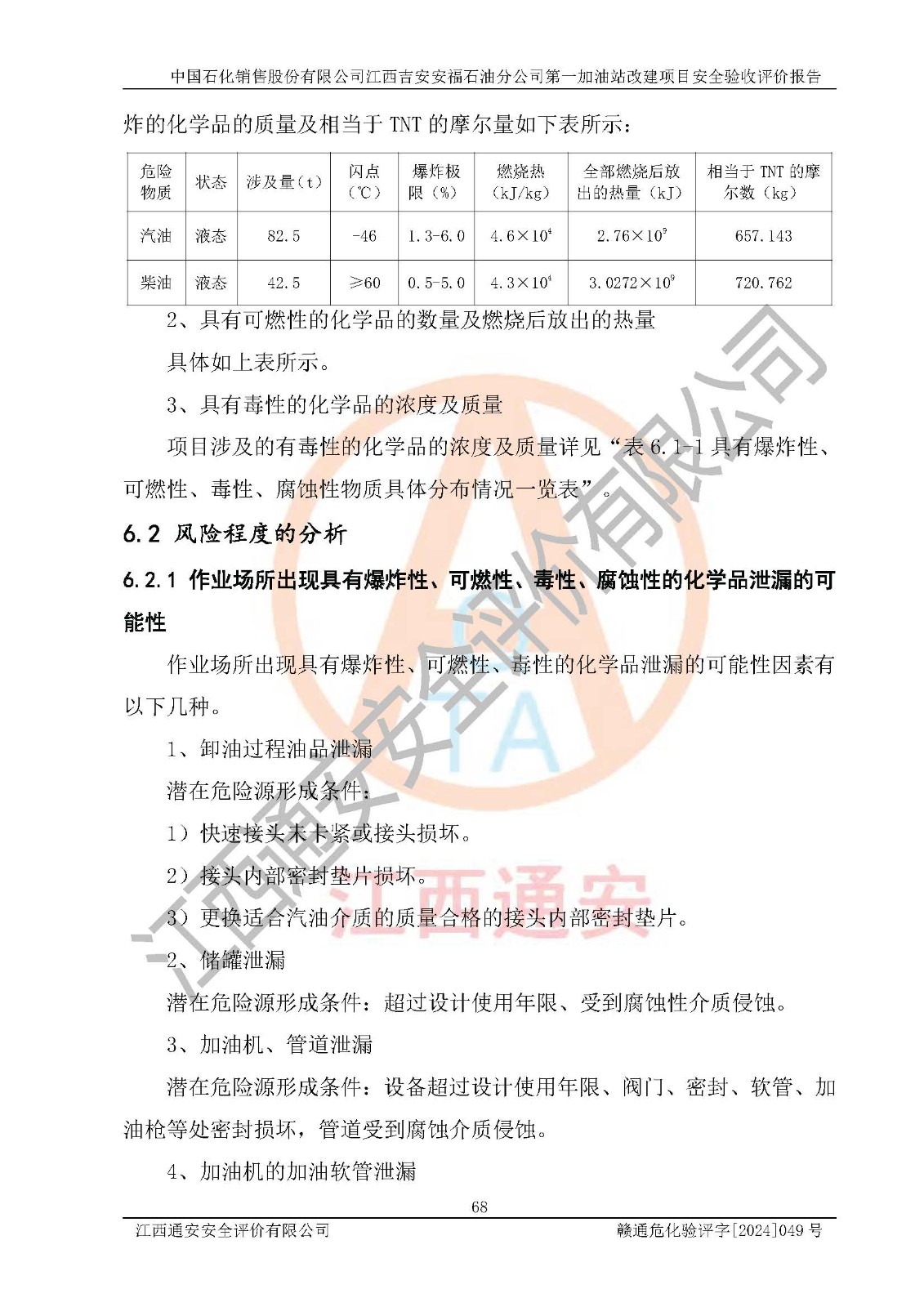 项目简介 | 中国石化销售股份有限公司江西吉安安福石油分公司**加油站成立于1994年4月12日,类型:外商投资企业分公司;负责人:彭璐;经营场所为江西省吉安市安福县城安莲路一**。该公司营业执照经营范围:许可项目:危险化学品经营,成品油仓储,成品油零售,成品油零售(不含危险化学品),**类增值电信业务,第二类增值电信业务,第三类医疗器械经营,出版物零售,**代理业务,***零售,发电业务、输电业务,供(配)电业务,互联网直播技术服务,酒类经营,食品销售,小食杂,网络文化经营,药品零售,燃气经营,烟草制品零售,出版物批发,旅游业务,住宿服务,餐饮服务,港口经营,保税仓库经营,保税物流中心经营(依法须经批准的项目,经相关部门批准后在许可**期内方可开展经营活动,具体经营项目和许可期限以有关部门批准文件或许可证件为准)一般项目:成品油批发(不含危险化学品),办公设备销售,电池销售,成品油仓储(不含危险化学品),轮胎销售,**类医疗器械销售,第二类医疗器械销售,低温仓储(不含危险化学品等需许可批准的项目),电动自行车销售,宠物食品及用品批发,电动汽车充电基础设施运营,非电力家用器具销售,化妆品批发,化妆品零售,个人卫生用品销售,会议及展览服务,金银制品销售,集中式**充电站,普通货物仓储服务(不含危险化学品等需许可批准的项目),人力资源服务(不含职业中介活动、劳务派遣服务),食品互联网销售(仅销售预包装食品),食用农产品销售,外卖递送服务,消毒剂销售(不含危险化学品),新能源汽车换电设施销售,站用加氧及储氢设施销售,钟表销售,**化学产品销售(不含危险化学品),保健食品(预包装)销售,针纺织品销售,服装服饰零售,日用品销售,五金产品零售,家用电器销售,单用途商业预付卡代理销售、电子产品销售,润滑油销售,石油制品销售,(不含危险化学品),户外用品销售,汽车销售,摩托车及零配件批发。摩托车及零配件零售,农副产品销售,化肥销售,农用薄膜销售,安防设备销售,礼品花卉销售,计算机软硬件及辅助设备零售,橡胶制品销售,机械设备销售,珠宝首饰批发,玩具销售,乐器批发,乐器零售,家具销售,建筑材料销售,机动车充电销售,技术服务、技术开发,技术咨询、技术交流、技术**,技术推广,机动车修理和维护,物业管理,停车场服务,居民日常生活服务,票务代理服务,广告制作,广告发布,广告设计、代理,洗车服务,信息咨询服务(不含许可类信息咨询服务),软件开发,货物进出口,食品进出口,技术进出口,进出口代理,汽车装饰用品销售,租赁服务(不含许可类租赁服务),小微型客车租赁经营服务(依法须经批准的项目,经相关部门批准后方可开展经营活动)。 该加油站于2024年4月29日经吉安市商务局核准变更换发成品油零售经营批准证书,证书编号:油零售证书第吉0338号。**期由2024年4月29日至2029年4月28日。于2022年12月23日由安福县应急管理局延期发放危险化学品经营许可证,证书编号:赣吉安经(甲)【2013】000095。**期由2022年12月23日至2025年12月22日。 为提升优化加油站的整体布局,在保障加油站站内设施与站外建(构)筑物安全间距条件下,更好满足运营服务的需求,中国石化销售股份有限公司江西吉安安福石油分公司**加油站决定在原址基础上进行改建,并于2023年5月4日获得安福县发展和改革委员会盖章的《江西省企业投资项目备案通知书》,同意该站在原址上改建。 该加油站改建前设有4个SF双层埋地储罐,分别为:1台50m³92#汽油双层埋地储罐,1台30m³的95#汽油双层埋地储罐;1 台50m³的0#柴油双层埋地储罐;1台30m³的98#汽油双层埋地储罐,柴油折半后总容积为 135 m³,属二级加油站。设有3台4枪潜油泵加油机,1台双枪潜油泵加油机,分别为:1台92#汽油/98#汽油/92#汽油/95#汽油4枪加油机,1台0#柴油/0#柴油双枪加油机,1台92#汽油/95#汽油/92#汽油/95#汽油4枪加油机,1台98#汽油/92#汽油/95#汽油/92#汽油4枪加油机。 改建后情况如下:将油罐区从站房左侧埋地移位至罩棚右侧承重埋地,洗车机从站区出口处移位至站区**处。型号大小不变,位置发生改变,加油站内其他设施利旧。更换后设置4台SF双层埋地储罐,其中包括:1台50m³92#汽油双层埋地储罐,1台30m³的95#汽油双层埋地储罐;1 台50m³的0#柴油双层埋地储罐;1台30m³的98#汽油双层埋地储罐,柴油折半后总容积为 135 m³,属二级加油站,加油站等级未发生变化。设有3台4枪潜油泵加油机,1台双枪潜油泵加油机,分别为:1台92#汽油/98#汽油/92#汽油/95#汽油4枪加油机,1台0#柴油/0#柴油双枪加油机,1台92#汽油/95#汽油/92#汽油/95#汽油4枪加油机,1台98#汽油/92#汽油/95#汽油/92#汽油4枪加油机。 中国石化销售股份有限公司江西吉安安福石油分公司**加油站2023年8月委托江西赣安安全生产科学技术咨询服务中心编制《中国石化销售股份有限公司江西吉安安福石油分公司**加油站改建项目安全预评价报告》,并于2023年8月29日取得《危险化学品建设项目安全条件备案告知意见书》(安福危化项目安条审字[2023]01号)。 中国石化销售股份有限公司江西吉安安福石油分公司**加油站2023年9月委托天津中德工程设计有限公司编制《中国石化销售股份有限公司江西吉安安福石油分公司**加油站改建项目安全设施设计》,并于2023年11月23日取得《危险化学品建设项目安全设施设计审查意见书》(安福危化项目安设审字〔2023〕01号)。 | ||||