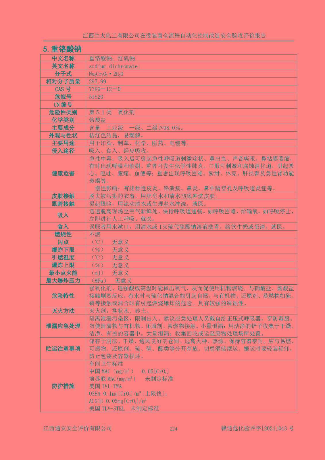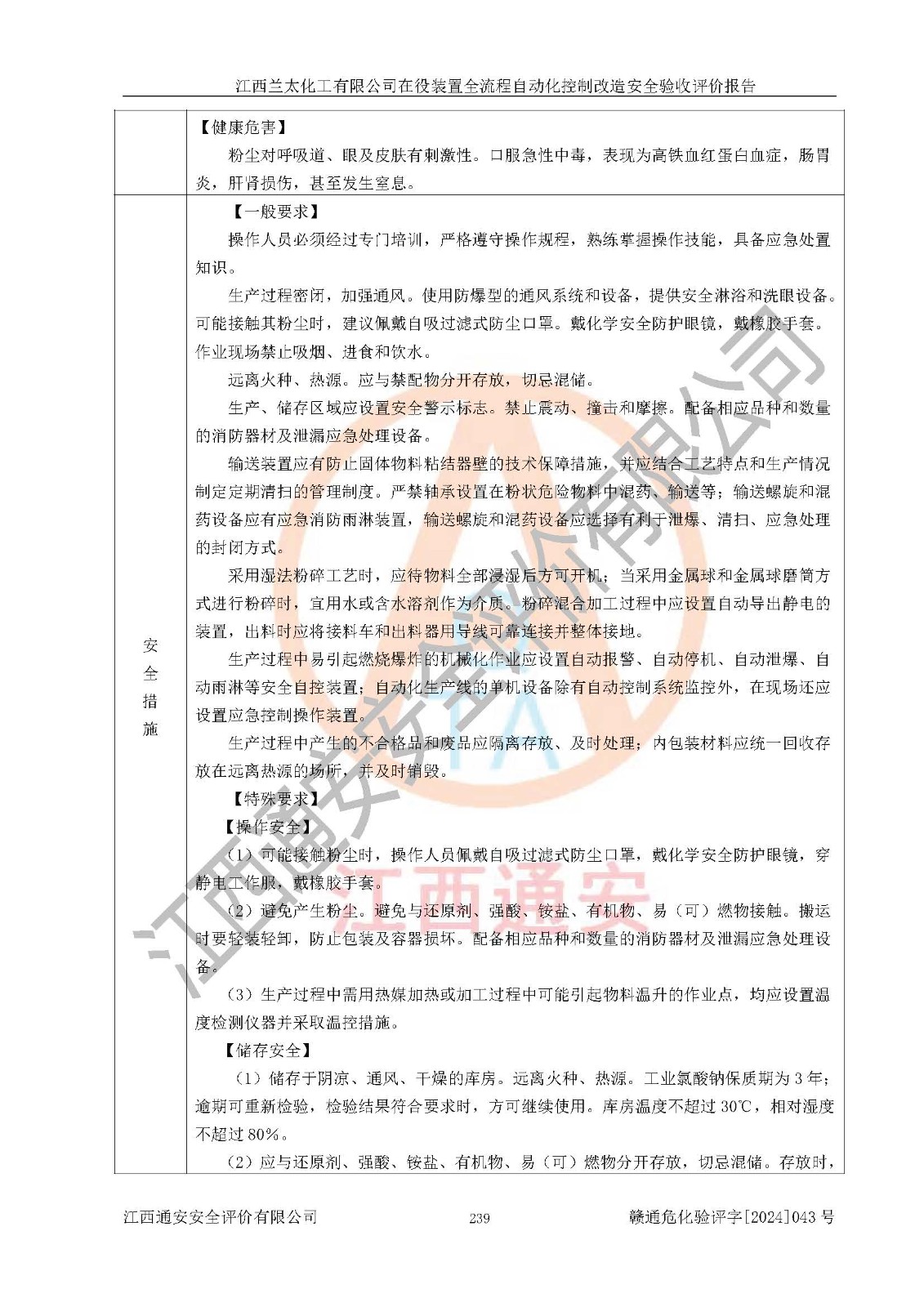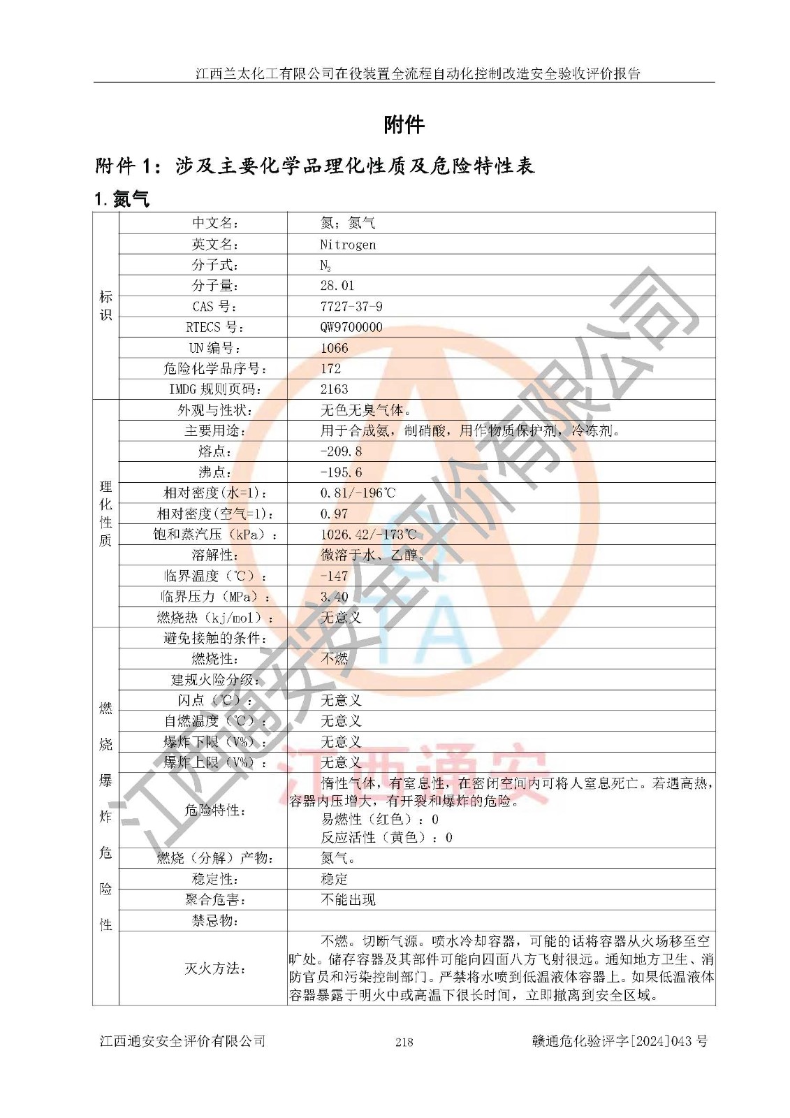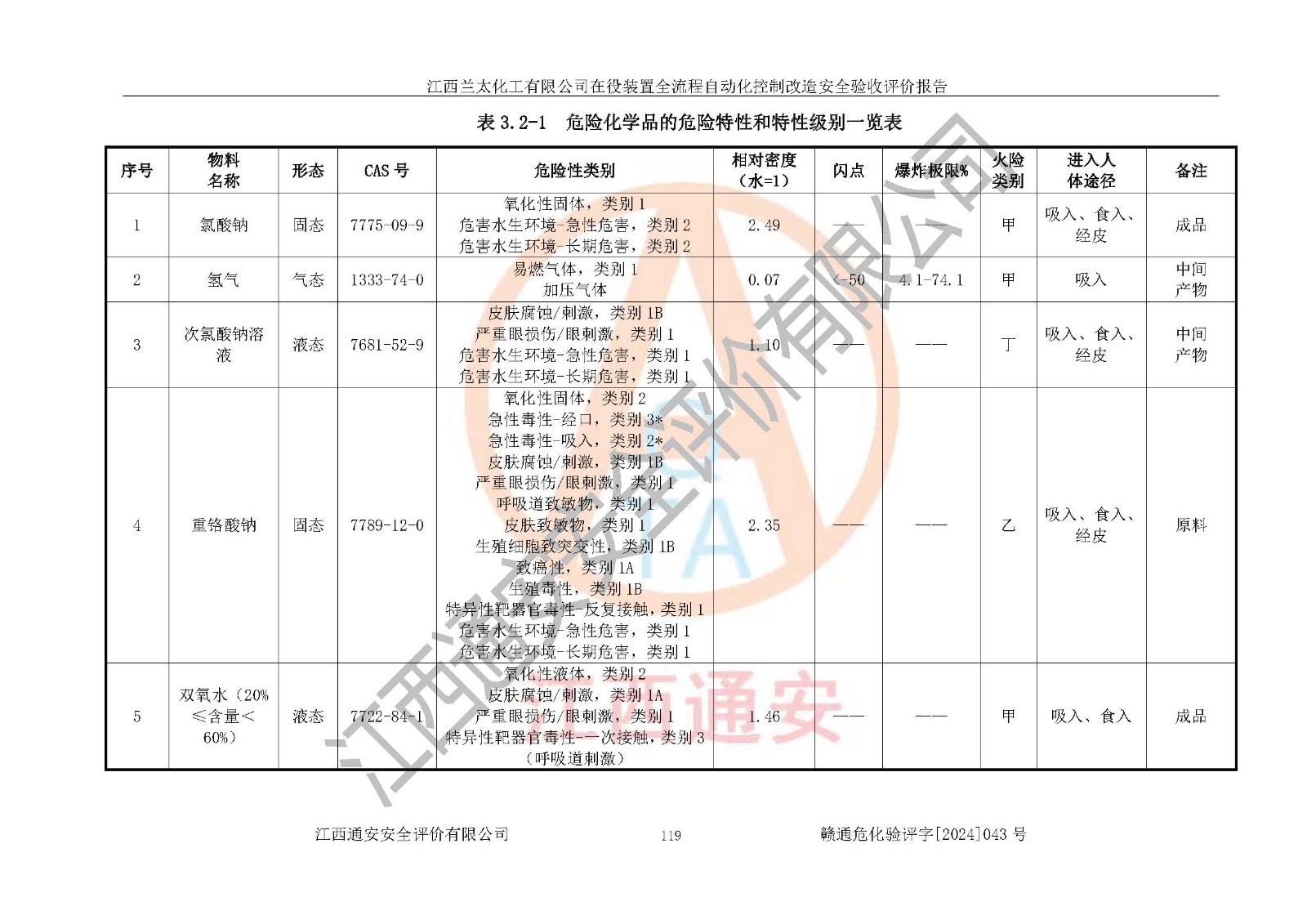 江西兰太化工有限公司于2008年5月成立,公司位于江西省吉安市新干县盐化工业城北区,公司法人**:李威。公司类型:有限责任公司(自然人投资或控股)。江西兰太化工有限公司是一家氯酸钠、双氧水产品的生产、销售(凭许可证**期限经营);化工产品(不含化学危险品及易制毒化学品)批发及零售;进出口经营权。(依法须经批准的项目经相关部门批准后方可开展经营活动)的有限责任公司。 江西兰太化工有限公司现有安全生产许可证**期至2024年8月30日,证书编号:(赣) WH 安许证字【2012】 0714 号,许可范围:氯酸钠 (50kt/a ) 、双氧水 (27.5%、 35% 、50% ,折合 27.5% 、150kt/a )。 项目生产过程中涉及的物料和成品中属于危险化学品的有:氯酸钠、双氧水、氯化氢、氢气、次氯酸钠、重铬酸钠、氯气(尾气产生微量)、氢氧化钠、盐酸、磷酸、氮气[压缩的]、芳烃(以**苯为主)、柴油(柴油发电机使用)等。项目涉及的盐酸属于第三类易制毒化学品。不涉及的重点监管的危险化学品。该工程涉及的氯气(尾气产生微量)属于剧毒化学品。该工程涉及的氯气(尾气产生微量)、重铬酸钠属于高毒物品。该工程涉及的重铬酸钠、氯酸钠、双氧水属于易制爆化学品。项目氯酸钠生产过程中的电解反应和双氧水生产过程的氢化反应、过氧化反应均为重点监管的危险化工工艺。公司201罐区构成三级危险化学品重大危险源,202氯酸钠危险化学品仓库、205氯酸钠危险化学品仓库、206氯酸钠危险化学品仓库分别构成四级危险化学品重大危险源。 |