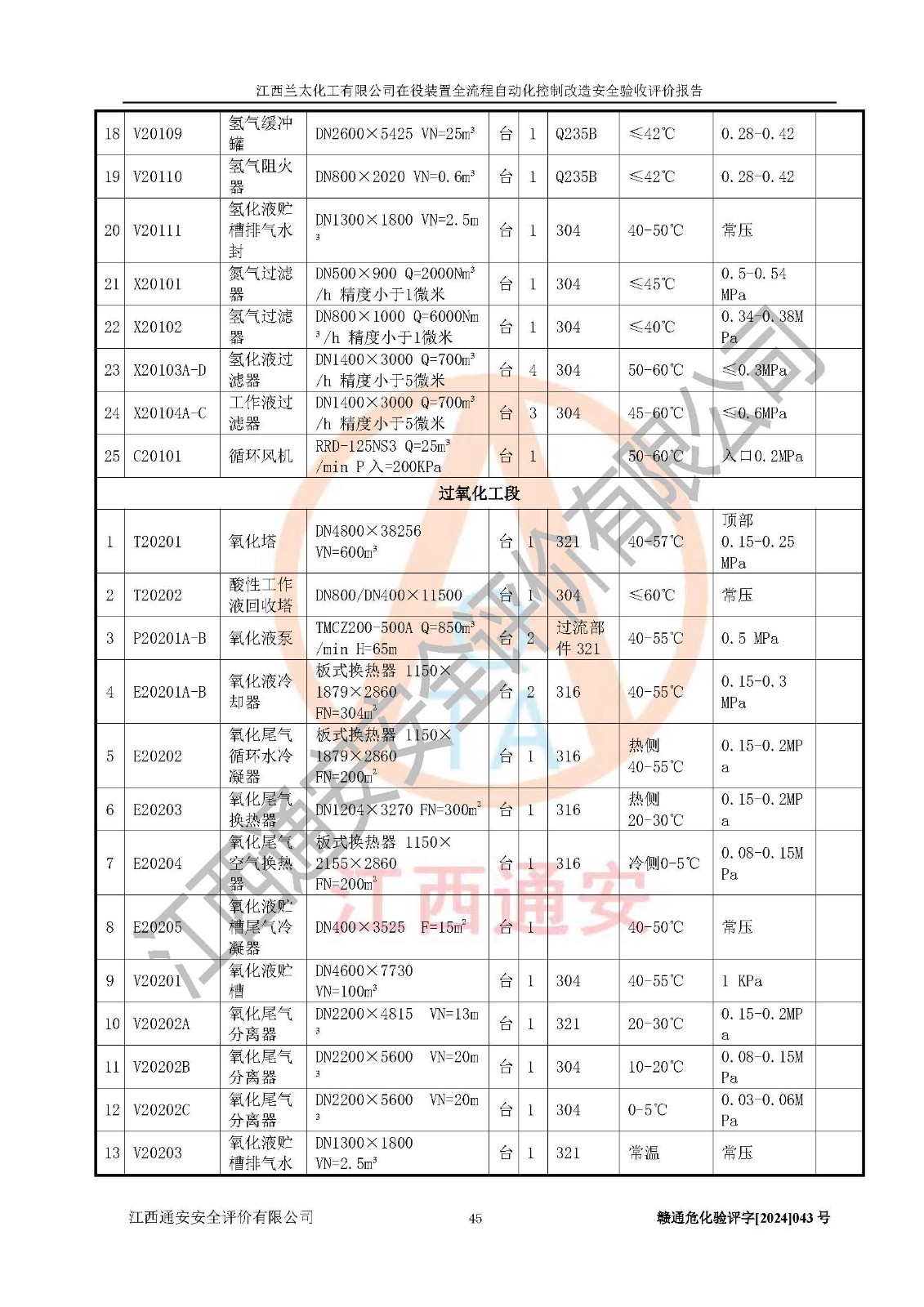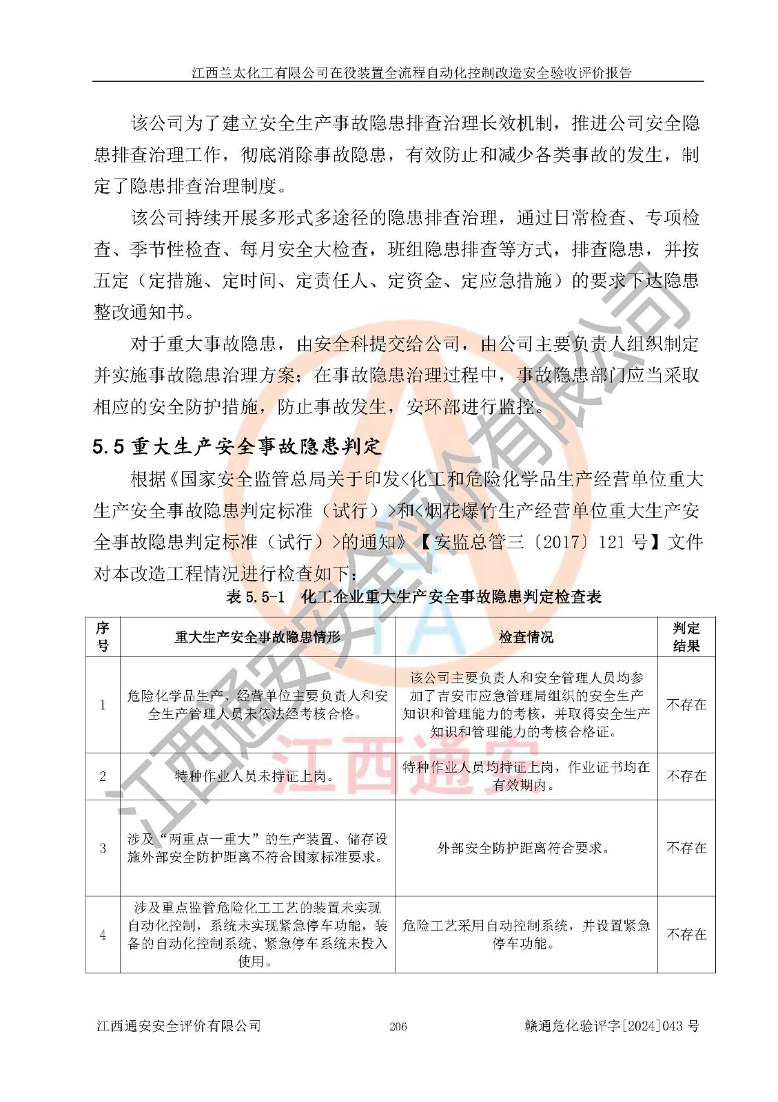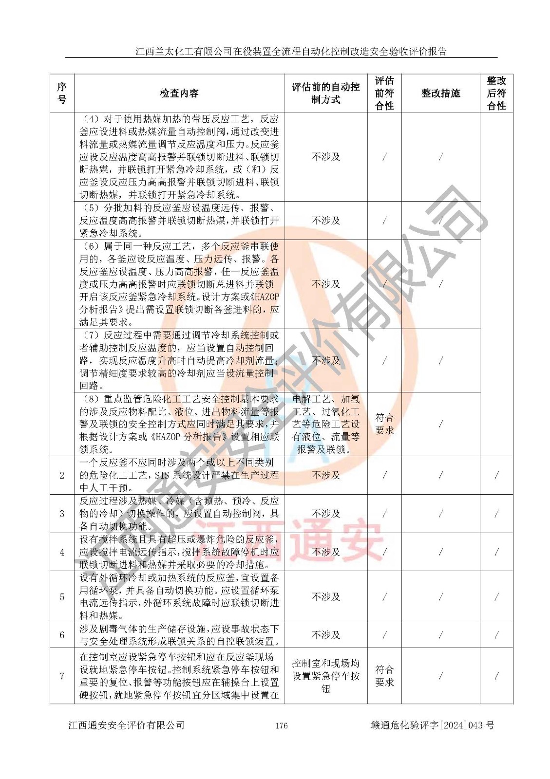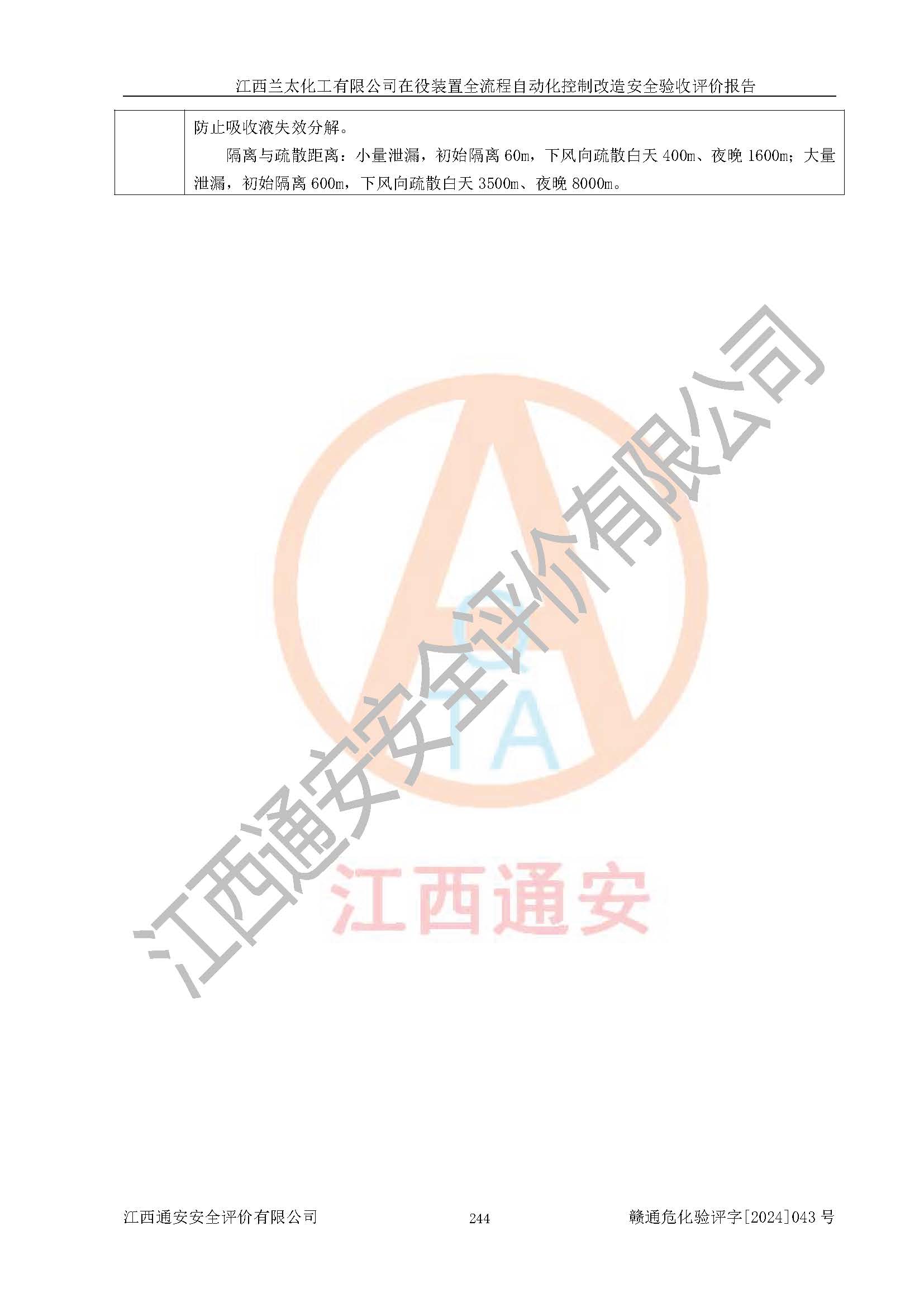 江西兰太化工有限公司于2008年5月成立,公司位于江西省吉安市新干县盐化工业城北区,公司法人**:李威。公司类型:有限责任公司(自然人投资或控股)。江西兰太化工有限公司是一家氯酸钠、双氧水产品的生产、销售(凭许可证**期限经营);化工产品(不含化学危险品及易制毒化学品)批发及零售;进出口经营权。(依法须经批准的项目经相关部门批准后方可开展经营活动)的有限责任公司。 江西兰太化工有限公司现有安全生产许可证**期至2024年8月30日,证书编号:(赣) WH 安许证字【2012】 0714 号,许可范围:氯酸钠 (50kt/a ) 、双氧水 (27.5%、 35% 、50% ,折合 27.5% 、150kt/a )。 项目生产过程中涉及的物料和成品中属于危险化学品的有:氯酸钠、双氧水、氯化氢、氢气、次氯酸钠、重铬酸钠、氯气(尾气产生微量)、氢氧化钠、盐酸、磷酸、氮气[压缩的]、芳烃(以**苯为主)、柴油(柴油发电机使用)等。项目涉及的盐酸属于第三类易制毒化学品。不涉及的重点监管的危险化学品。该工程涉及的氯气(尾气产生微量)属于剧毒化学品。该工程涉及的氯气(尾气产生微量)、重铬酸钠属于高毒物品。该工程涉及的重铬酸钠、氯酸钠、双氧水属于易制爆化学品。项目氯酸钠生产过程中的电解反应和双氧水生产过程的氢化反应、过氧化反应均为重点监管的危险化工工艺。公司201罐区构成三级危险化学品重大危险源,202氯酸钠危险化学品仓库、205氯酸钠危险化学品仓库、206氯酸钠危险化学品仓库分别构成四级危险化学品重大危险源。 |