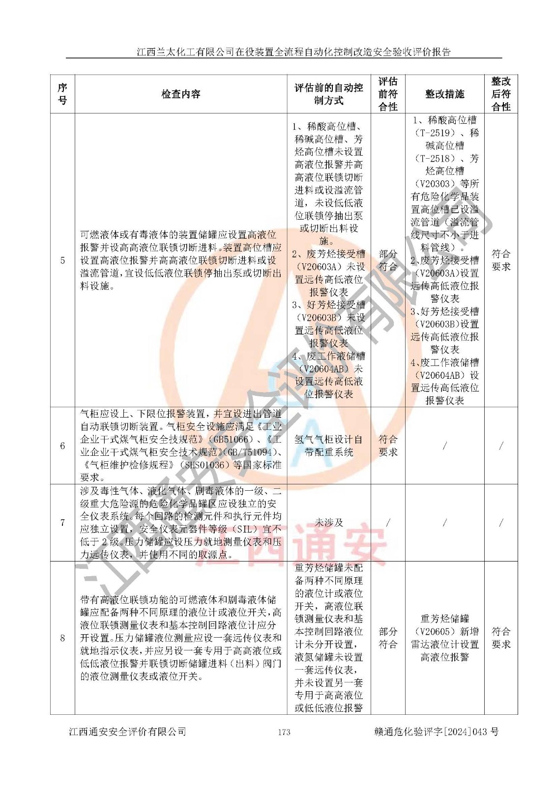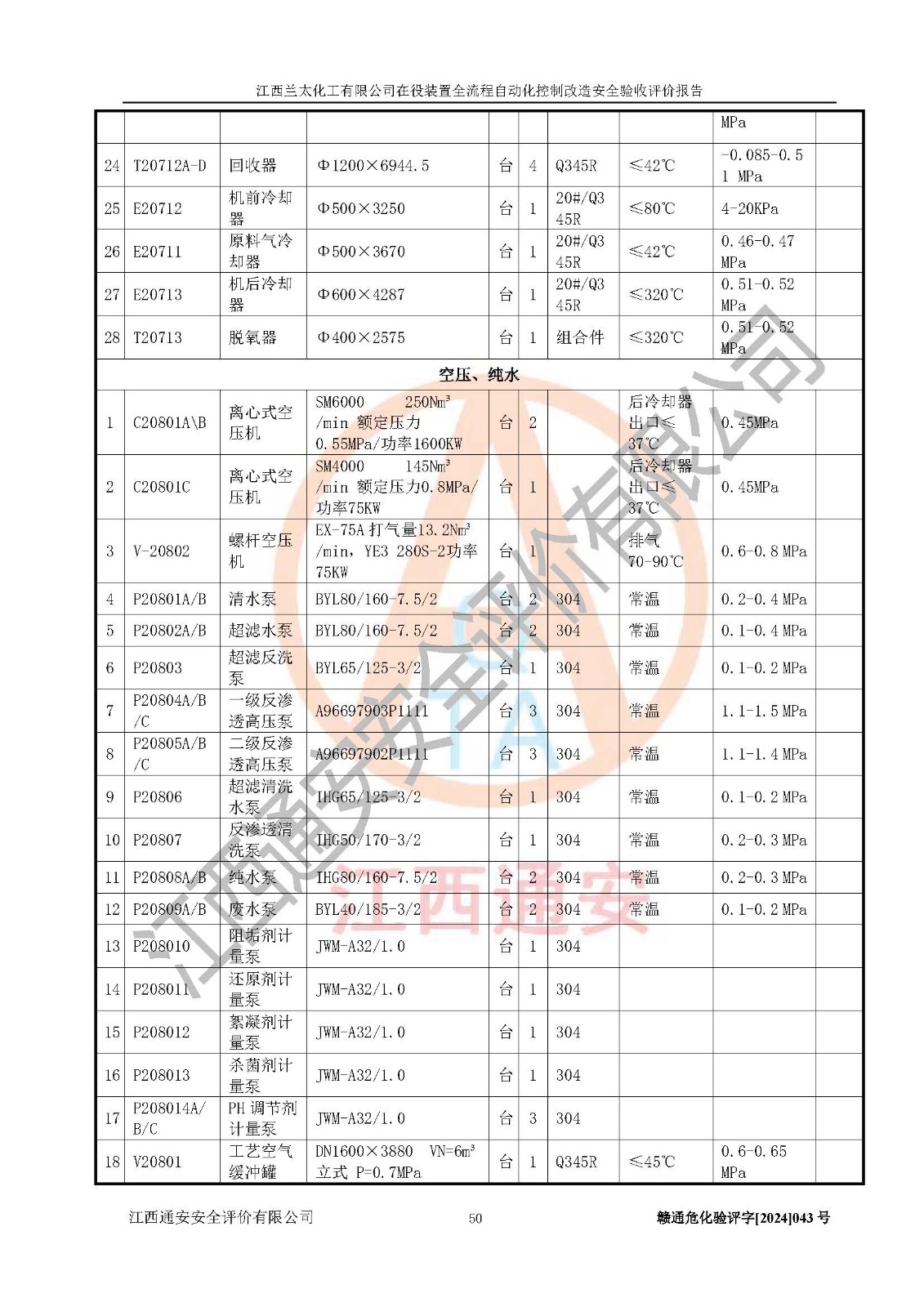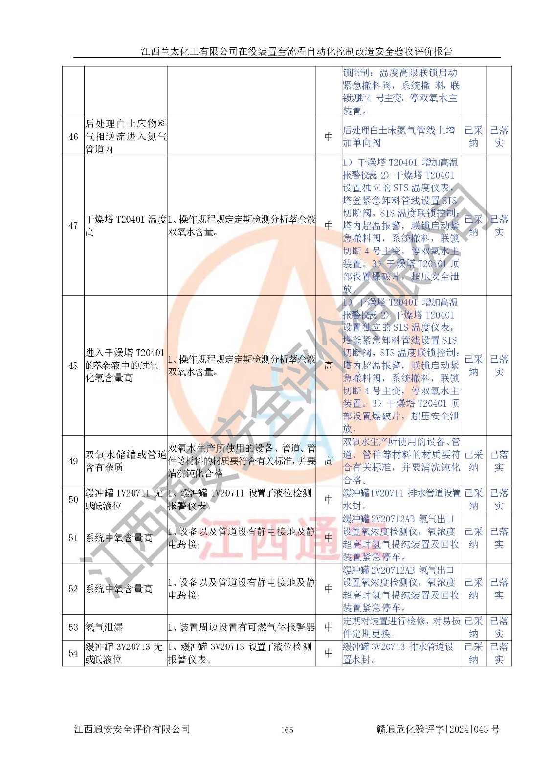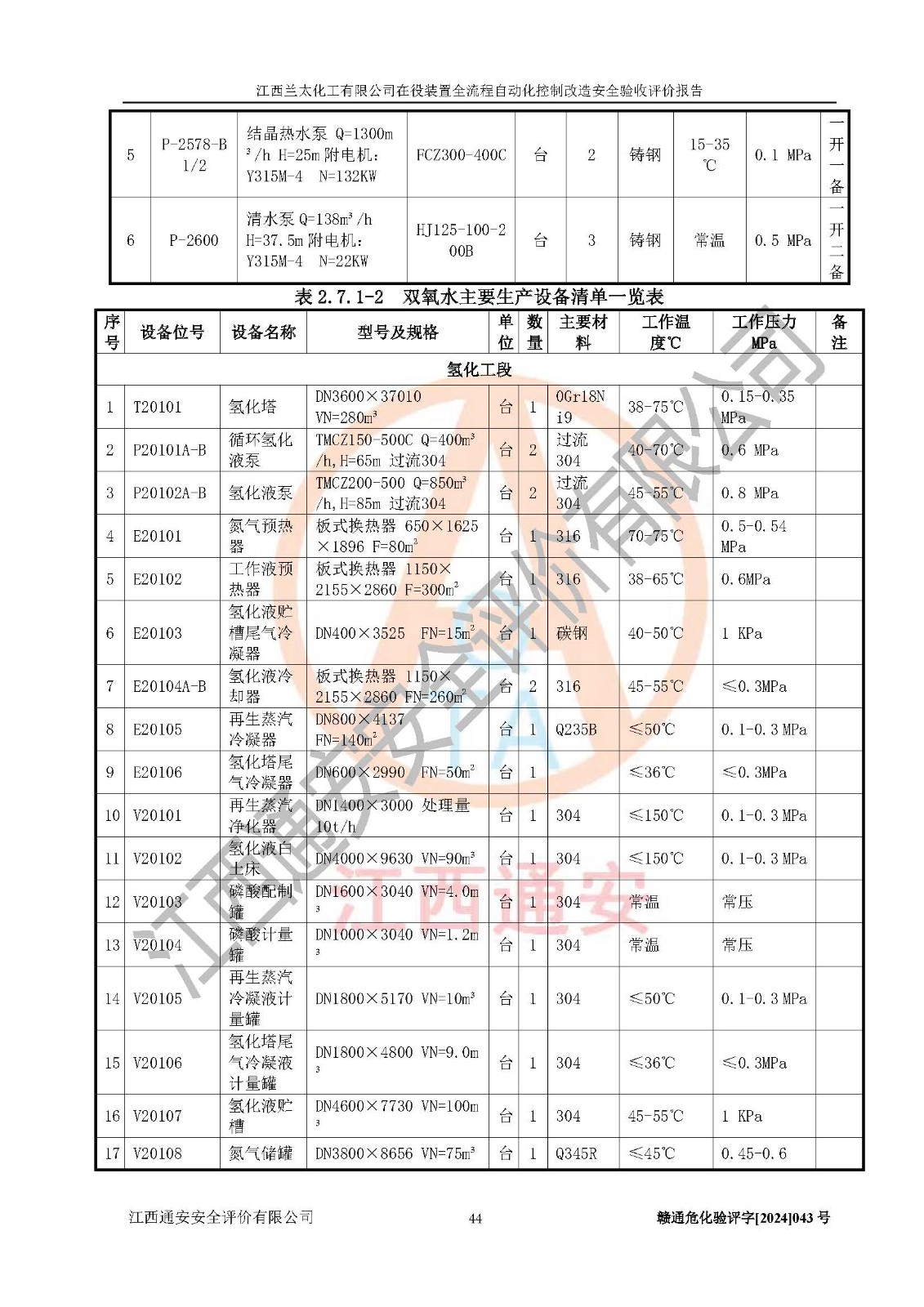 江西兰太化工有限公司于2008年5月成立,公司位于江西省吉安市新干县盐化工业城北区,公司法人**:李威。公司类型:有限责任公司(自然人投资或控股)。江西兰太化工有限公司是一家氯酸钠、双氧水产品的生产、销售(凭许可证**期限经营);化工产品(不含化学危险品及易制毒化学品)批发及零售;进出口经营权。(依法须经批准的项目经相关部门批准后方可开展经营活动)的有限责任公司。 江西兰太化工有限公司现有安全生产许可证**期至2024年8月30日,证书编号:(赣) WH 安许证字【2012】 0714 号,许可范围:氯酸钠 (50kt/a ) 、双氧水 (27.5%、 35% 、50% ,折合 27.5% 、150kt/a )。 项目生产过程中涉及的物料和成品中属于危险化学品的有:氯酸钠、双氧水、氯化氢、氢气、次氯酸钠、重铬酸钠、氯气(尾气产生微量)、氢氧化钠、盐酸、磷酸、氮气[压缩的]、芳烃(以**苯为主)、柴油(柴油发电机使用)等。项目涉及的盐酸属于第三类易制毒化学品。不涉及的重点监管的危险化学品。该工程涉及的氯气(尾气产生微量)属于剧毒化学品。该工程涉及的氯气(尾气产生微量)、重铬酸钠属于高毒物品。该工程涉及的重铬酸钠、氯酸钠、双氧水属于易制爆化学品。项目氯酸钠生产过程中的电解反应和双氧水生产过程的氢化反应、过氧化反应均为重点监管的危险化工工艺。公司201罐区构成三级危险化学品重大危险源,202氯酸钠危险化学品仓库、205氯酸钠危险化学品仓库、206氯酸钠危险化学品仓库分别构成四级危险化学品重大危险源。 |
