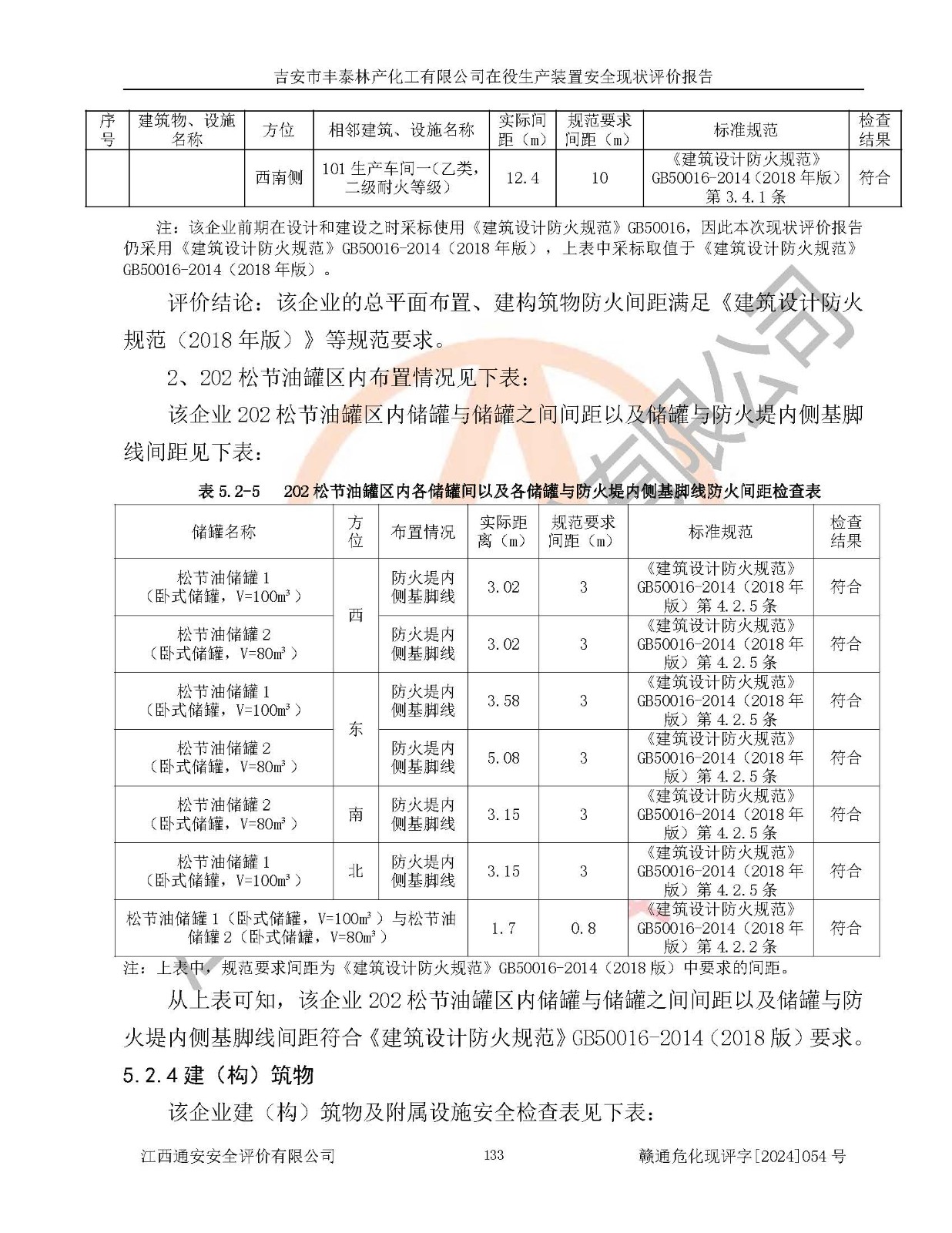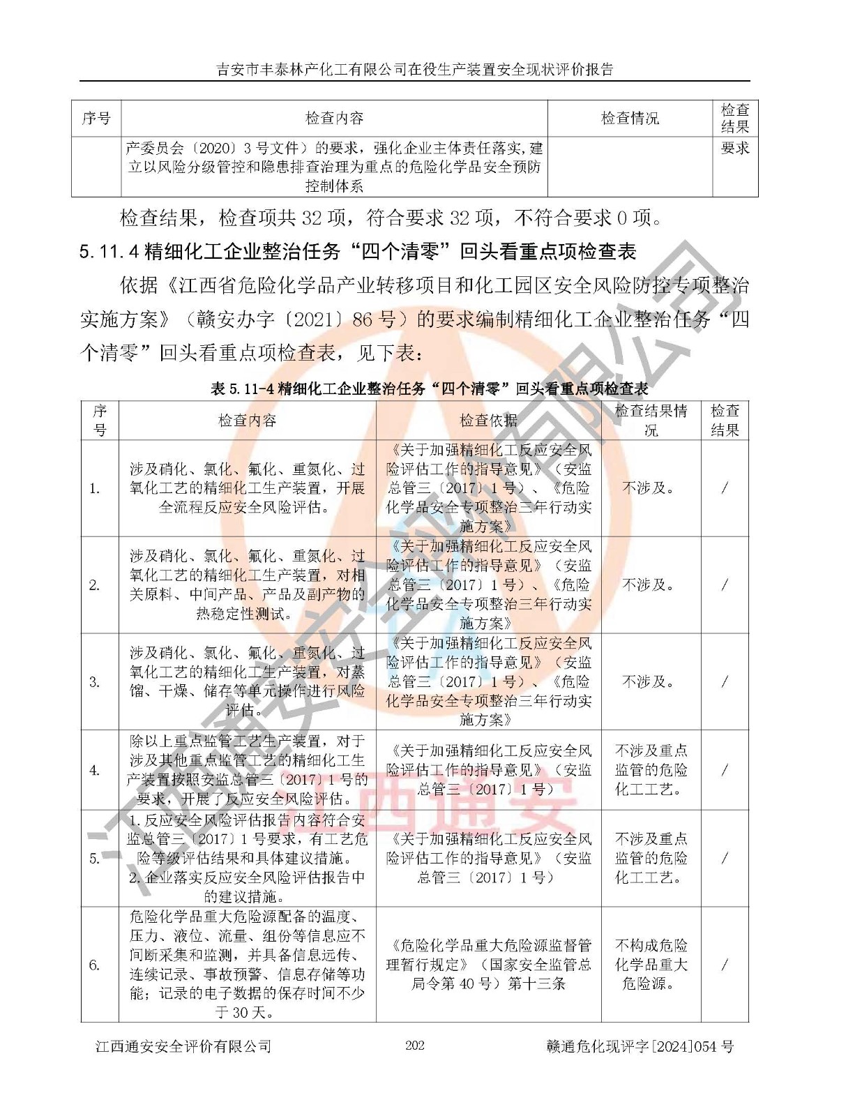 评价结论 | 评价结论:本报告认为,吉安市丰泰林产化工有限公司在役生产装置现场情况与设计图纸一致,有关从业人员资格符合《江西省危险化学品安全专项整治三年行动实施方案》要求,安全设施及安全管理符合**及有关部门关于安全生产法律法规、标准的要求,安全设施正常投用且运行**,安全风险是可以控制的,其风险程度是可以接受的,安全现状符合安全生产条件,能够满足安全生产的要求。 | |||