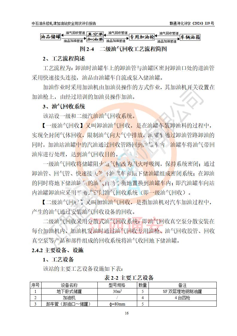 项目简介 | 中国石油天然气股份有限公司江西九江永修县虬津加油站是一家专门从事成品油零售经营的股份有限公司分公司(上市、国有控股),经营场所位于江西省九江市永修县虬津镇105国道西侧。现有从业人员5名,其中安全管理人员1人,加油站负责人杨全荣。 该加油站占地面积4000.74m2,站区内设置有4台四枪税控燃油加油机及配套的工艺管线,设有SF双层储罐5台,其中30m3的92#汽油储罐2台、30m3的95#汽油储罐1台、30m3的0#柴油储罐2台,油品储罐总容积为150m3(折算成汽油为120m3),按现行《汽车加油加气加氢站技术标准》对加油站的等级划分原则,属二级加油站。 该站由九江市行政审批局换发《危险化学品经营许可证》(证号:赣九行审经(甲)字[2021]000068号),**期限2021年11月07日至2024年11月06日。 | |||