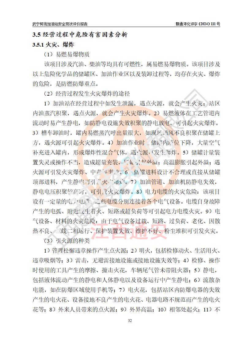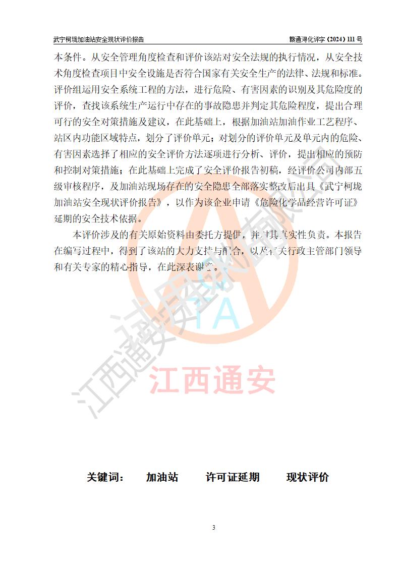 项目简介 | 武宁柯垅加油站是一家专门从事成品油零售经营的个体工商户,经营场所位于江西省九江市武宁县鲁溪镇柯垅。现有从业人员6名,其中安全管理人员1人,加油站负责人刘永辉。 该加油站占地面积约986.8m2,站区内设置有2台单枪和1台双枪程控燃油加油机及配套的工艺管线,设有SF双层储罐3台,其中30m3的92#汽油储罐1台、30m3的0#柴油储罐2台,油品储罐总容积为90m3(折算成汽油为60m3),按现行《汽车加油加气加氢站技术标准》对加油站的等级划分原则,属三级加油站。 该站由九江市行政审批局换发《危险化学品经营许可证》(证号:赣九行审经(甲)字[2021]000100号),**期限2021年12月31日至2024年12月30日。 | |||