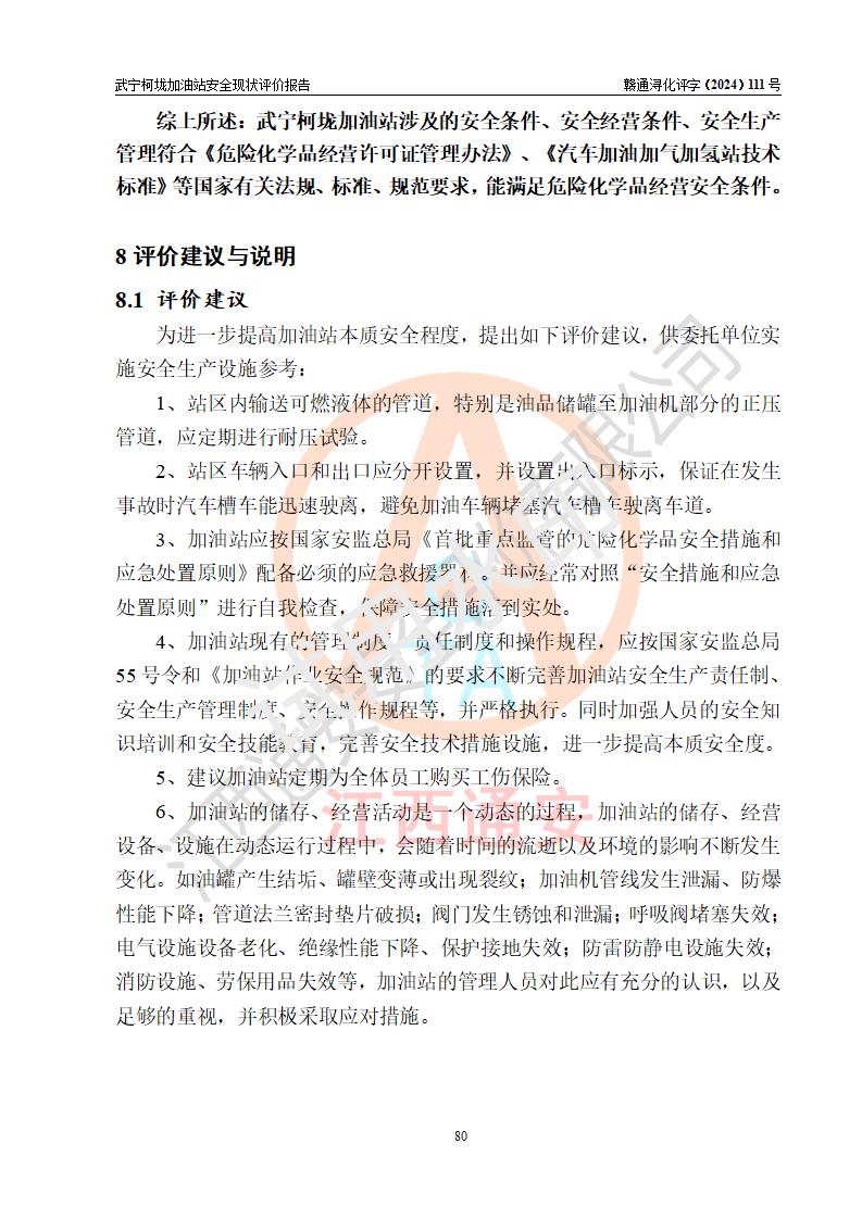 评价结论 | 武宁柯垅加油站涉及的安全条件、安全经营条件、安全生产管理符合《危险化学品经营许可证管理办法》、《汽车加油加气加氢站技术标准》等**有关法规、标准、规范要求,能满足危险化学品经营安全条件。 | |||