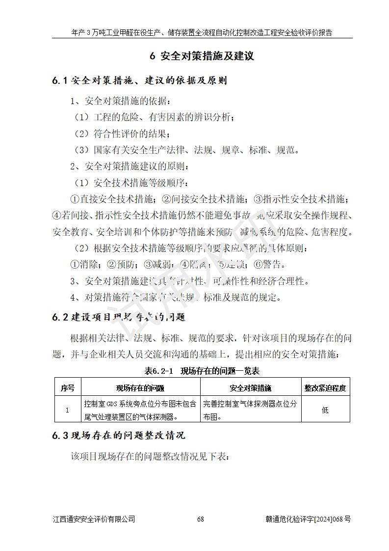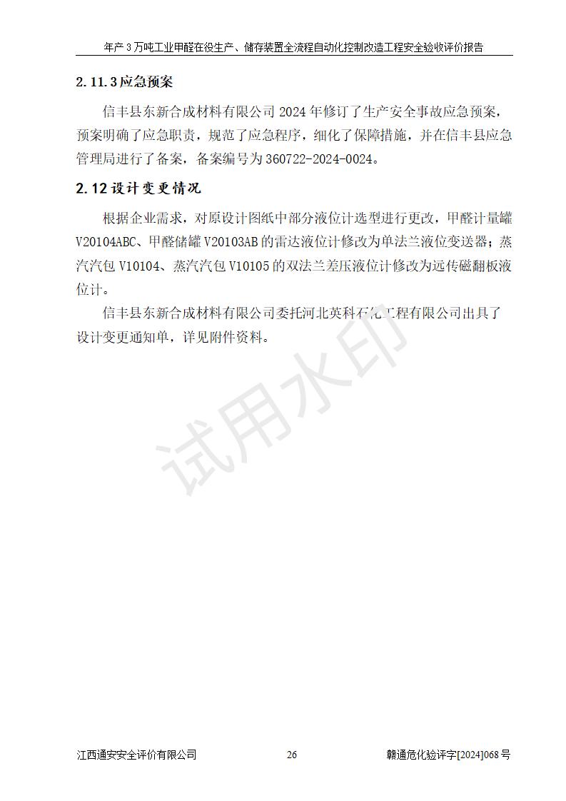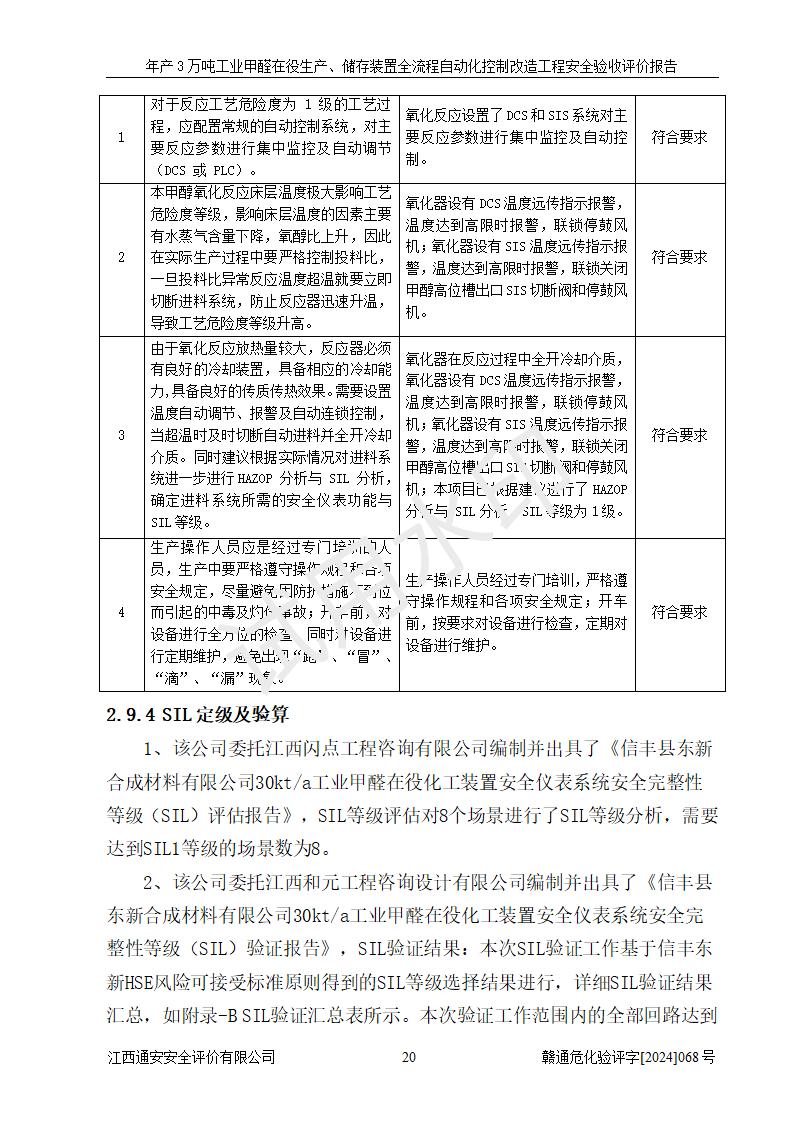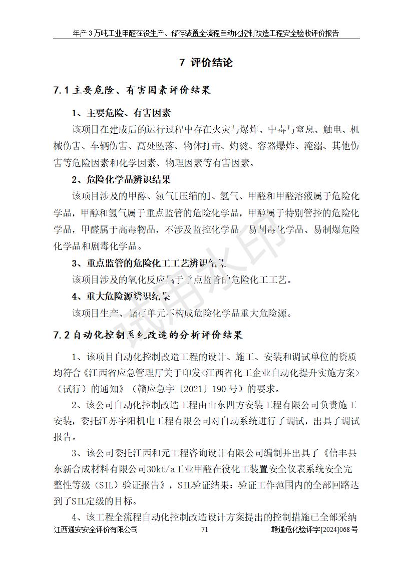 评价结论 | 信丰县东新合成材料有限公司年产3万吨工业甲醛在役生产、储存装置全流程自动化控制改造设计方案中提出的控制措施已得到落实,自动化控制系统设置情况与设计方案一致,满足《江西省应急管理厅关于印发<江西省化工企业自动化提升实施方案>(试行)的通知》(赣应急字〔2021〕190号)的要求,具备自动化控制改造工程竣工验收条件。 | ||||||