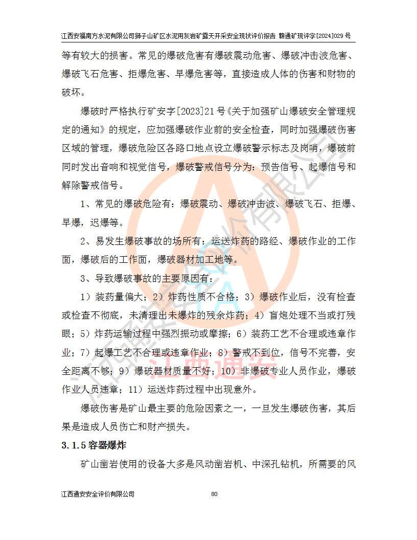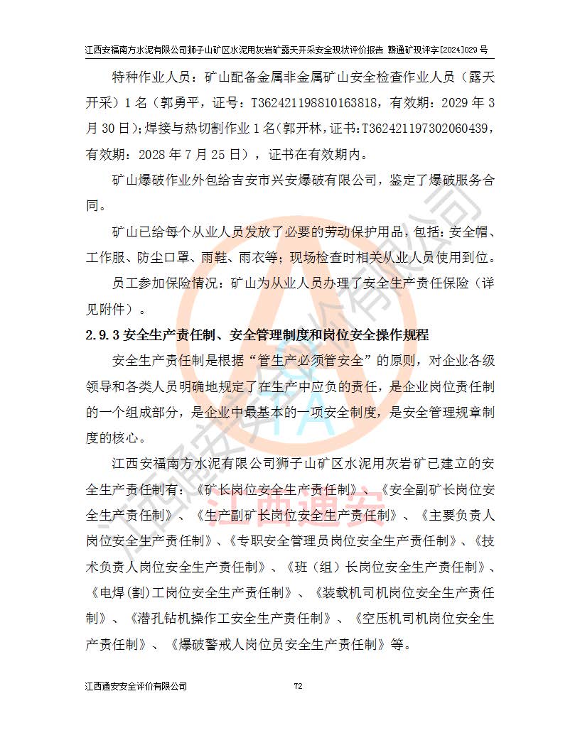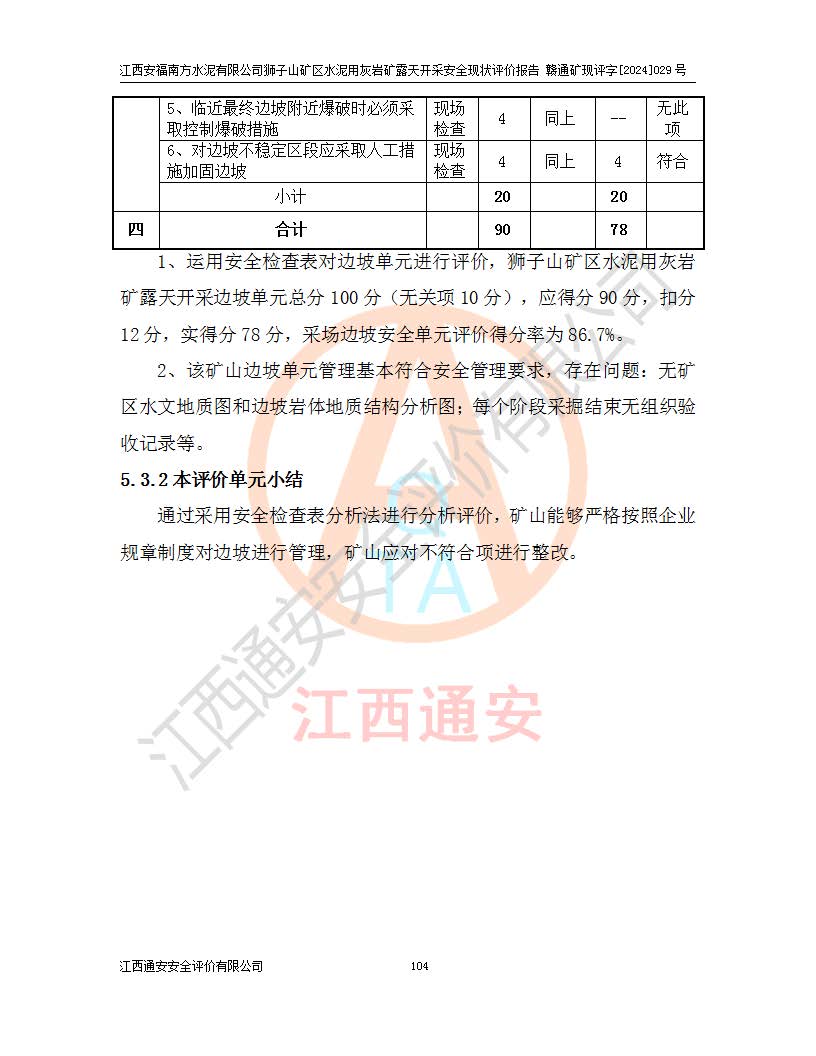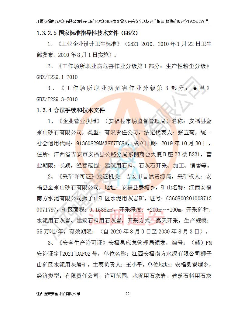 评价结论 | 综上所述,江西安福南方水泥有限公司狮子山矿区水泥用灰岩矿设备、设施和场所符合**安全生产有关法律、法规、标准及规范的要求。安全设施符合《安福县金来山砂石有限公司江西安福南方水泥有限公司狮子山矿区水泥用灰岩矿露天开采建设项目安全设施设计》及《设计变更说明》和相关标准、规范的要求,江西安福南方水泥有限公司狮子山矿区水泥用灰岩矿露天开采符合**规定的安全生产条件。 | |||