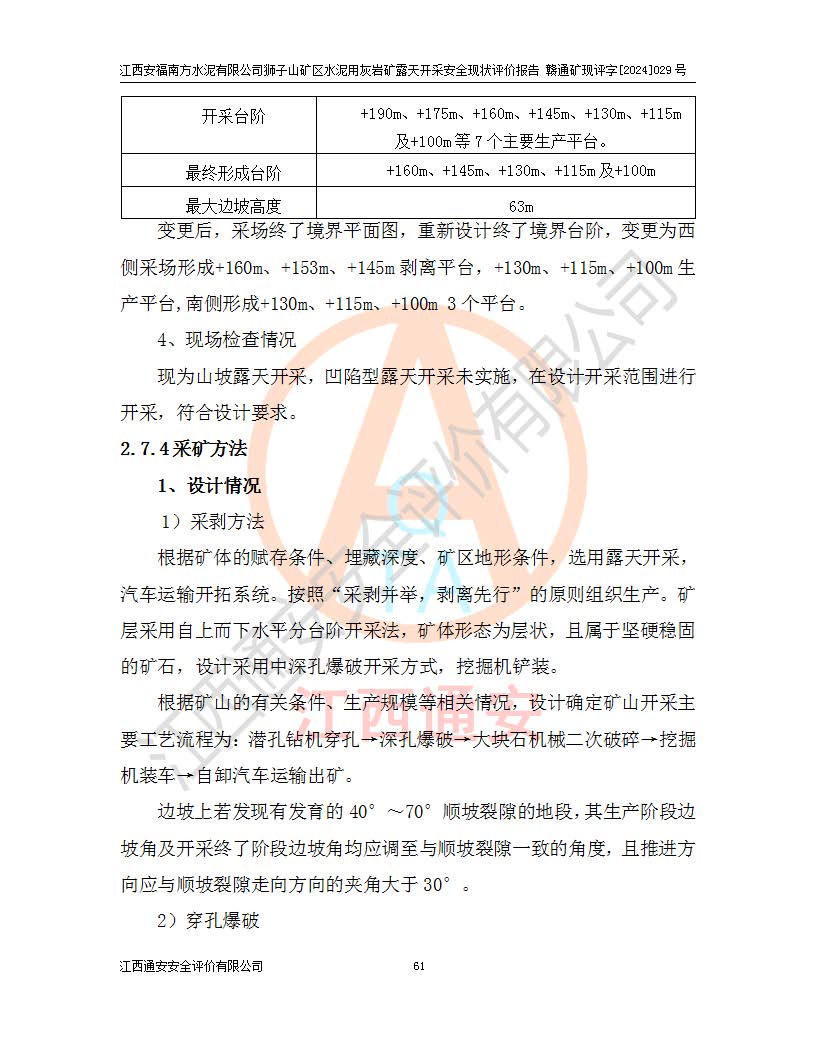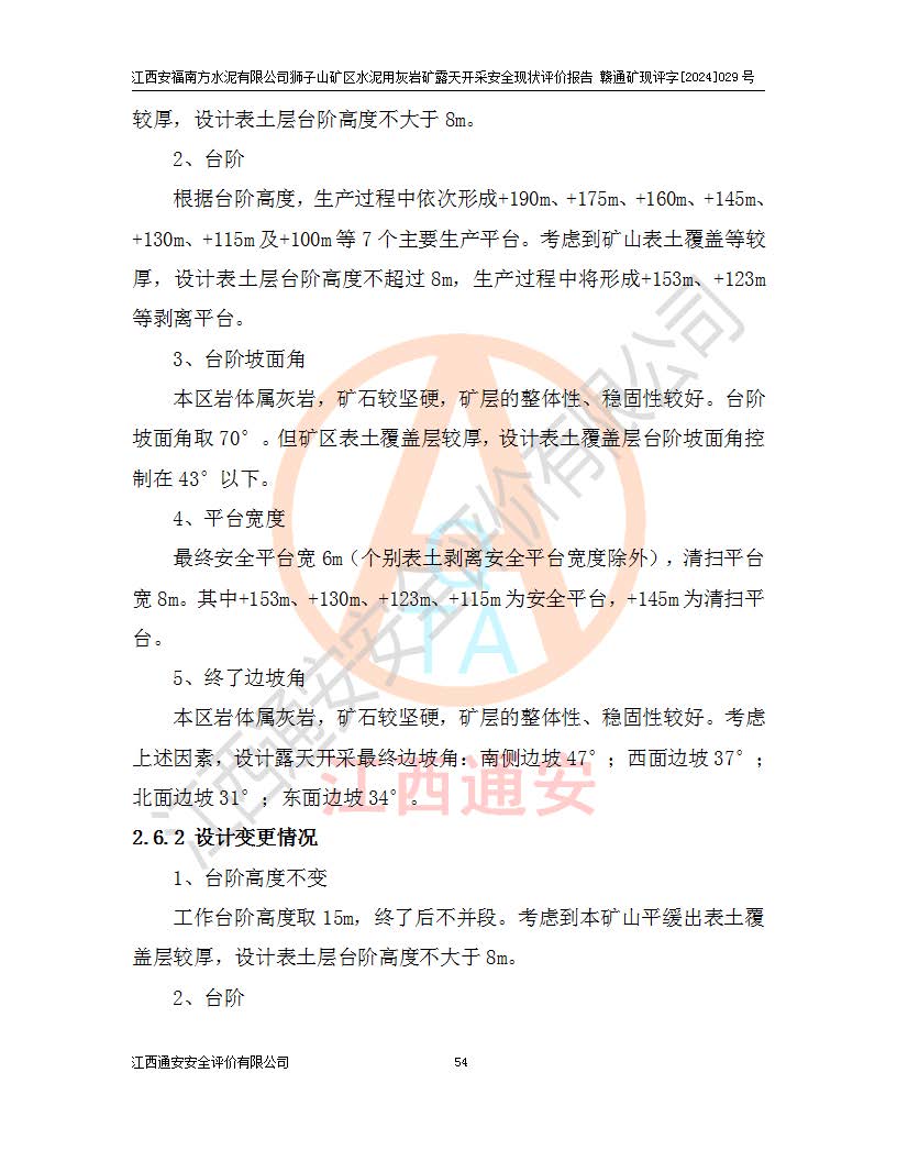 项目简介 | 江西安福南方水泥有限公司安福县狮子山水泥用石灰岩矿采矿权人为安福县金来山砂石有限公司。江西安福南方水泥有限公司安福县狮子山水泥用石灰岩矿矿区位于安福县县城165°方向直距约8km处,行政区划分所在地隶属安福县寮塘乡管辖。安福县金来山砂石有限公司成立于2019年10月,安福县市场监督管理局为其颁发《营业执照》。企业性质为有限责任公司,法定**人为张五苟。 该矿山2008年之前由安福县齐峰水泥有限责任公司通过“招拍挂”形式获得,2008年矿山法人变更为安福县南方水泥有限公司,2020年5月矿山采矿权人变更为安福县金来山砂石有限公司。安福县金来山砂石有限公司注册地在江西省吉安市安福县公路分局东侧商会大厦B座23楼B231。 2020年7月,安福县金来山砂石有限公司申请变更采矿标高,将开采标高+200m~+110m变更为+200m~+100m,吉安市自然资源局于2020年7月29日重新预划定矿区范围,保留期为两年。2020年8月江西省地质矿产勘查开发局九0二地质大队提交了《江西省安福县狮子山矿区水泥用灰岩矿资源储量核实报告》,根据资源储量核实结果,安福县金来山砂石有限公司于2020年11月申报了缩界,吉安市自然资源局作了批复,文号为吉市自然资采划字[2020]28号,缩界后,矿区范围由7个拐点圈定,矿区面积0.1588km2。2020年11月,该公司委托江西省地质矿产勘查开发局九0二地质大队编制了《江西省安福县狮子山矿区水泥用灰岩矿矿产资源开发利用、地质环境保护与土地复垦方案》及相关技术图纸;2020年4月由江西通安安全评价有限公司编制并提交了《安福县金来山砂石有限公司安福县狮子山水泥用灰岩矿露天开采建设项目安全预评价报告》。 2021年7月,企业委托湖南联盛勘察设计有限公司编制了《江西安福南方水泥有限公司狮子山矿区水泥用灰岩矿露天开采建设项目安全设施设计》。安福县应急管理局组织专家对报告进行了审查,报告通过了评审并获得了批复(安应急字[2021]45号)。 江西安福南方水泥有限公司安福县狮子山矿区水泥用灰岩矿露天开采采用公路开拓,汽车运输,按自上而下分台阶开采,设计台阶**15m,台阶坡面角70°,首采平台为+175m,安全平台6m,清扫平台8m,生产规模55万吨/年。 2021年11月,江西安福南方水泥有限公司安福县狮子山矿区水泥用灰岩矿通过验收,2021年11月26日,矿山取得了安福县应急管理局颁发的安全生产许可证,编号:(赣)FM安许证字[2021]DAF02号,**期:2021年11月26日至2024年11月25日。 安福县金来山砂石有限公司根据《中华人民共和国安全生产法》、《安全生产许可证条例》等有关法律、法规、部门规章的规定,严格按照《安全设施设计》进行开采生产,在开采过程中,一是由于矿山表土覆盖层较厚,且受矿山周边公益林征地及地形的限制,原设计的排土未启用,采场西侧剥离平台未能剥离到位,现西侧平台*高标高约+160m。压覆了部分矿量,导致西侧的开采境界未到边;二是在采场南侧由于地形变化及开采变化,现开采标高约+135m,原设计*高终了平台+153m,采场南侧的终了平台**与原设计的终了平台**不一致,矿山采场终了平台等安全设施与《安全设施设计》不相符,为**安全设施符合性,湖南联盛勘察设计有限公司就该矿山开采平台及终了平台等有关情况进行变更。 2024年10月13日湖南联盛勘察设计有限公司就该矿山以上情况进行变更,即根据采场剥离情况及现状地形变化,变更采场终了境界平面图,重新设计终了境界台阶,变更为西侧采场形成+160m、+153m、+145m剥离平台,+130m、+115m、+100m生产平台,南侧形成+130m、+115m、+100m3个平台。变更设计露天开采*终边坡角:南侧边坡42°;西面边坡31°;北面边坡31°;东面边坡22°。根据**矿山安全监察局关于印发《非煤矿山建设项目安全设施重大变更范围》的通知(矿安〔2023〕147号),此《变更说明》不属于重大变更范围,为一般变更。 2024年11月江西通安安全评价有限公司编制了《安福县金来山砂石有限公司江西安福南方水泥有限公司狮子山矿区水泥用灰岩矿边坡稳定性分析评估报告》,结论是:安福县金来山砂石有限公司江西安福南方水泥有限公司狮子山矿区水泥用灰岩矿边坡工程安全等级为Ⅲ级,处于安全、稳定状态,属于正常级、安全运行的露天采场,现状符合安全生产条件。 根据《安全生产法》、《矿山安全法》、《安全生产许可证条例》、《非煤矿矿山企业安全生产许可证实施办法》和原江西省安全生产监督管理局《关于做好非煤矿矿山企业安全生产许可证延期换证工作的通知》的要求,企业委托江西通安安全评价有限公司对狮子山矿区水泥用灰岩矿进行安全现状评价。 | |||