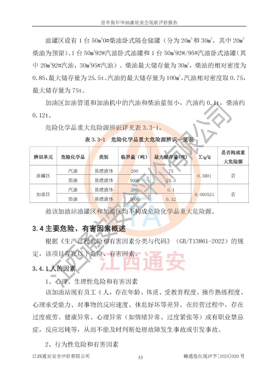 项目简介 | 信丰县年华加油站位于赣州市信丰县大阿镇大阿圩,投资人为肖斌,现有员工4人,其中安全管理人员1人。该加油站2022年03月28日取得了危险化学品经营许可证,登记编号为(赣)信行审危许字[2022]007号,经营方式为零售,许可范围为汽油、柴油,**期限为2022年05月15日至2025年05月14日。该加油站2022年04月02日取得了成品油零售经营批准证书,编号为油零售证书第虔0212号,**期限为2022年03月21日至2027年03月20日。加油站设有3台埋地油罐,分别为1台50m30#柴油卧式隔仓储罐(分为20m3和30m3,其中20m3柴油为预留)、1台50m392#汽油卧式油罐和1台50m392#/95#汽油卧式油罐(其中20m392#汽油,30m395#汽油),总储存能力为115m³(柴油折半),为二级加油站。加油区设有2台双枪加油机和1台四枪加油机。该加油站目前运行正常。 | |||