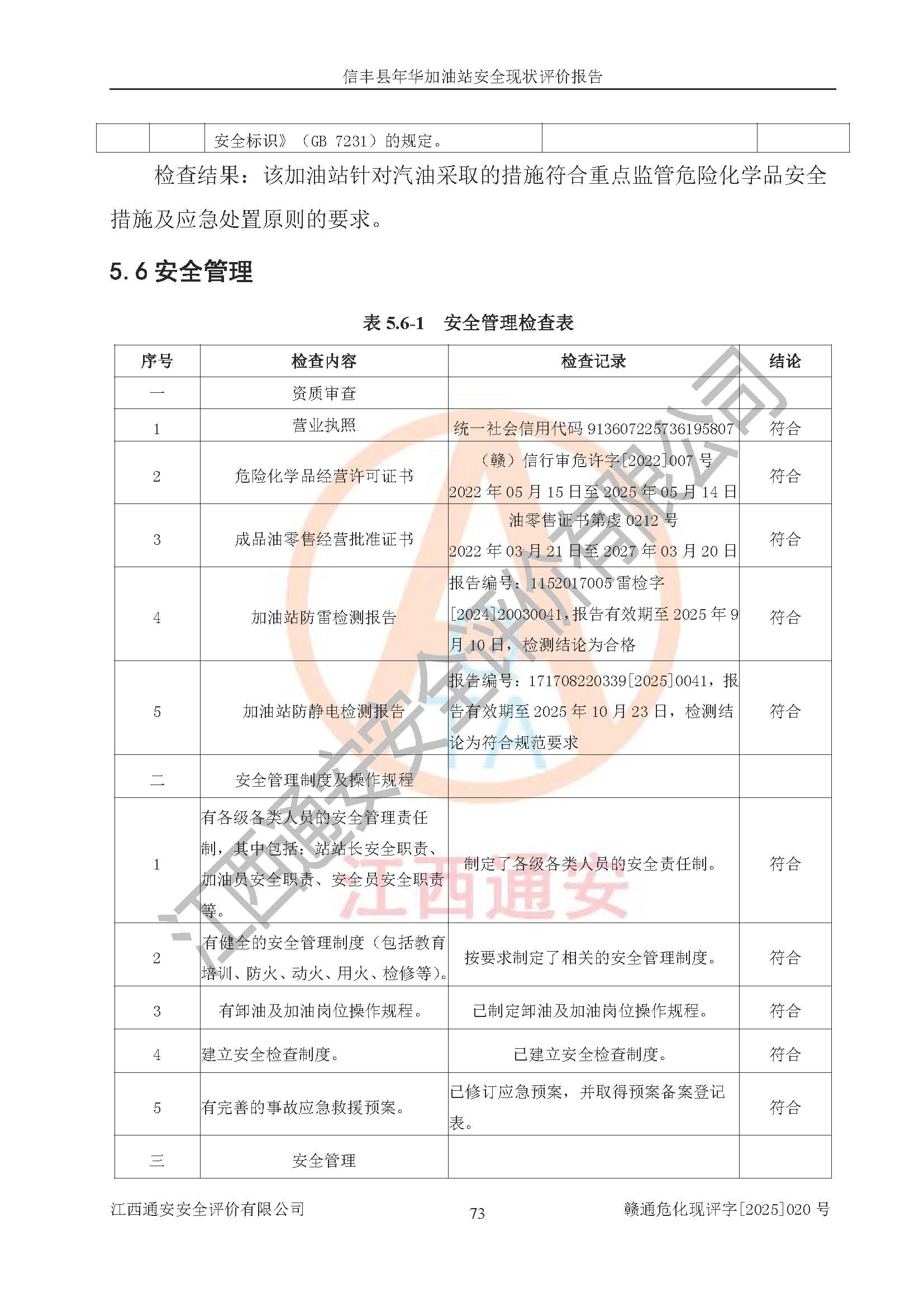 评价结论 | 信丰县年华加油站安全现状符合危险化学品经营安全条件。 | |||