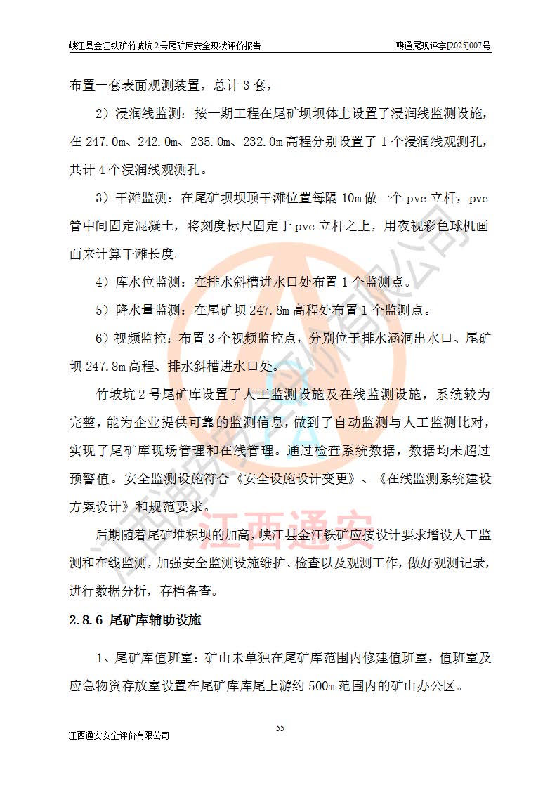 评价结论 | 峡江县金江铁矿竹坡坑2号尾矿库现状与《峡江县金江铁矿竹坡坑2号尾矿库加高扩容工程安全设施设计变更》一致,竹坡坑2号尾矿库为正常库,具备继续生产运行的安全生产条件。 | |||