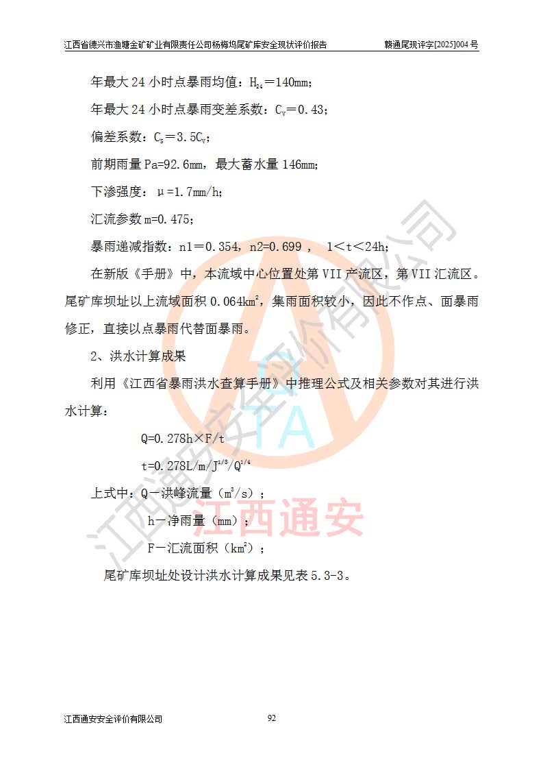 项目简介 | 江西省德兴市渔塘金矿矿业有限责任公司由原渔塘金矿、原石碑金矿和原黄柏洋金矿整合成立。江西省德兴市渔塘金矿矿业有限责任公司杨梅坞尾矿库位于德兴市84°方向直线距离约9.2**处,属德兴市花桥镇黄柏洋村。库区中心地理坐标:东经117°40′39″,北纬28°57′47″,有矿山公路通达杨梅坞尾矿库,交通较为方便。 杨梅坞尾矿库2017年7月由海湾工程有限公司设计,为山谷型尾矿库,总库容39.07×104m3,尾矿终期坝坝顶高程为120.0m,坝高37.53m。初期坝坝顶高程为105.0m,初期坝坝高22.53m,后期采用上游式放矿法,粘土堆积子坝,堆积坝高15.0m。根据《尾矿设施设计规范》(GB50863-2013),尾矿库为四等库,库内主要水工构筑物等级为4级,排洪设施采用200年一遇标准设计,排洪排水设施采用排水斜槽+连接井+排水涵洞的排洪排水方式。尾矿库年入库尾矿量5.88×104m3,可服务5.65年。尾矿库总汇水面积为0.064km2。尾矿库总占地面积约52亩。 杨梅坞尾矿库于2022年4月27日取得江西省应急管理厅颁发安全生产许可证,证书编号(赣)FM安许证字(2019)M1740号,有限期从2022年4月29日到2022年4月28日,依照《非煤矿矿山企业安全生产许可证延期换证工作》的通知,根据***《安全生产许可证条例》、《江西省安全生产条例》、《非煤矿山安全生产许可证实施办法》、《江西省非煤矿矿山企业安全生产许可证办法》规定及非煤矿山安全评价导则的要求,受江西省德兴市渔塘金矿矿业有限责任公司的委托,我公司承担杨梅坞尾矿库延期换证的安全现状评价工作。 | |||