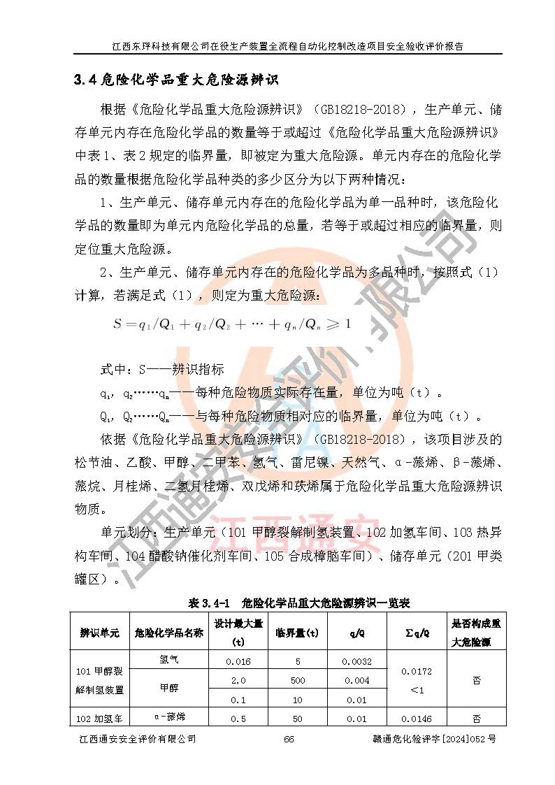 项目简介 | 江西东玶科技有限公司(以下简称东玶科技)位于江西省吉安市吉水县城西工业园区,法定**人为徐东,成立于2018年04月08日,注册资本叁仟贰佰叁拾万元整,经营范围为合成樟脑、α-蒎烯、β-蒎烯、二氢月桂烯(含月桂烯)、莰烯、双戊烯、氢气(中间产品)的制造加工(凭**批准证书经营);白乙酯、双萜烯等合成香料的制造加工等。 江西东玶科技有限公司2022年08月01日取得了《安全生产许可证》,许可证编号:(赣)WH安许证字[2022]1160号,许可范围为合成樟脑(2000t/a)、二氢月桂烯(1000t/a)、月桂烯(3200t/a)、莰烯(1000t/a)、双戊烯(810t/a)、双萜烯(1070t/a)、α-蒎烯(7500t/a)、β-蒎烯(3200t/a)、白乙酯(500t/a),**期:2022年08月01日至2025年07月31日。该公司现有员工50人,其中专职安全管理人员2人。 根据《江西省应急管理厅关于印发<江西省化工企业自动化提升实施方案>(试行)的通知》(赣应急字〔2021〕190号),东玶科技2022年10月委托山东鸿运工程设计有限公司对照《化工企业自动化提升要求》开展了评估,出具了《江西东玶科技有限公司全流程自动化控制诊断报告》(含隐患清单),并委托山东鸿运工程设计有限公司出具了《江西东玶科技有限公司在役生产装置全流程自动化控制改造设计方案》,吉安市应急管理局2024年6月13日组织专家对设计方案进行了技术评审,设计院对照专家组意见进行了修改完善。东玶科技委托山东鸿运工程设计有限公司出具了《江西东玶科技有限公司在役生产装置全流程自动化控制改造项目施工图》(2024年7月)。东玶科技2024年7月委托了苏华建设集团有限公司进行自动化改造设备仪表安装施工,并出具了安装调试报告。 江西东玶科技有限公司于2025年3月委托山东鸿运工程设计有限公司出具了《江西东玶科技有限公司在役生产装置及年产12000吨松节油深加工系列产品项目(二期工程)安全设施设计变更》。 江西东玶科技有限公司在役生产装置全流程自动化控制改造项目涉及的松节油、乙酸、液碱、甲醇、二甲苯、甲酸、氢气、雷尼镍、天然气,中间产品α-蒎烯、β-蒎烯和产品中双戊烯、莰烯属于危险化学品。经辨识,甲醇、氢气和天然气(燃料)属于重点监管的危险化学品,甲醇属于特别管控危险化学品,不涉及监控化学品、易制毒化学品、易制爆危险化学品、剧毒化学品和高毒物品,生产、储存单元不构成危险化学品重大危险源,不涉及重点监管的危险化工工艺。 | ||||||