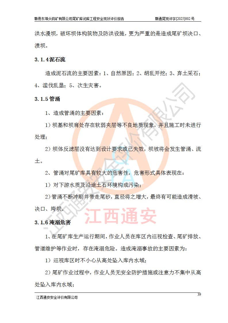 评价结论 | 赣县东埠头钨矿有限公司尾矿库未按回采设计要求进行回采;尾矿坝坝脚未设置排水棱体;尾矿坝稳定性不满足规范要求;干滩长度不满足要求;排洪设施未进行结构质量检测,未设置人工监测设施,堆积坝外坡比陡于设计坡比,尾矿库未配备专职安全生产管理人员、特种作业人员及专业技术人员等。根据**矿山安全监察局矿安〔2022〕88号文《金属非金属矿山重大事故隐患判定标准》、**矿山安全监察局矿安〔2024〕41号文《金属非金属矿山重大事故隐患判定标准补充情形》,尾矿库存在重大事故隐患。赣县东埠头钨矿有限公司尾矿库应尽快完成所有闭库程序,闭库设计应按正常运行标准进行闭库整治设计,**尾矿库防洪能力和尾矿坝稳定性满足规程要求,维持尾矿库闭库后长期安全稳定。 | |||