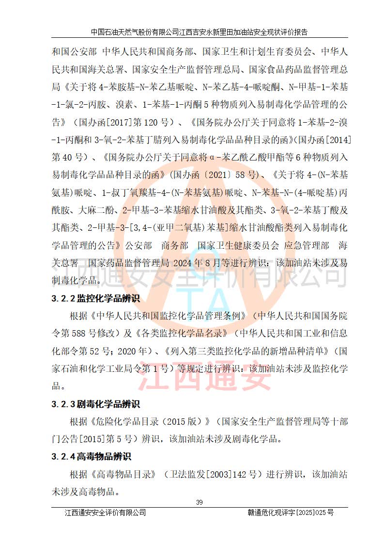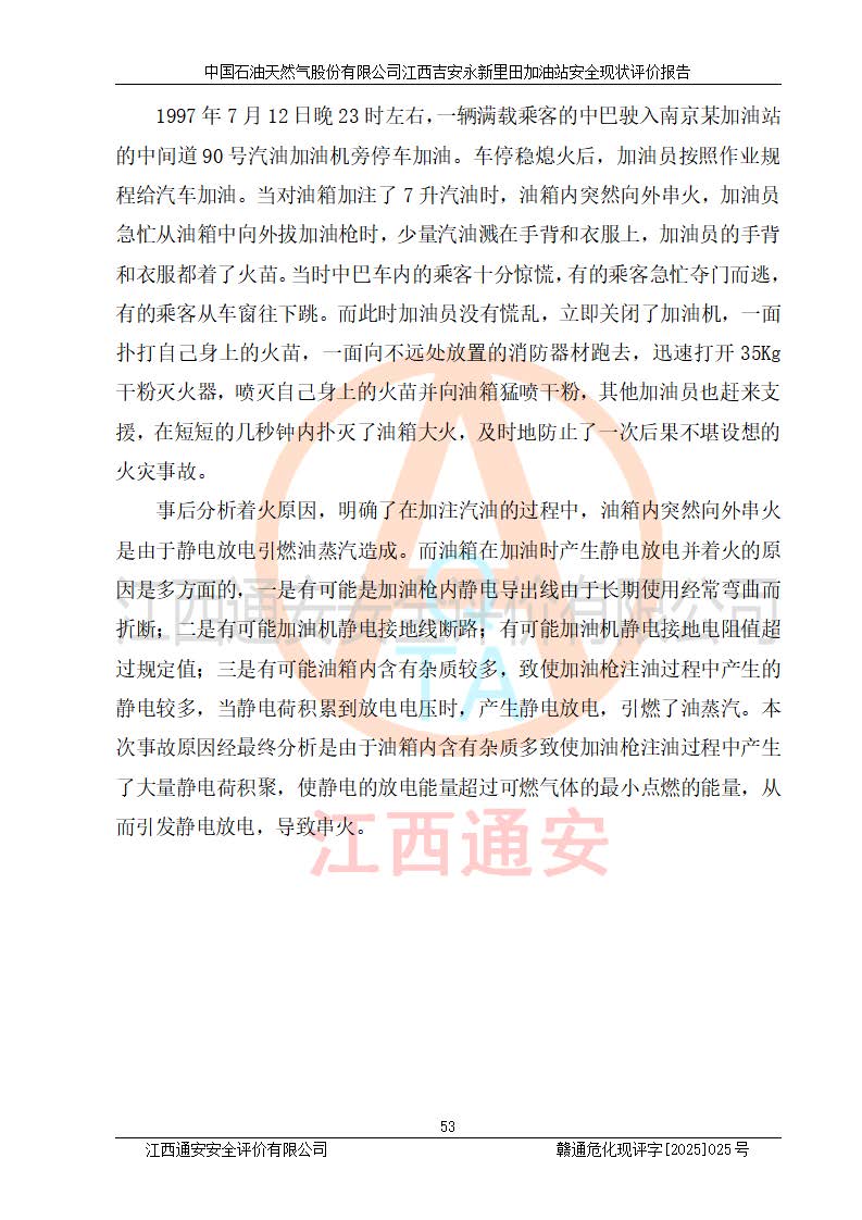 其它 | 在对该项目危险、有害因素辨识分析的基础上,运用安全检查表、预作业条件危险性分析法、危险度评价、重大事故后果分析结果等评价方法对该项目进行了分析评价,评价结果如下: 1、该项目位于江西省吉安市永新县里田镇高速路口旁,符合当地规划,与周边环境的距离符合有关标准、规范的要求。 2、总图布置分区明确,布局合理,各建构筑物的防火间距满足规范要求。 3、该项目无**明令淘汰的工艺,设备、设施与工艺条件、内部介质相适应,特种设备及设施较齐全,按规定设置防雷、防静电接地,爆炸危险环境加油机按要求采用防爆型,符合相关标准规范要求。 5、企业设置了安全生产管理机构,配备了专职安全生产管理人员,建立了安全生产责任制和安全生产管理制度,编制了岗位操作规程,编制了生产安全事故应急预案,人员经过相应的培训,企业的安全生产管理正常。 6、作业条件危险性评价结果:在选定的评价单元中,作业危险程度均为“一般危险,需要注意”,作业条件相对安全。 7、危险度评价结果:汽油储罐的危险程度为**危险。油罐采用双层罐埋地设置,按要求设置了通气管,并装设了阻火器;设置了液位监测报警系统和紧急切断系统,埋地加油管道设置双层管道及双层管道渗漏检测系统,可以满足安全生产条件要求。 评价结论: 中国石油天然气股份有限公司江西吉安永新里田加油站符合《汽车加油加气加氢站技术标准》GB50156-2021等标准规范的要求,安全风险可控,满足危险化学品经营的安全条件。 | ||||