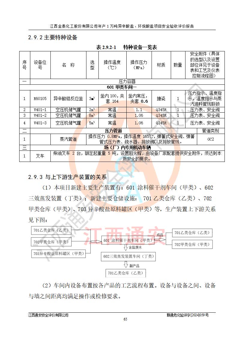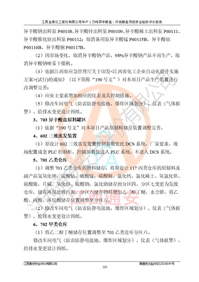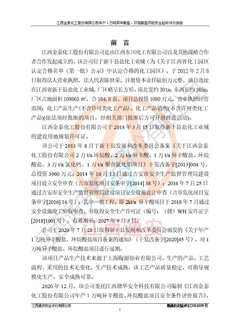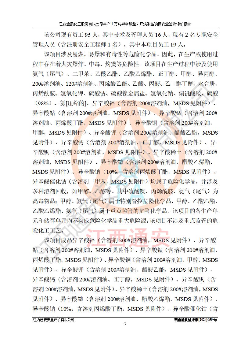 评价报告名称 | 江西金泰化工股份有限公司年产1万吨异辛酸盐、环烷酸盐项目安全验收评价报告 | |||