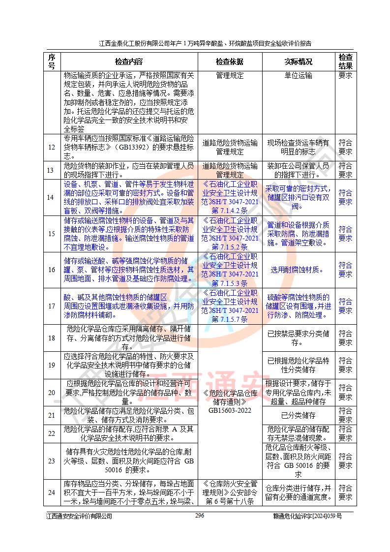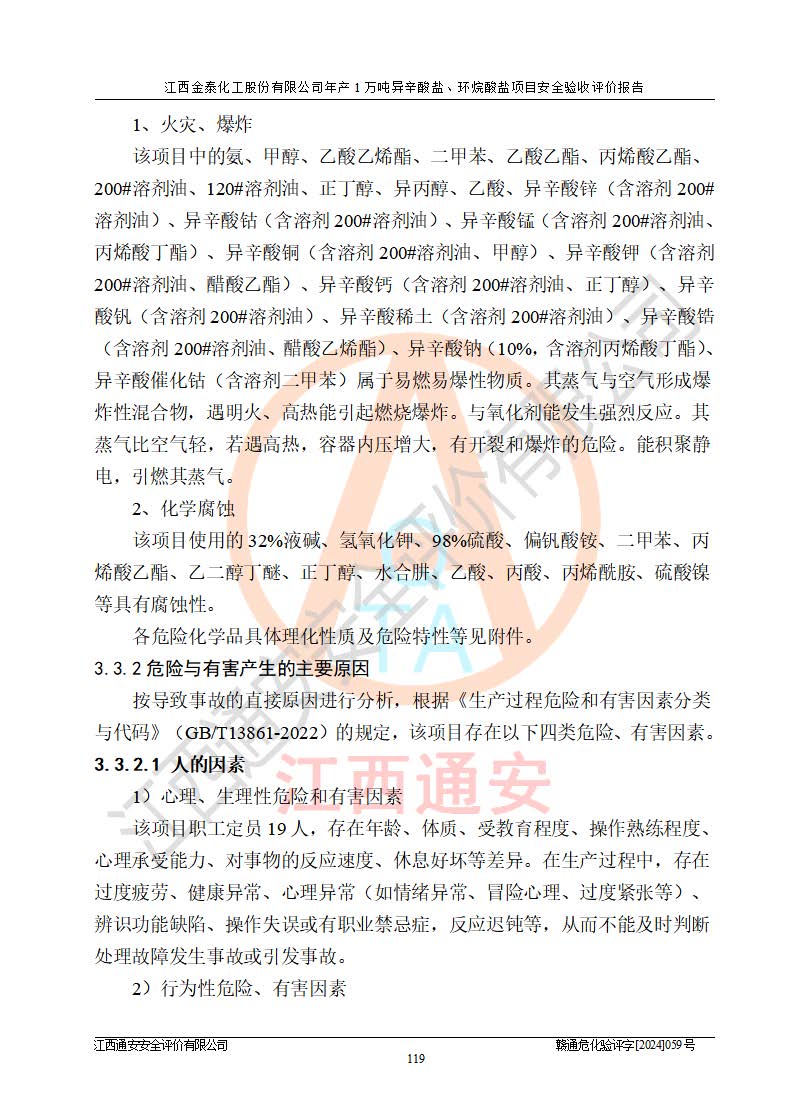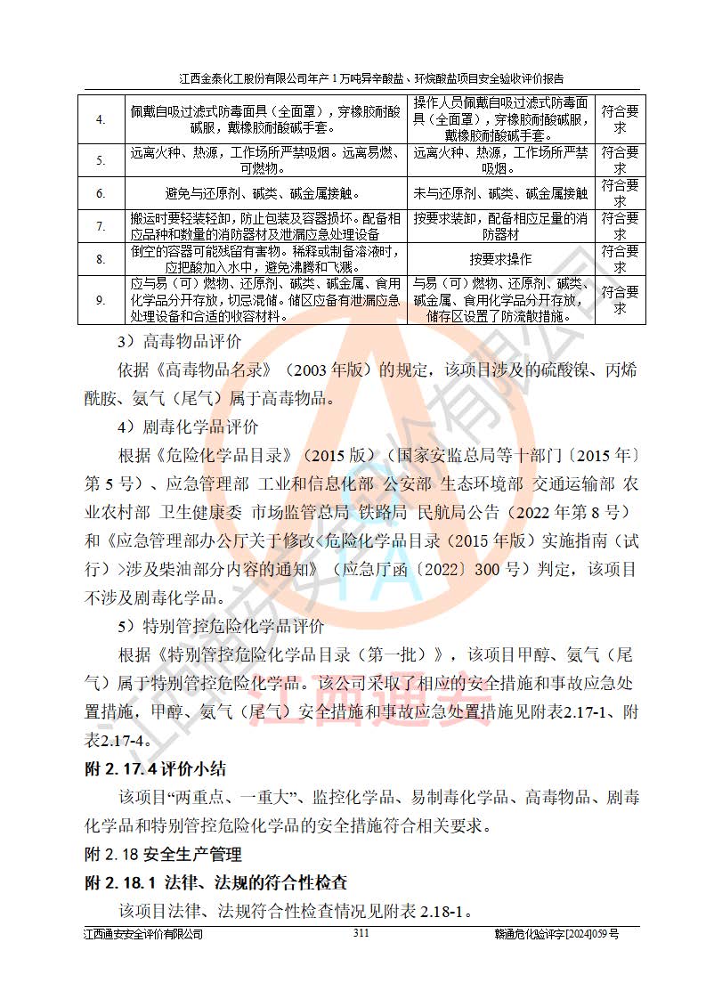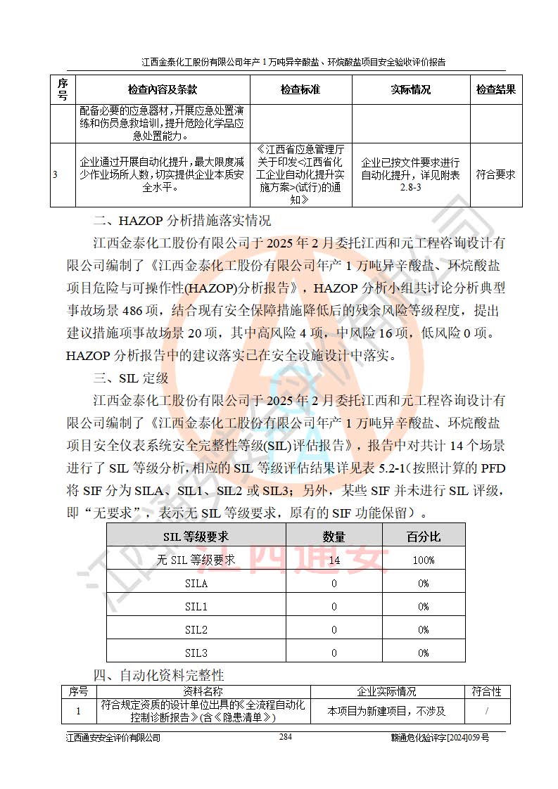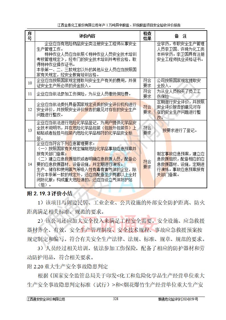 评价结论 | 江西金泰化工股份有限公司年产1万吨异辛酸盐、环烷酸盐项目的生产装置现场情况与设计图纸一致,有关从业人员资质符合《江西省危险化学品安全专项整治三年行动实施方案》要求,自动化控制满足《江西省应急管理厅关于印发<江西省化工企业自动化提升实施方案>(试行)的通知》(赣应急字〔2021年〕190号)要求,安全设施及安全管理符合**及有关部门关于安全生产法律、法规、标准的要求,安全风险是受控制的,其风险程度是可以接受的,符合安全生产条件,能够满足安全生产的要求,具备安全设施“三同时”验收条件。 | |||