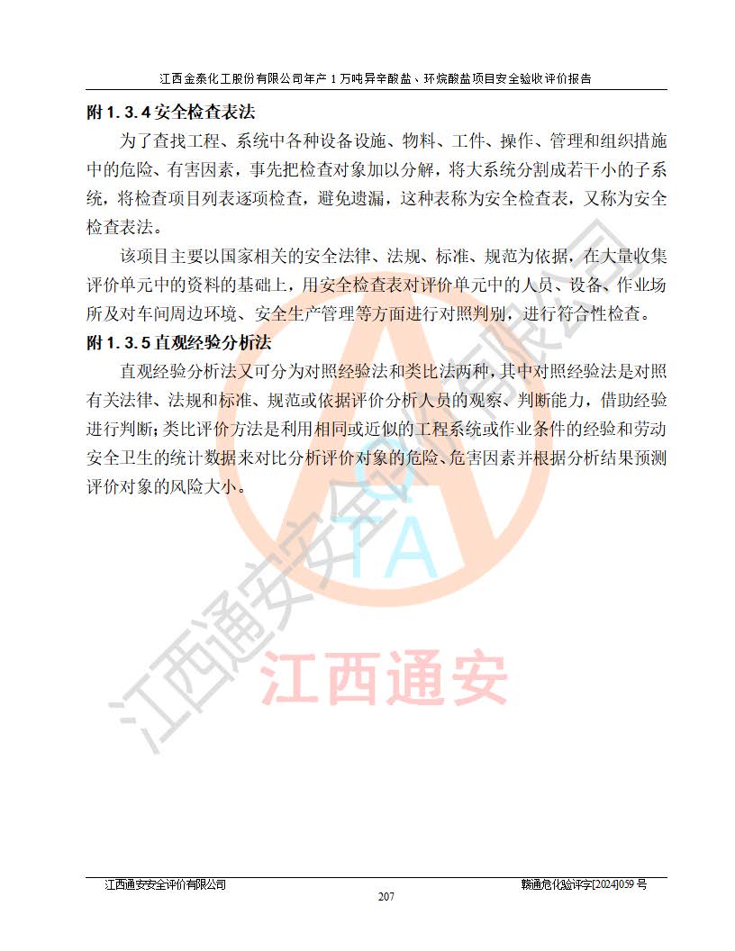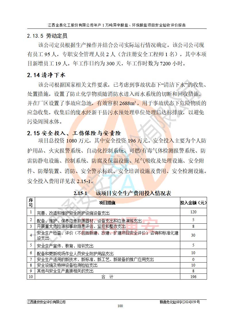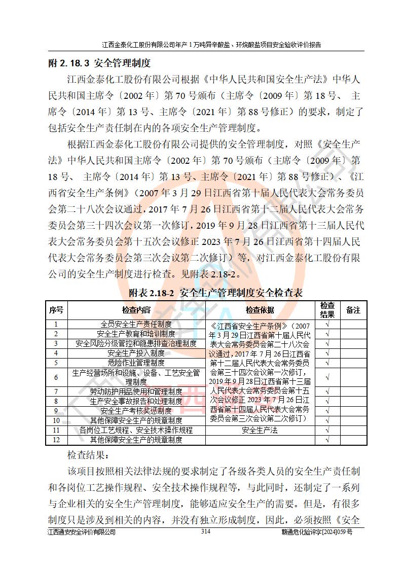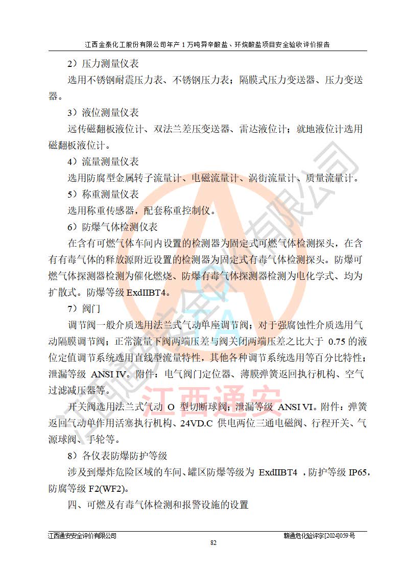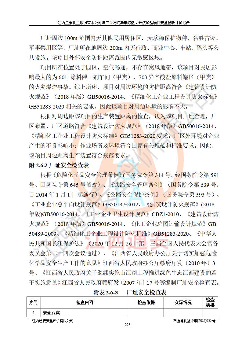 评价结论 | 江西金泰化工股份有限公司年产1万吨异辛酸盐、环烷酸盐项目的生产装置现场情况与设计图纸一致,有关从业人员资质符合《江西省危险化学品安全专项整治三年行动实施方案》要求,自动化控制满足《江西省应急管理厅关于印发<江西省化工企业自动化提升实施方案>(试行)的通知》(赣应急字〔2021年〕190号)要求,安全设施及安全管理符合**及有关部门关于安全生产法律、法规、标准的要求,安全风险是受控制的,其风险程度是可以接受的,符合安全生产条件,能够满足安全生产的要求,具备安全设施“三同时”验收条件。 | |||