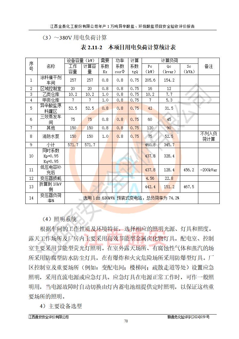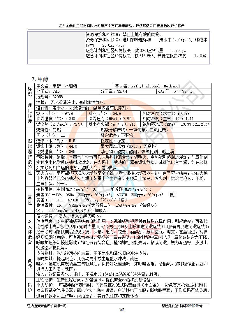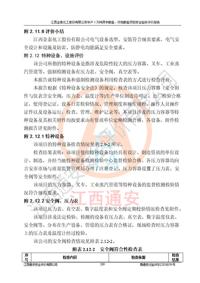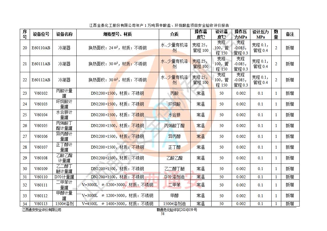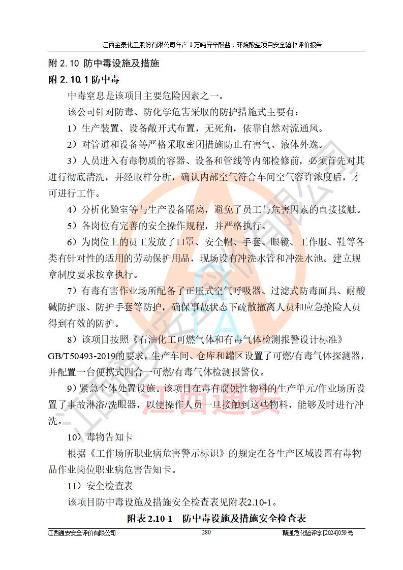 评价结论 | 江西金泰化工股份有限公司年产1万吨异辛酸盐、环烷酸盐项目的生产装置现场情况与设计图纸一致,有关从业人员资质符合《江西省危险化学品安全专项整治三年行动实施方案》要求,自动化控制满足《江西省应急管理厅关于印发<江西省化工企业自动化提升实施方案>(试行)的通知》(赣应急字〔2021年〕190号)要求,安全设施及安全管理符合**及有关部门关于安全生产法律、法规、标准的要求,安全风险是受控制的,其风险程度是可以接受的,符合安全生产条件,能够满足安全生产的要求,具备安全设施“三同时”验收条件。 | |||